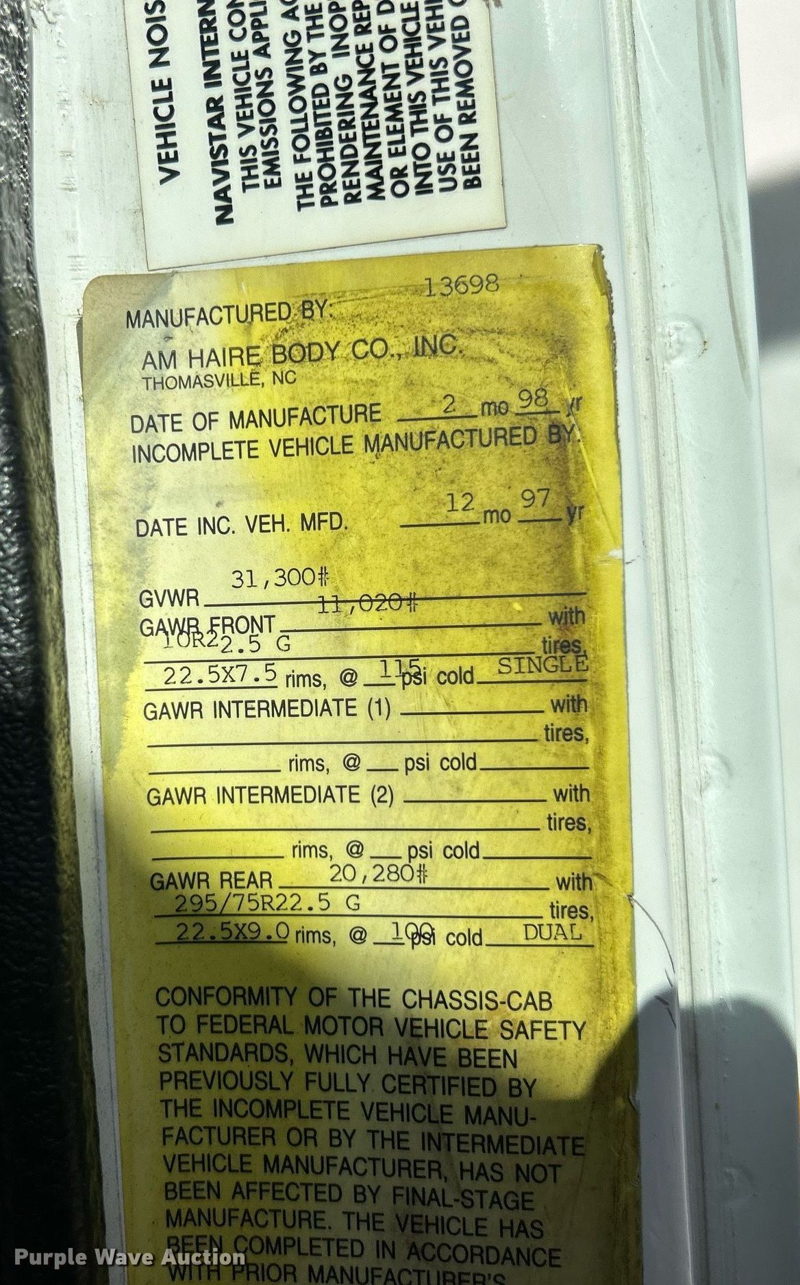 1998 International 4700 box truck. Miles: 142,200 on odometer, VIN: 1HTSCAAN3WH543422. Engine International Navistar DT466, Displacement: 7.6L, Cylinders: 6, Fuel type: Diesel. Transmission International 6 Plus, Manual, Speed: 7. Chassis Axles: Single, Suspension: Air, Brakes: Air, Wheelbase: 254". Interior AC, Heat, Power locks, Cruise control. Features Box bed Amh MTR31109P, Serial: 52198, 31' L x 93" W x 108" H Over cab length: 5' L, Regular box length: 26' L, Floor: Wood. Tires Size: 255/70R22.5. Notes Over the cab section of bed 5' L, Regular bed 26'. Missouri title. Title distribution may be delayed up to 14 days from verification of funds. Owensville, MO 65066