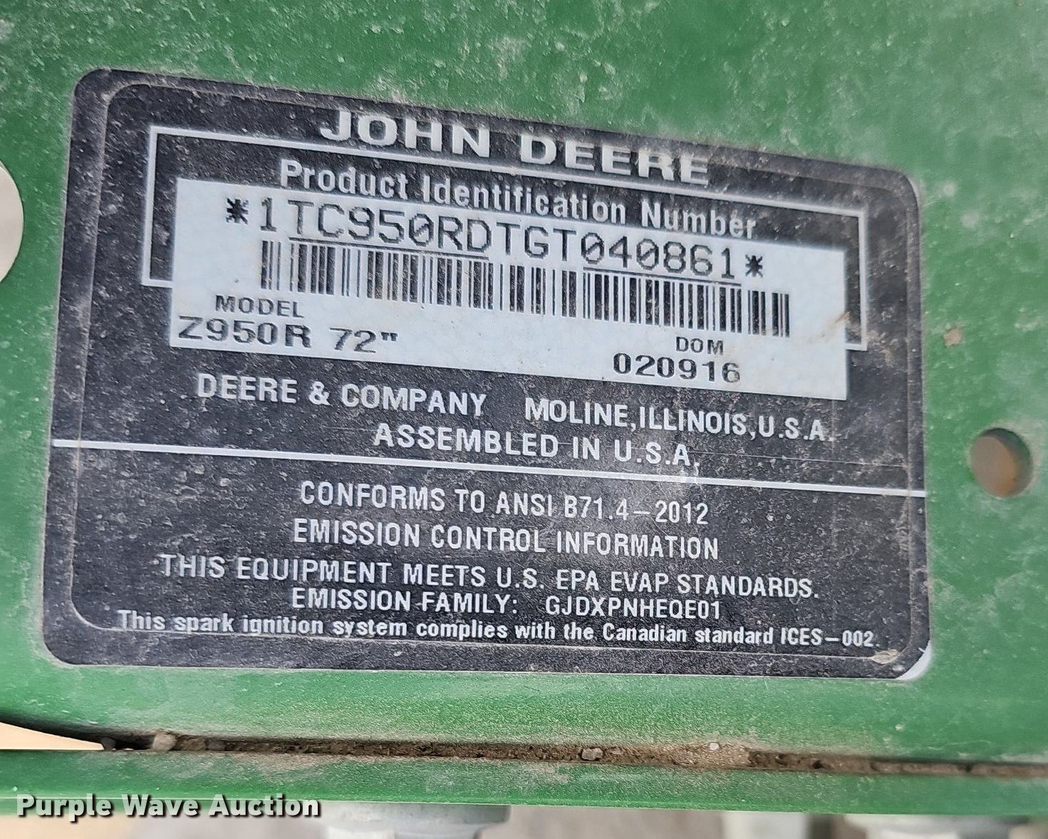 Purple Wave is selling a used Commercial Turf Mower in Kansas. This item is a 2016 John Deere Z950R ZTR lawn mower with the following: Hours: 443 on meter, Cutting width: 72", Serial: 1TC950RDTGT040861, Unit #: 479712
