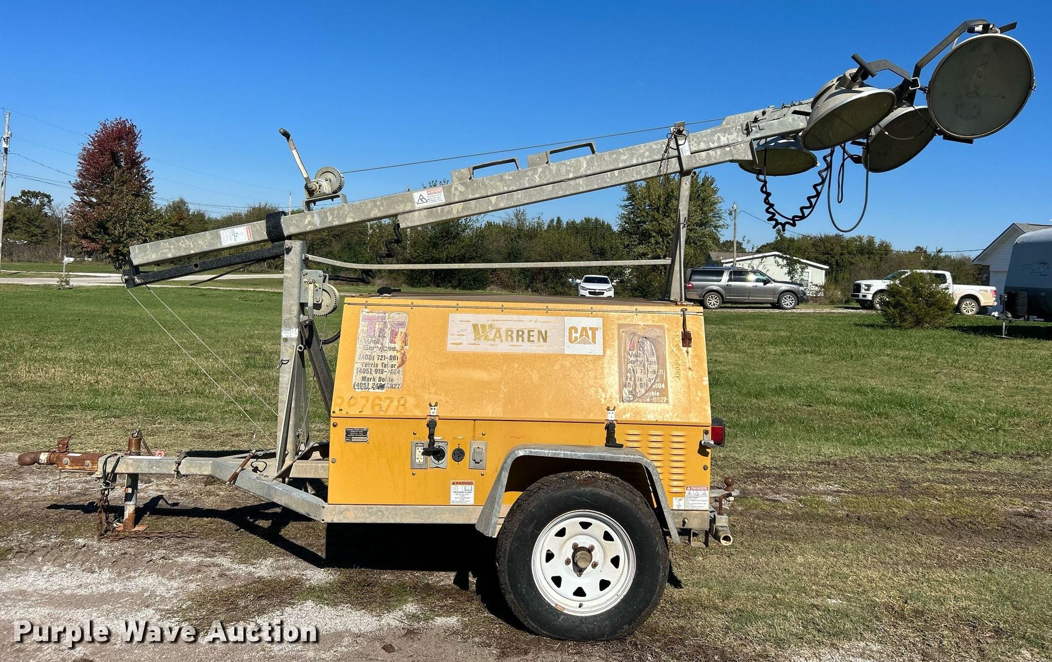 Warren Power Systems WCW204MH light plant. Hours: 26,092 on meter, Serial: 0080192954. Engine Caterpillar , Cylinders: 4, Fuel type: Diesel. Features Generator NewAge, kW: 25, Phase: Three, Electric start, Light plant Bulbs: 4, Tower height: 30', Hoist: Manual, Stabilizers. Trailer Ball hitch size: 2", Suspension: Spring, Axles: Single, Tire size: ST205/75R15. Transfer of ownership documentation will be a bill of sale. Apex Coatings. Mounds, OK 74047