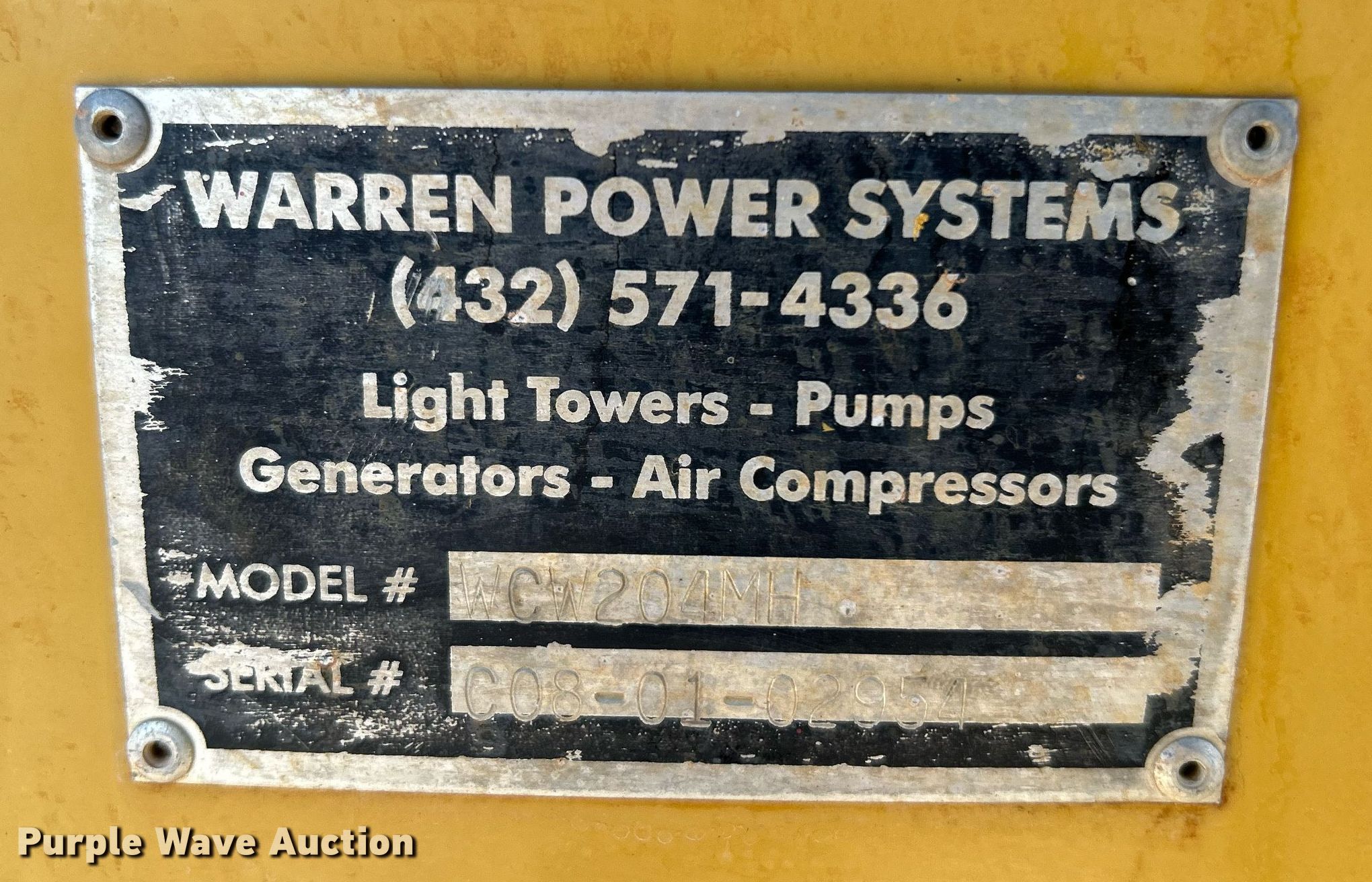 Purple Wave is selling a used Light Plant in Oklahoma. This item is a Warren Power Systems WCW204MH light plant with the following: Hours: 26,092 on meter, Serial: 0080192954