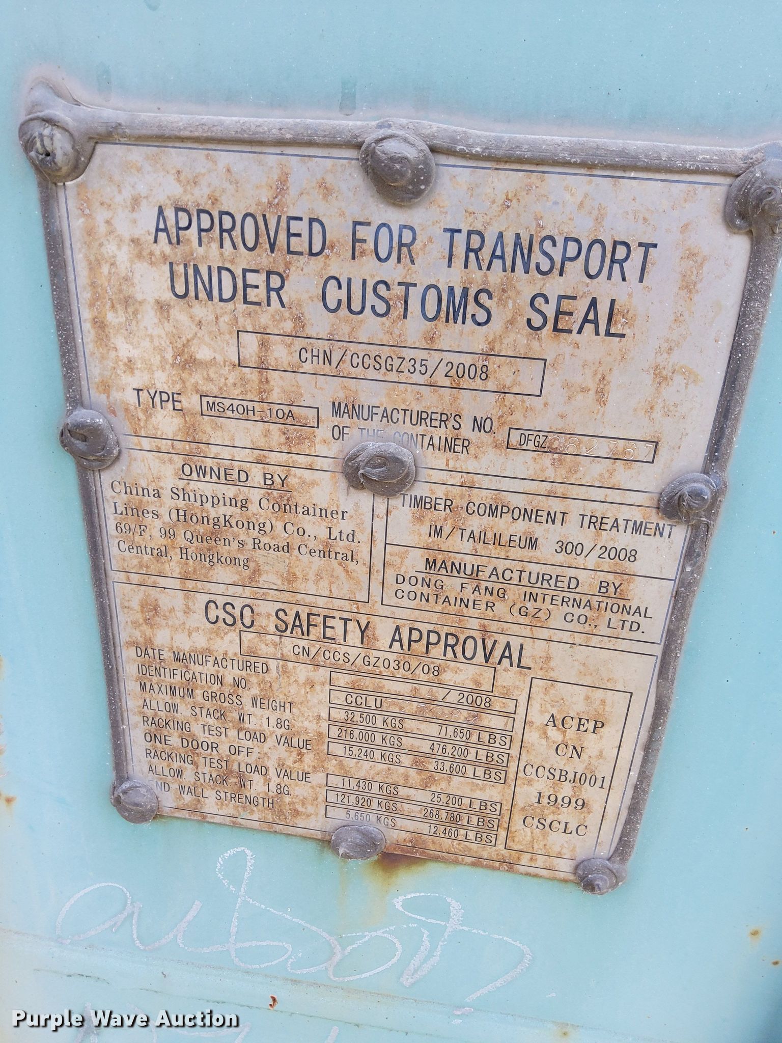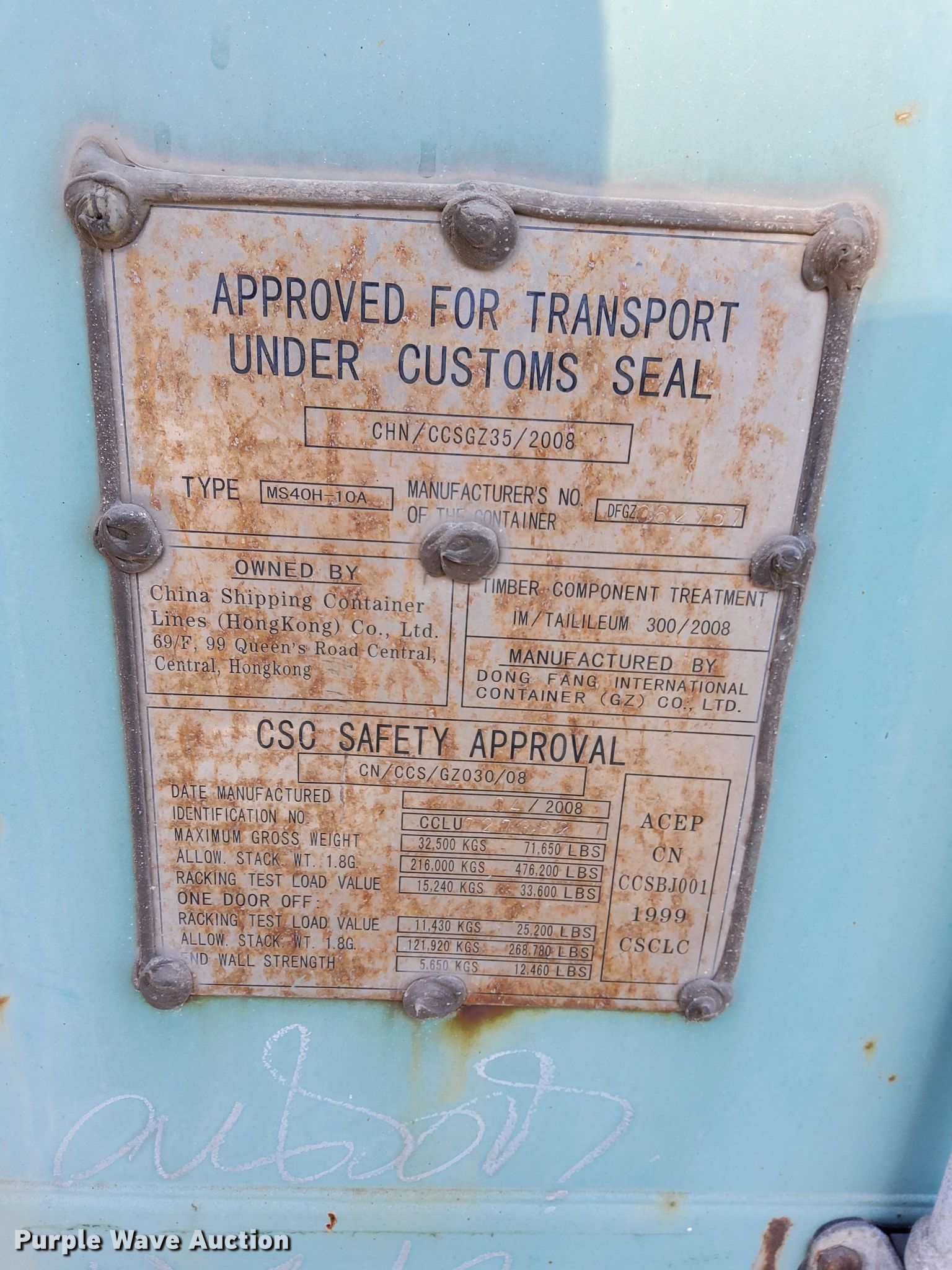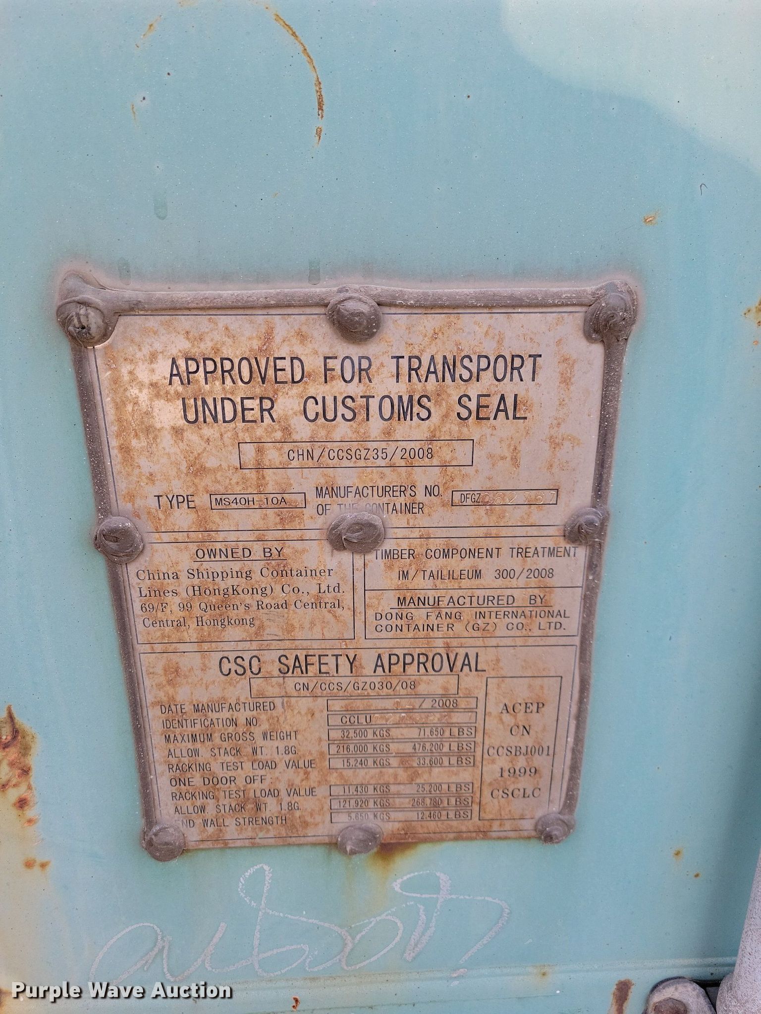 Purple Wave is selling a used Storage or Shipping Container in Iowa. This item is a 2008 China shipping container with the following: 40' x 9'6" x 96"