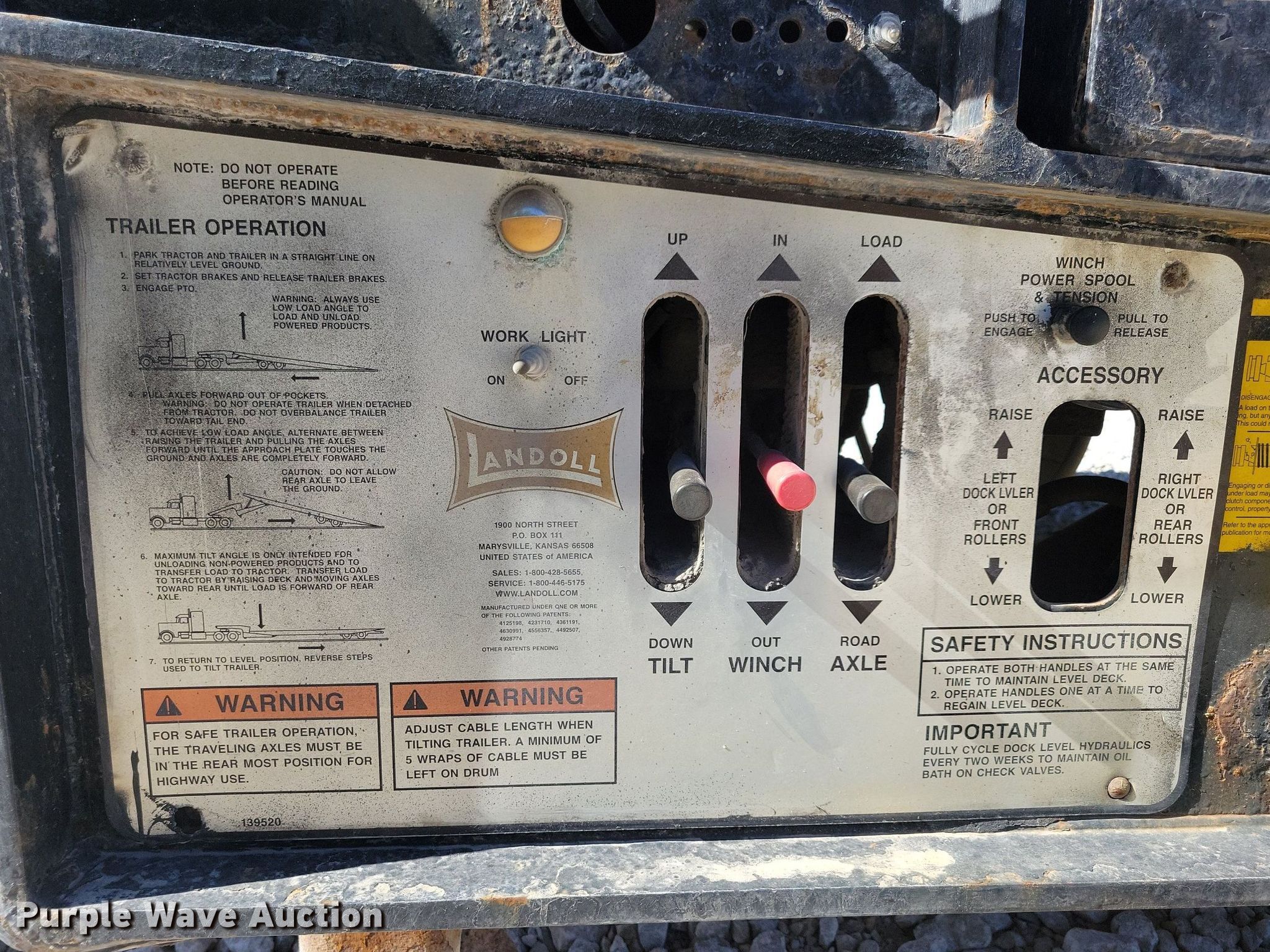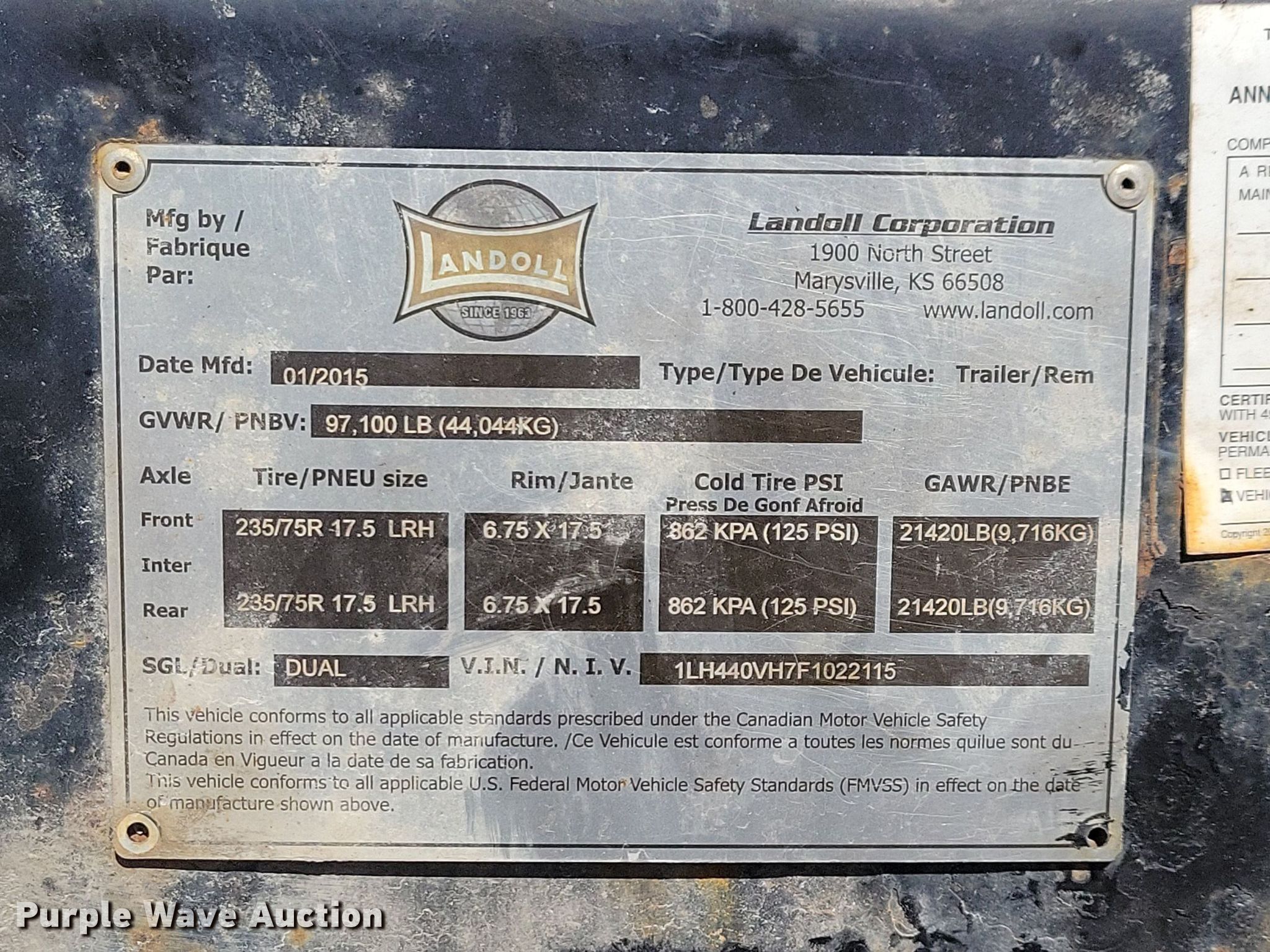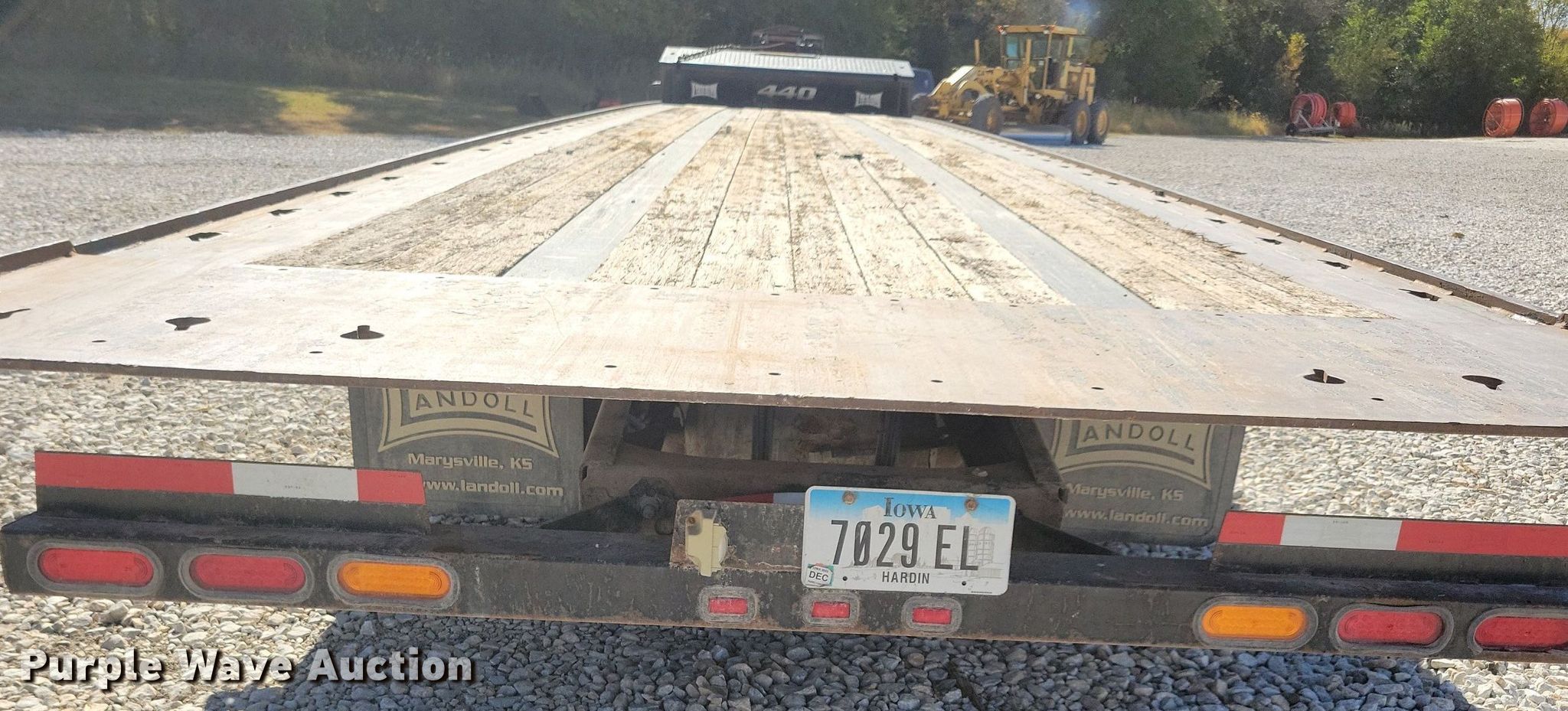 2015 Landoll 440 tilt deck equipment trailer. VIN: 1LH440VH7F1022115. Dimensions Overall: 50' L x 102" W, Deck: 40' L x 102" W, Top deck length: 7', Deck height: 39". Features Deck type: Wood, Winch Braden AMU7-14, Capacity: 24,000 lbs, Hydraulic controls: Manual. Chassis Landing gear: Dual, Suspension: Air, Brakes: Air, Axles: Tandem, GVWR: 97,100 lbs, GAWR: 21,420 lbs. Tires Aluminum wheels, Size: 235/75R17.5. Notes Contents not included. Iowa title. Title has a lien that will be released following the close of the auction. Title distribution may be delayed up to 30 days from verification of funds. Pursuant to Iowa law, Purple Wave will not be collecting sales taxes on any of the purchases made in this business liquidation auction. Zoske Electrical Services Retirement-Open inspection November 15. 124 Country Club Road. Iowa Falls, IA 50126