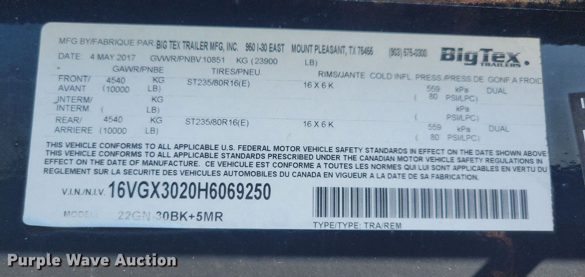Purple Wave is selling a used Equip. Trailer in Iowa. This item is a 2017 Big Tex 22GN equipment trailer with the following: VIN: 16VGX3020H6069250