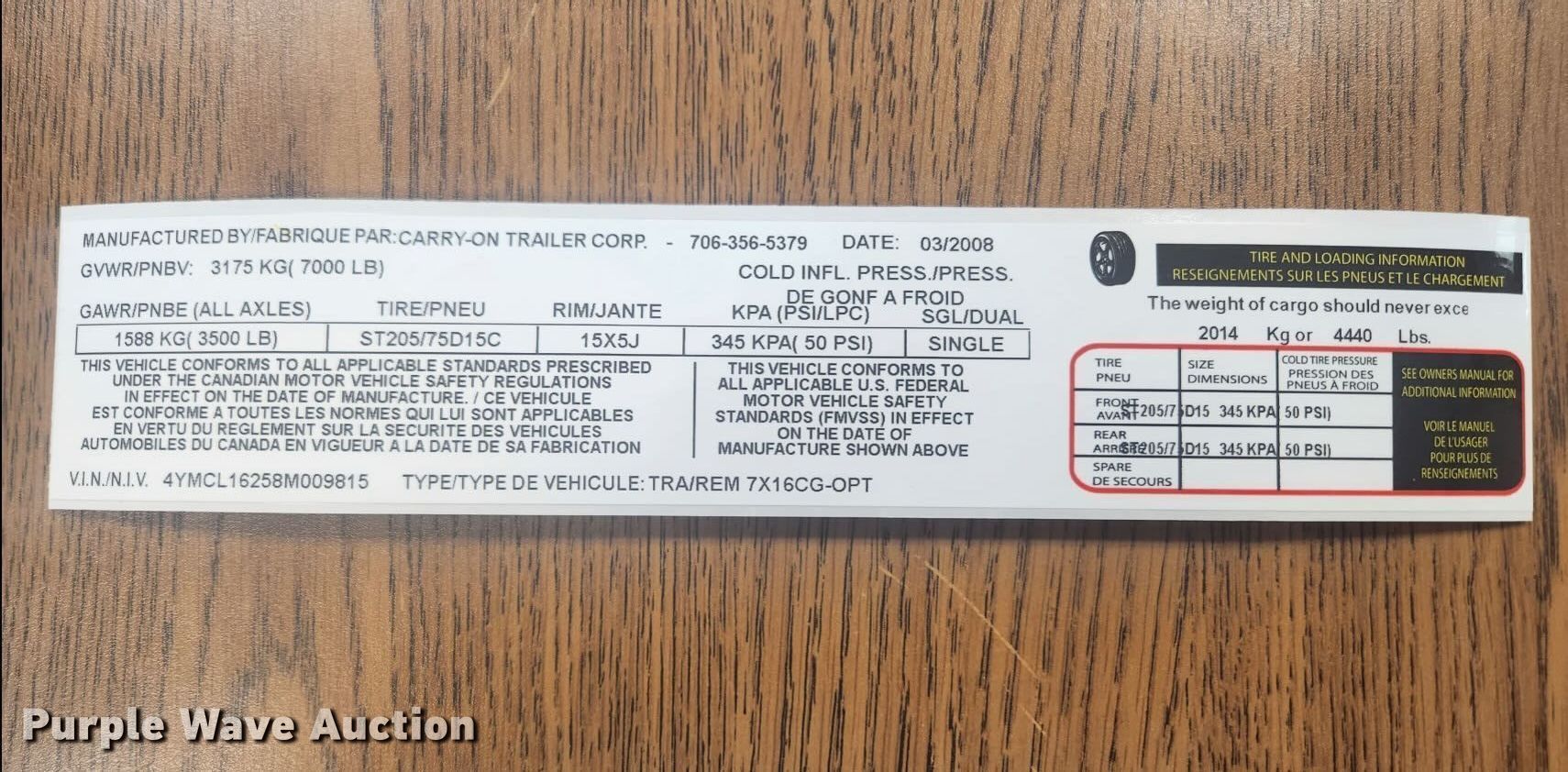 Purple Wave is selling a used Enclosed Cargo Trailer in Iowa. This item is a 2008 Carry-On Cargo fiber optic trailer with the following: VIN: 4YMCL16258M009815