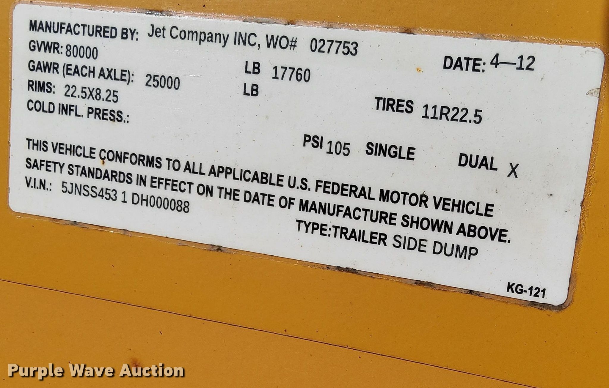 Purple Wave is selling a used Side Tilt Dump Trailer in Iowa. This item is a 2013 Jet Company 45 side dump trailer with the following: VIN: 5JNSS4531DH000088