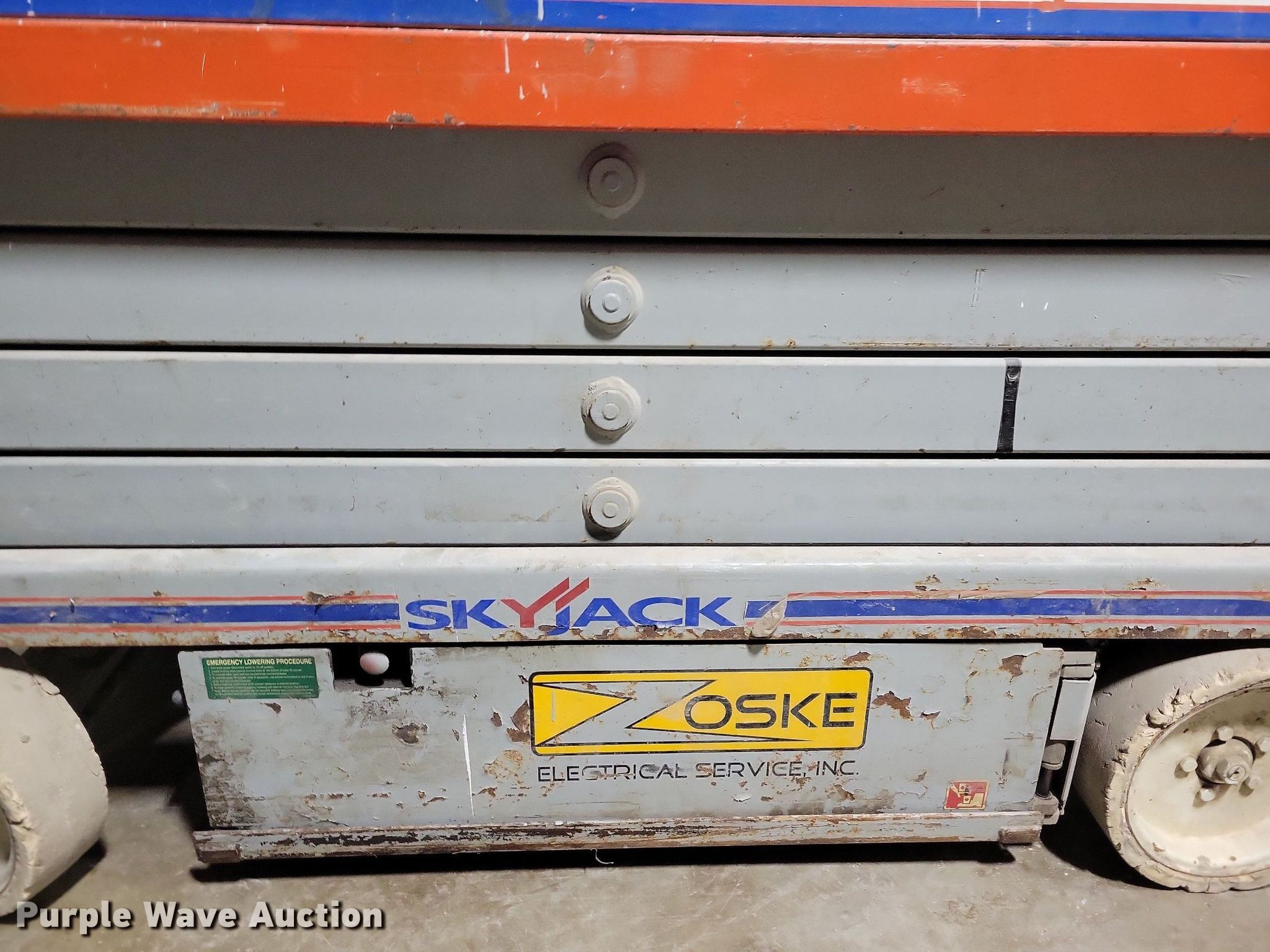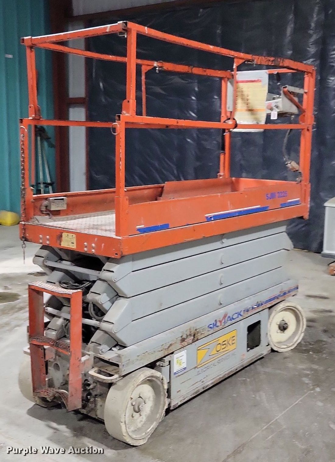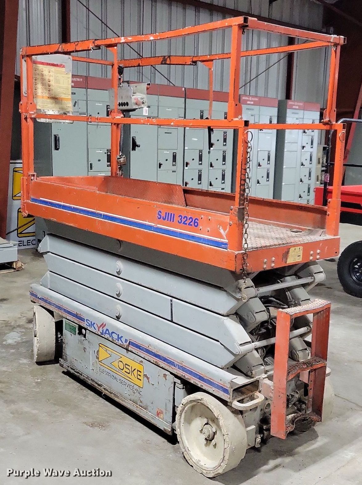 Skyjack SJIII 3226 scissor lift. Hours: 328 on meter. Electric Motor Volts: 24. Features Maximum lift capacity: 500 lbs, Maximum lift height: 32', Platform: 86" L x 30" W, AC power outlet, Controls: Remote Control, Platform extensions: Manual. Tires Solid. Pursuant to Iowa law, Purple Wave will not be collecting sales taxes on any of the purchases made in this business liquidation auction. Zoske Electrical Services Retirement-Open inspection November 15. 124 Country Club Road. Iowa Falls, IA 50126