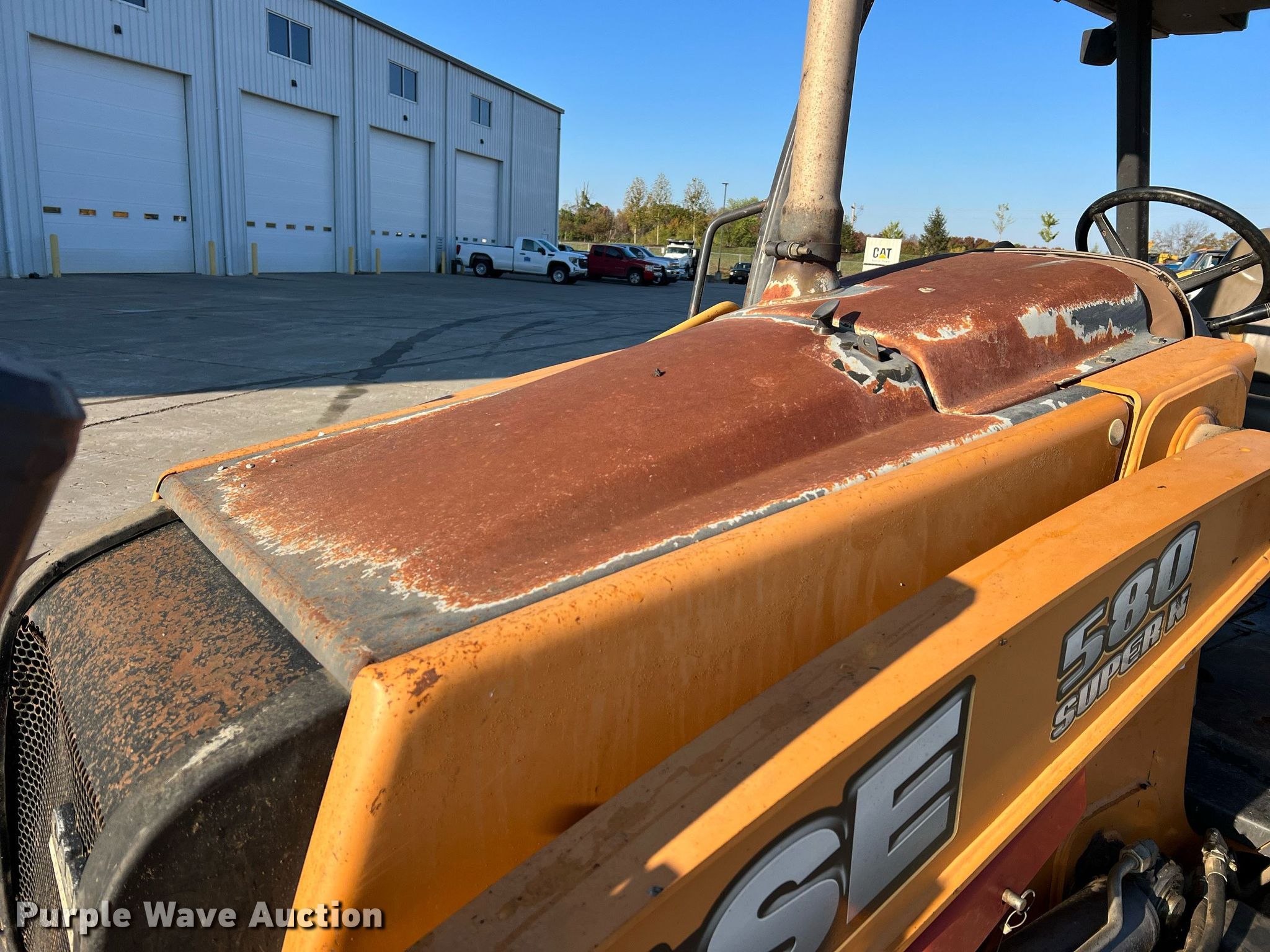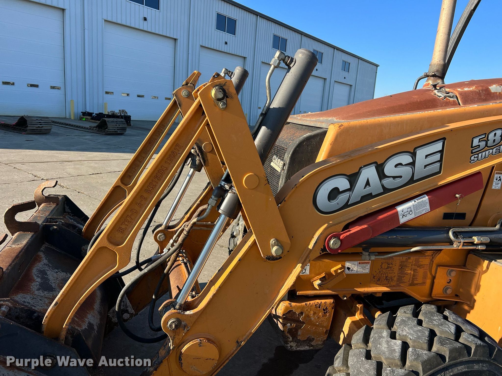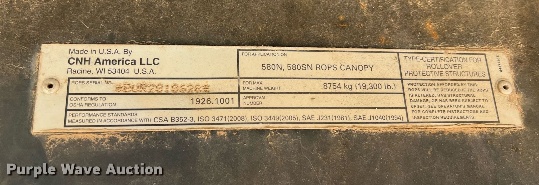 2013 Case 580 Super N backhoe. Hours: 815 on meter, Serial: JJGN58SNADC585357, Unit #: 45-403. Engine Cylinders: 4, Fuel type: Diesel. Transmission Shuttle shift, 4F - 4R. Chassis Four wheel drive. Operators station OROPS, Backhoe controls: Pilot control. Features Loader Bucket Width: 82", Cutting edge: Bolt-on, Backhoe Auxiliary hydraulics, Bucket Width: 23", Teeth: 5.. Tires Front: 12X16.5, Rear: 19.5L-24. Notes Dash warning indicator: Warning, Hour meter replaced at approximately 3,600 hours. Emery Sapp & Sons, Inc... 5670 N Hwy 763. Columbia, MO 65202