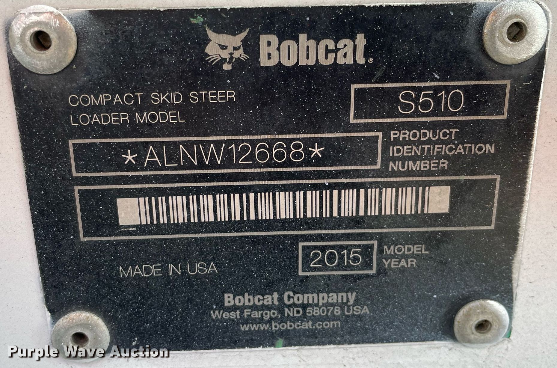 Purple Wave is selling a used Skid Steer Loader in New York. This item is a 2015 Bobcat S510 skid steer loader with the following: Hours: 1,492 on meter, Serial: ALNW12668, Unit #: 1796