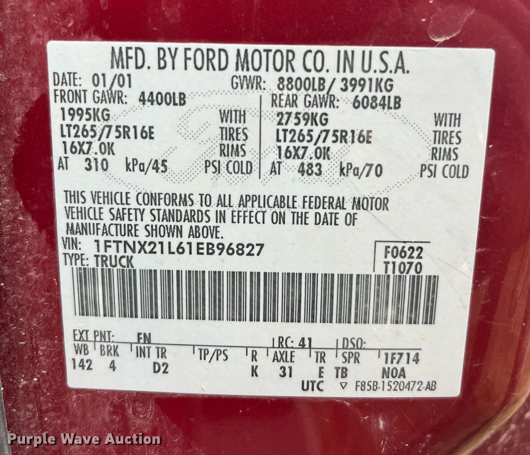 Purple Wave is selling a used 3/4 or 1 Ton Pickup or Van in Missouri. This item is a 2001 Ford F250 Super Duty XLT SuperCab pickup truck with the following: Miles: 129,700 on odometer, VIN: 1FTNX21L61EB96827