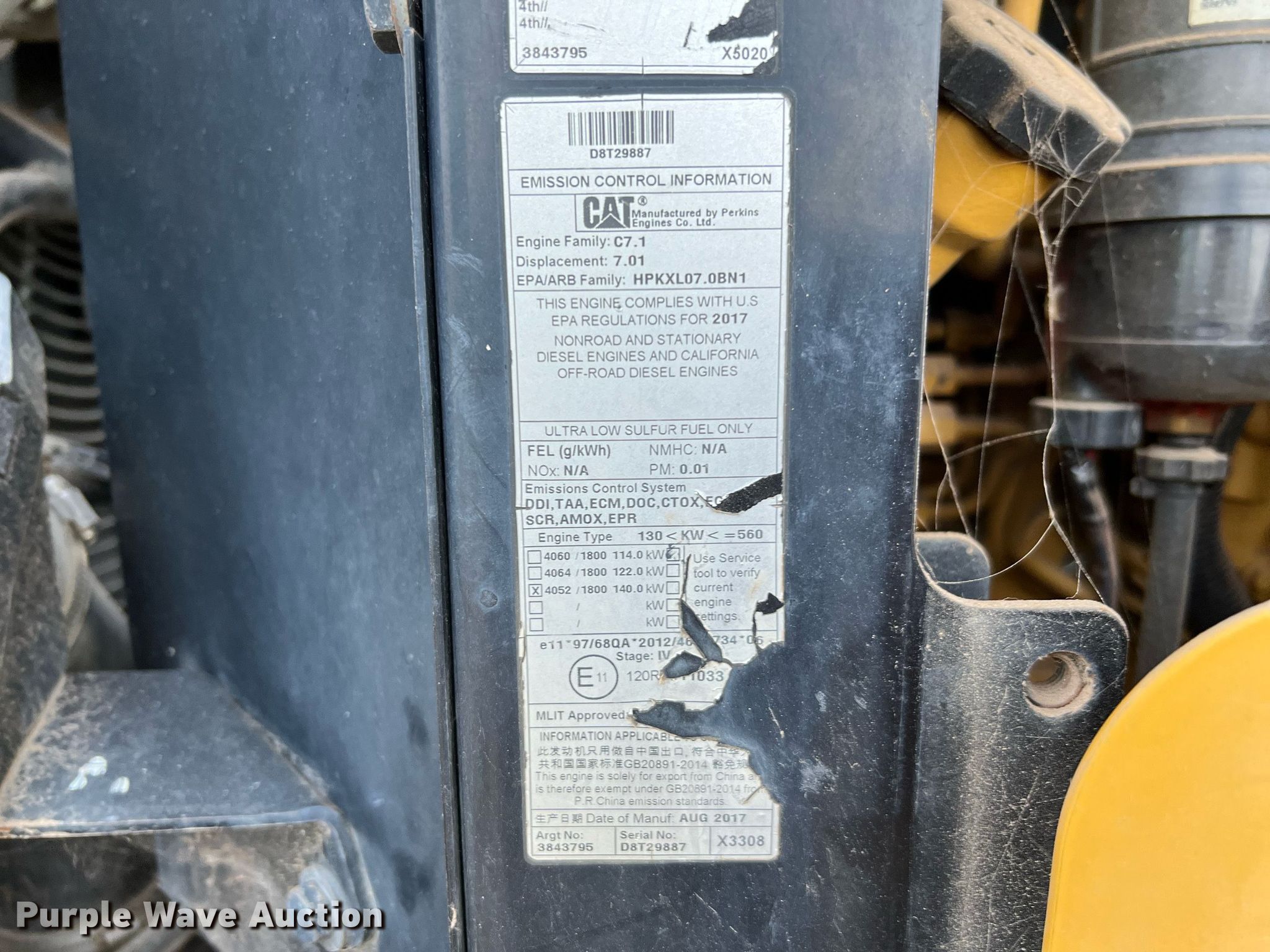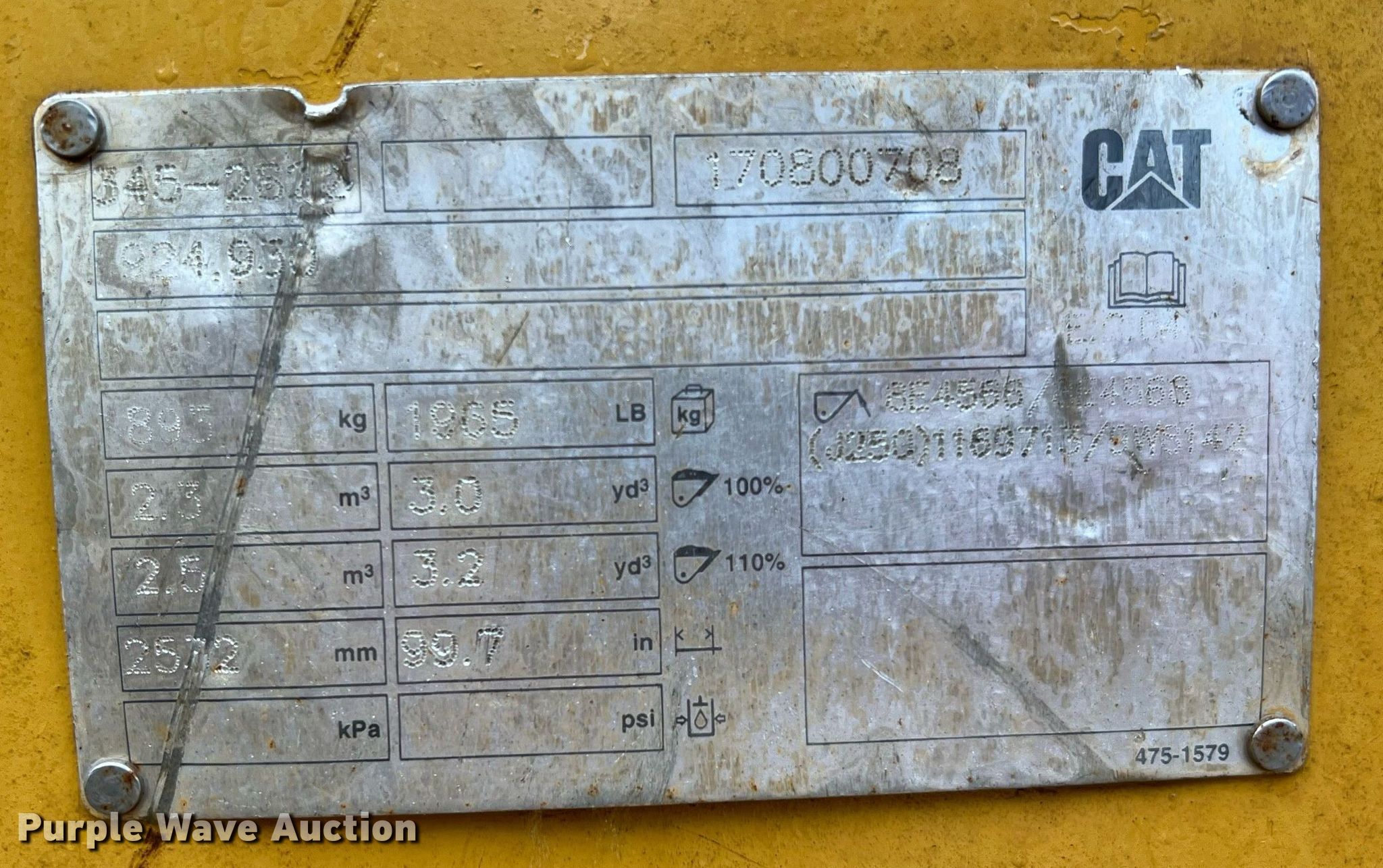 2017 Caterpillar 926M wheel loader. Hours: 11,282 on meter, Serial: CAT0926MHLTE04457. Engine Caterpillar C7.1, Serial: D8T29887, Displacement: 7.01L, Cylinders: 6, Fuel type: Diesel. Transmission Powershift, 4F - 4R. Chassis Differential lock: Front. Operators station Enclosed cab, AC, Heat, Bucket controls: Joystick, Ride control, Backup camera. Features Bucket Caterpillar, Capacity: 3.2 cu.yd., Width: 99.7", Self- leveling bucket, Cutting edge: Bolt-on, Auto lube system. Tires Size: 20.5R25. Notes Glass cracked, Possible AC issues, does not blow cold. Luckey Custom Feedlot, Inc.. 2242 FM 3176. Bigfoot, TX 78005