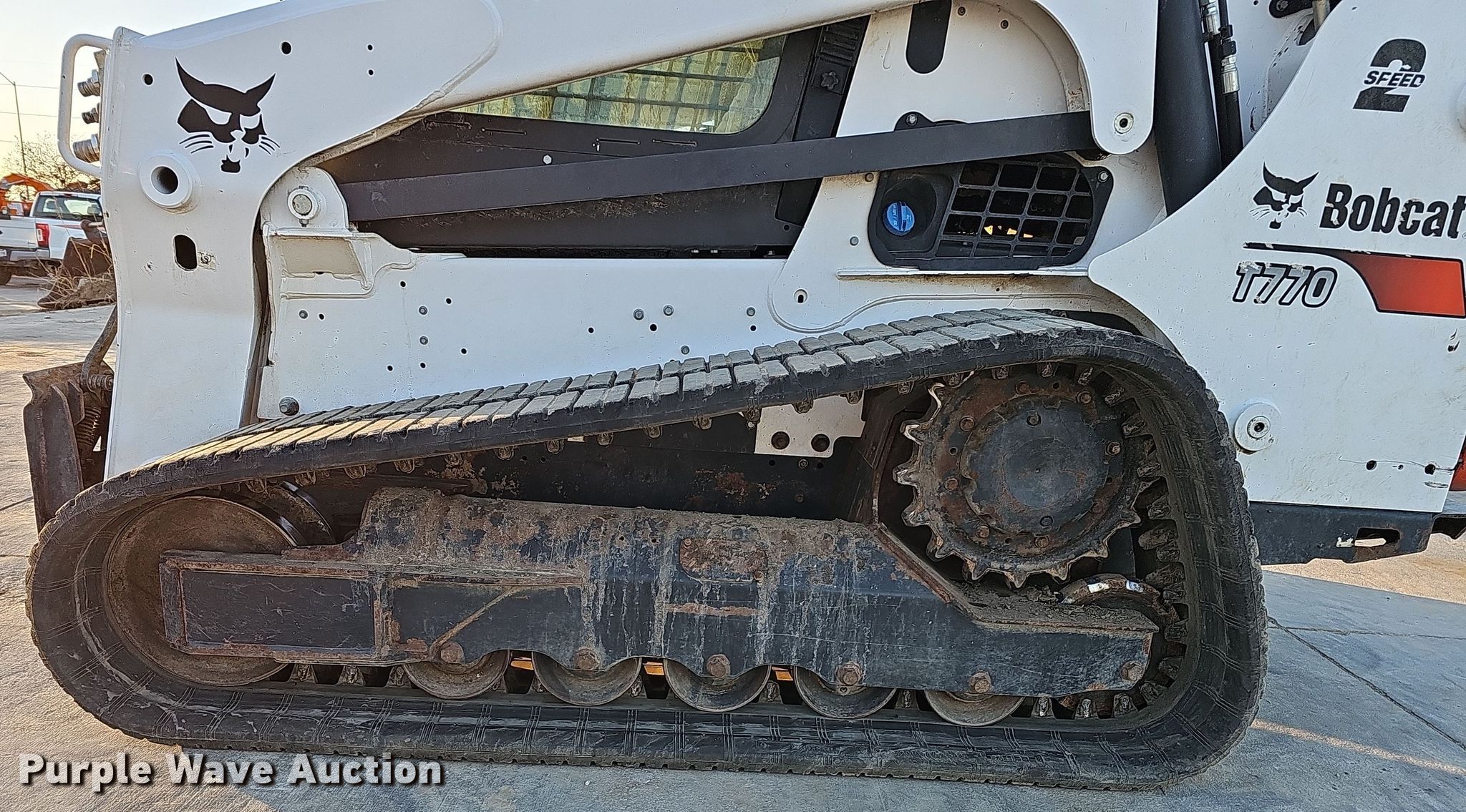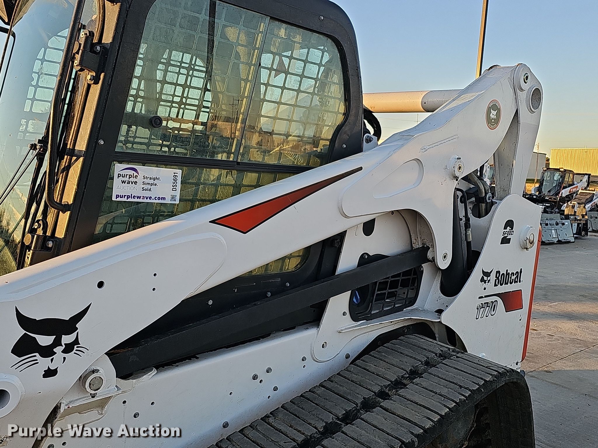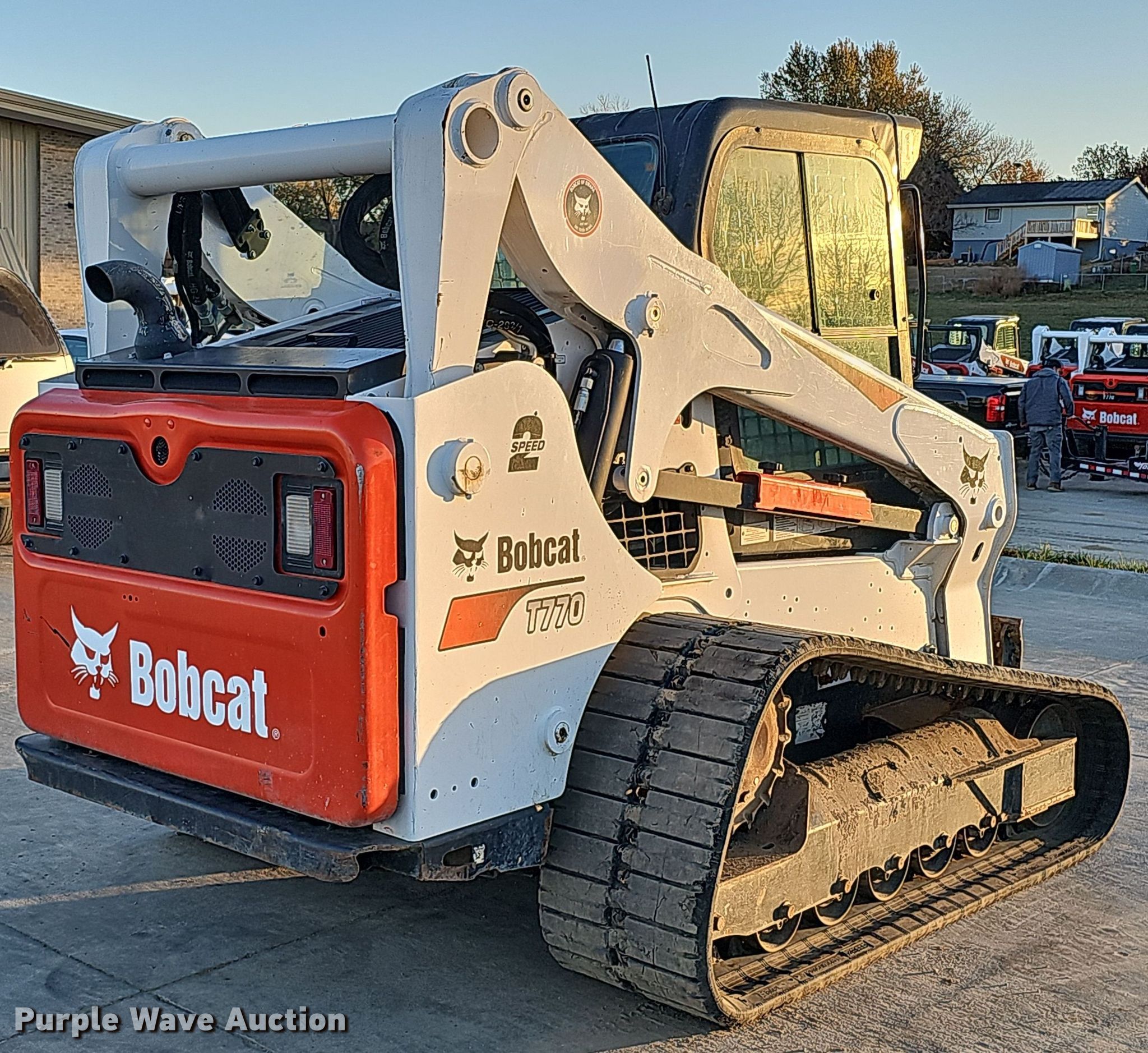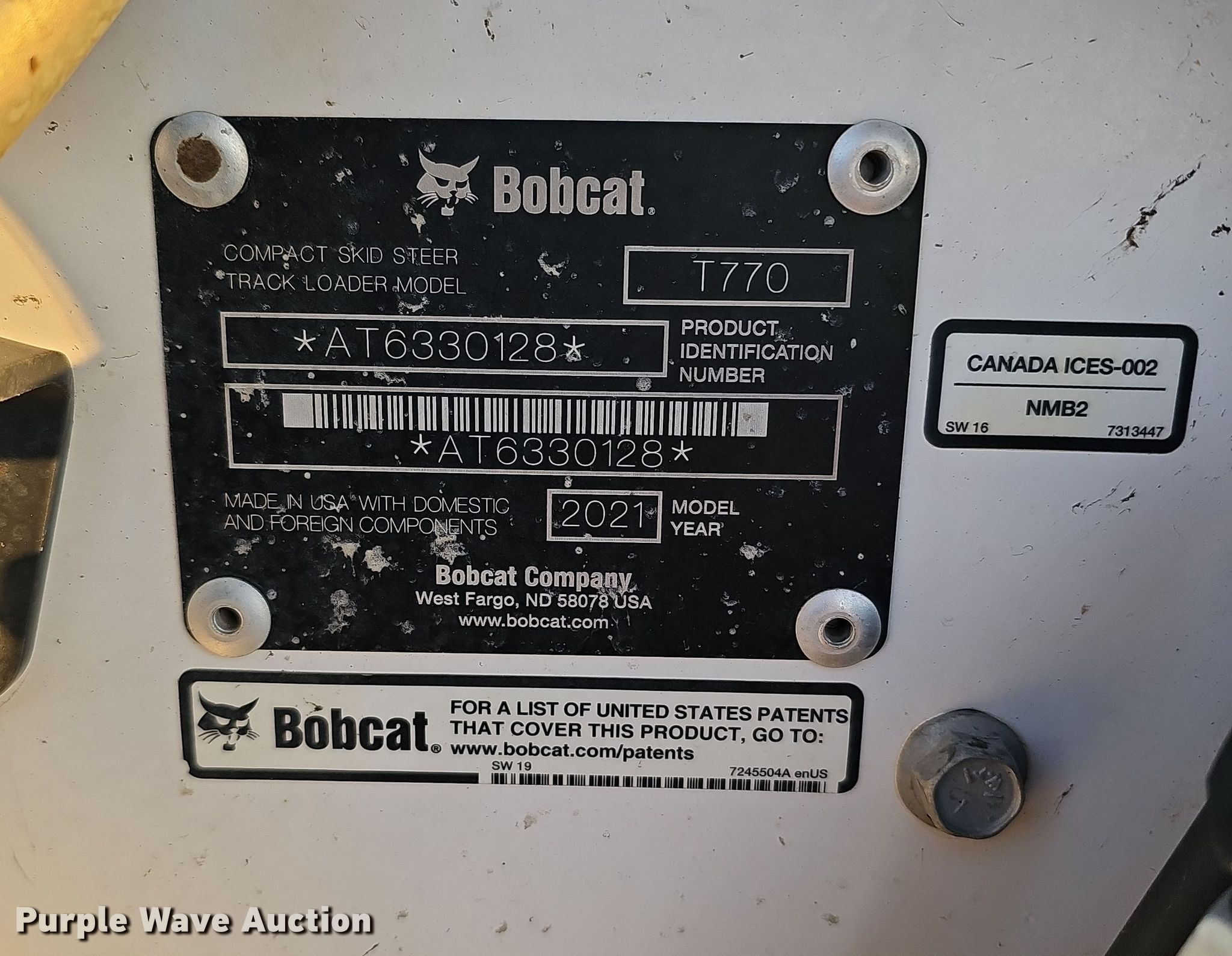 2021 Bobcat T770 tracked skid steer loader. Hours: 1,808 on meter, Serial: AT6330128. Engine Cylinders: 4, Fuel type: Diesel. Transmission Hydrostatic, Two speed travel. Operators station OROPS, AC, Heat, Bucket control: Hand. Features Auxiliary hydraulics, Auxiliary electrical outlet, Quick coupler: Hydraulic. Tracks Width: 18". Bobcat of Omaha. 8701 South 145th Street. Omaha, NE 68138