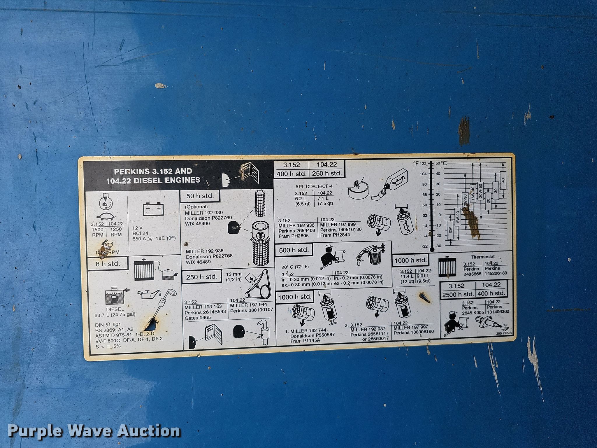 Miller Big Blue 402P welder/generator. Hours: 1,712 on meter. Engine Perkins CM70463, Serial: U139806H, Cylinders: 3, Fuel type: Diesel. Features Welder Capabilities: DC, Fuel tank, Trailer mounted, Generator 240V outlets: 1, 120V outlets: 1. Trailer 8' L x 54" W, Suspension: Spring, Axles: Single, Tire size: ST175/80R13. Transfer of ownership documentation will be a bill of sale. JORDAN MACHINERY/ S & N Auto Sales. 25050 US Hwy 275. Waterloo, NE 68069