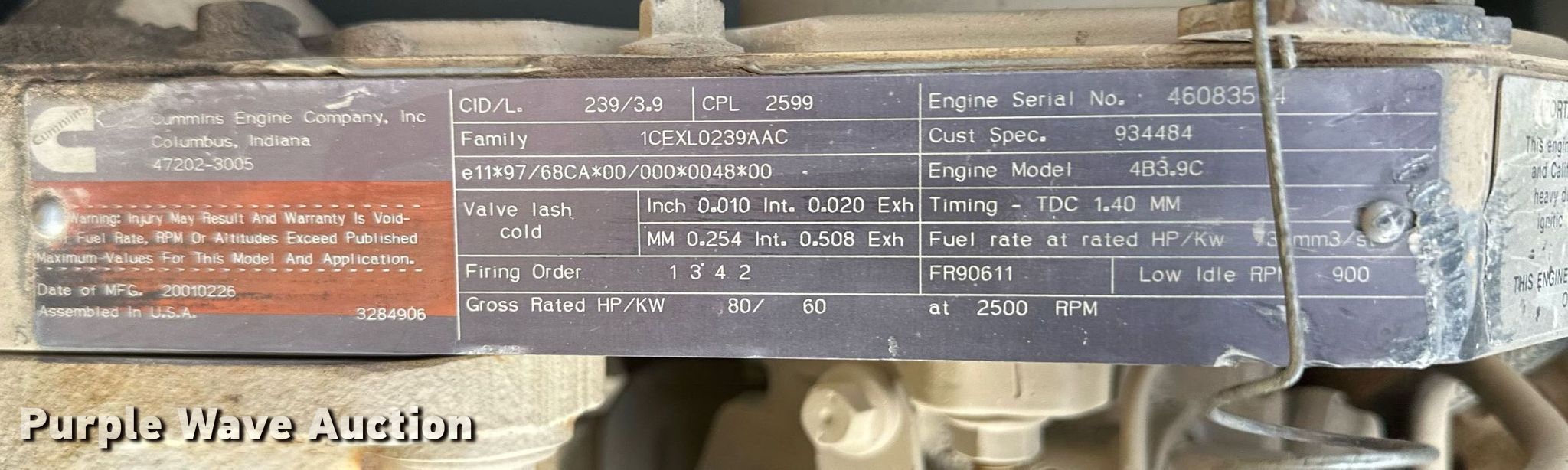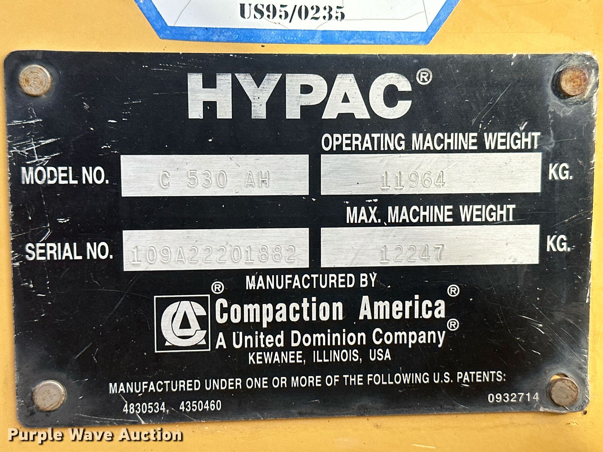 2001 Hypac C530AH pneumatic roller. Hours: 5,854 on meter, Serial: 109A22201882. Engine Cummins 4B3.9C, Displacement: 3.9L, Cylinders: 4, Fuel type: Diesel. Transmission Hydrostatic, Two speed travel. Tires Size: 7.50-15, Quantity: 9. B&H Paving. Scott City, KS 67871
