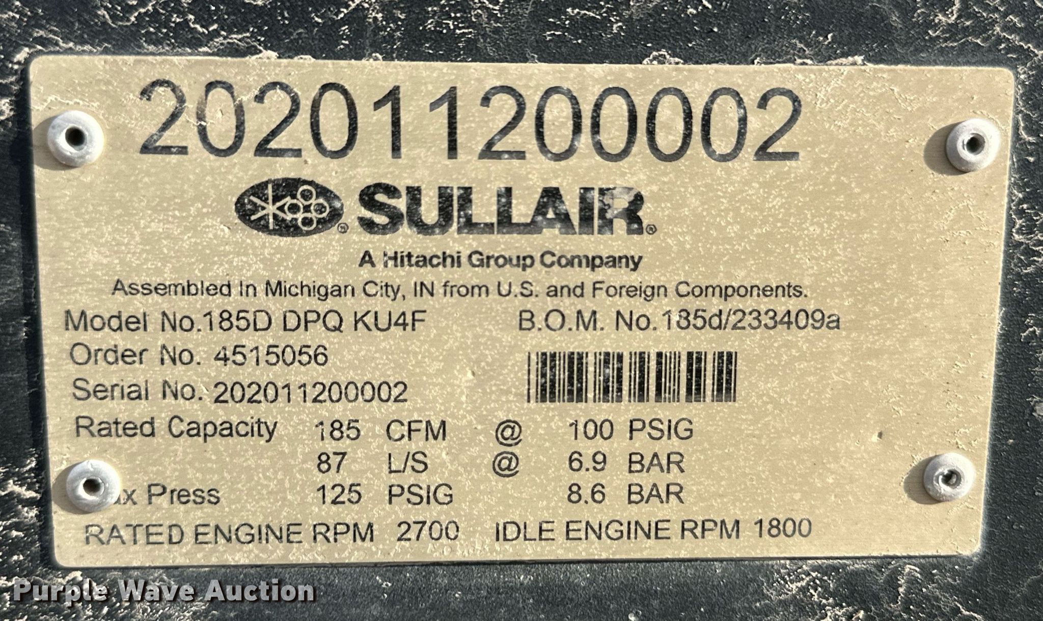 Purple Wave is selling a used Air Compressor in Kansas. This item is a Sullair 185D air compressor with the following: Hours: 725 on meter, Serial: 202011200002