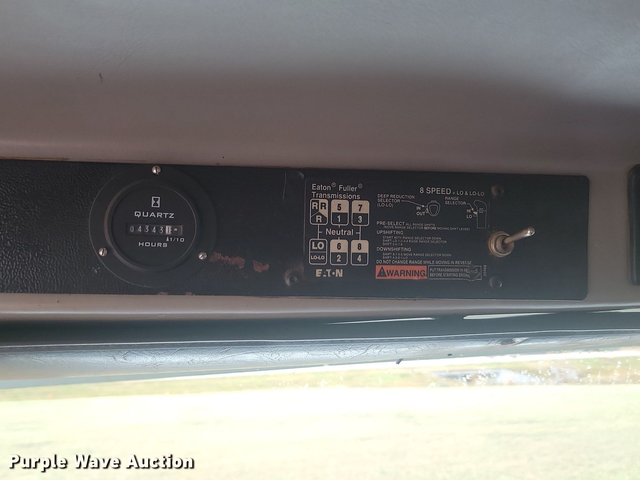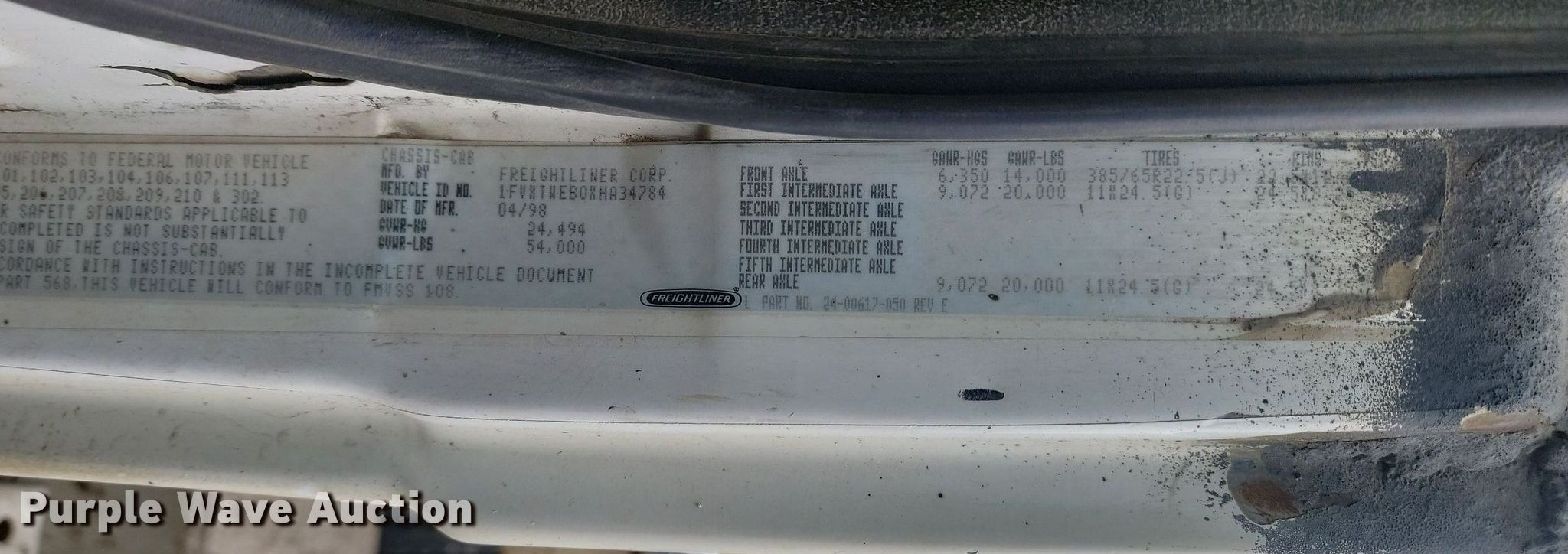 1999 Freightliner FL112 dump truck. Miles: 190,066 on odometer, Hours: 25,150 on meter, Hours: 4,343 on second meter, VIN: 1FVXTWEBOXHA34784. Engine Caterpillar C12, Displacement: 12.0L, Cylinders: 6, Fuel type: Diesel, Engine brake. Transmission Eaton Fuller, Manual, Speed: 10. Chassis Axles: Triple, Pusher axle, Differential lock: Full, Suspension: Spring over walking beam, Brakes: Air, PTO, GVWR: 54,000 lbs FAWR: 14,000 lbs, IAWR: 20,000 lbs, RAWR: 20,000 lbs. Interior AC, Heat, Cruise control. Features Dump bed 15' L x 96" W, Side board height: 10", Bed type: Steel, Roll tarp, Ram: Single , End gate: Air operated. Tires Front: 425/65R22.5, Rear: 11R24.5, Lift axle: 295/75R22.5. Notes Rollover damage, Dumbed issues Ram damaged, Non-operational unit. Title distribution may be delayed up to 14 days from verification of funds. Morris Inc.. 220 U.S. 14. Fort Pierre, SD 57532
