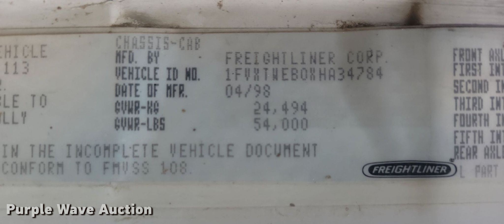 Purple Wave is selling a used Construction Dump Truck in South Dakota. This item is a 1999 Freightliner FL112 dump truck with the following: Miles: 190,066 on odometer, Hours: 25,150 on meter, Hours: 4,343 on second meter, VIN: 1FVXTWEBOXHA34784