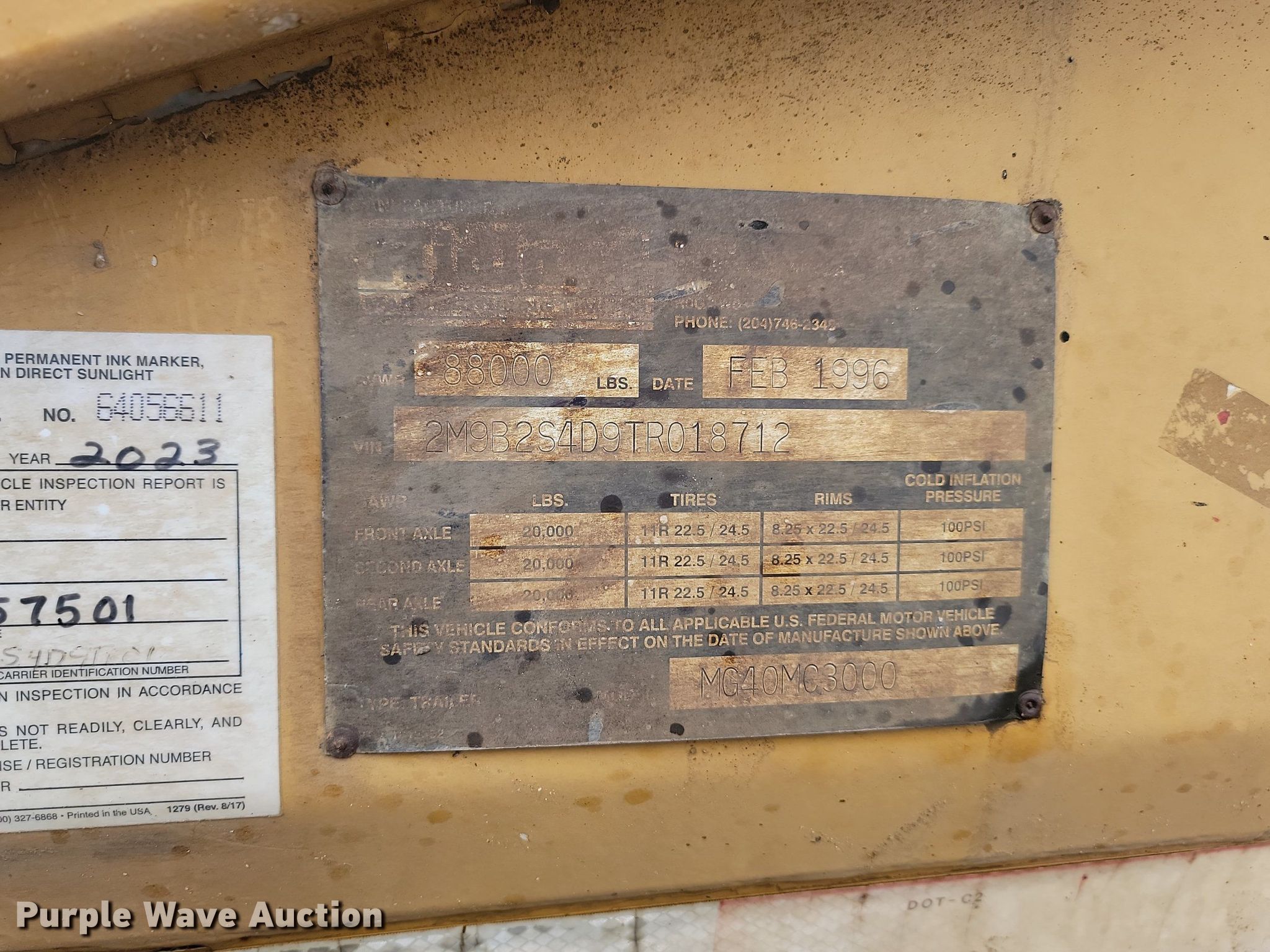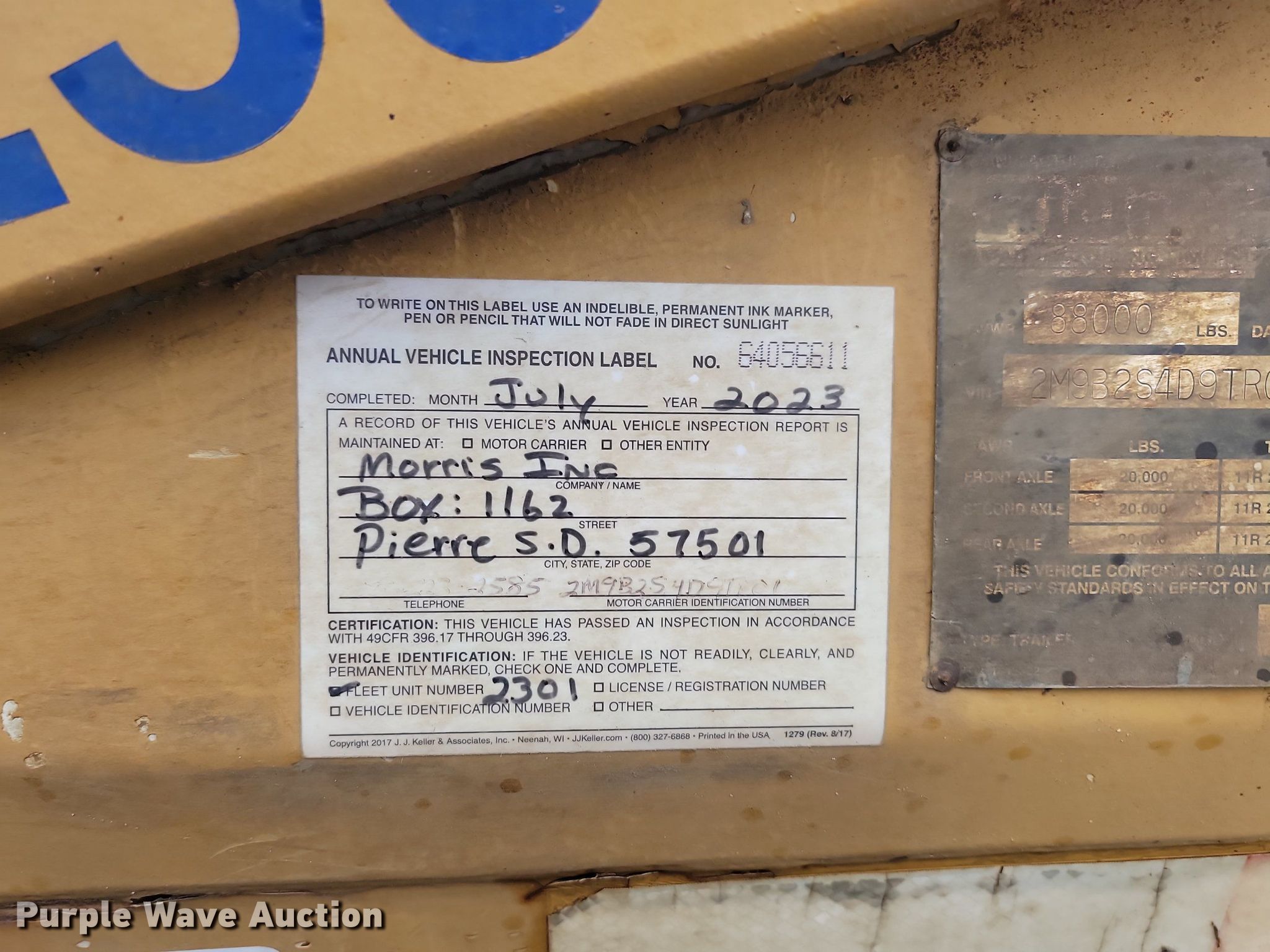 1996 Midland MG40MC3000 bottom dump trailer. VIN: 2M9B2S4D9TR018712, Unit #: 2301. Dimensions Overall: 40' L x 102" W. Features Body type: Steel, Clamshell gate: Air operated, Trailer controls, Roll tarp. Chassis Landing gear: Dual, Suspension: Spring, Brakes: Air, Axles: Triple, GVWR: 88,000 lbs, GAWR: 20,000 lbs. Tires Steel wheels, Size: 11R22.5. South Dakota title. Title distribution may be delayed up to 14 days from verification of funds. Morris Inc.. 220 U.S. 14. Fort Pierre, SD 57532