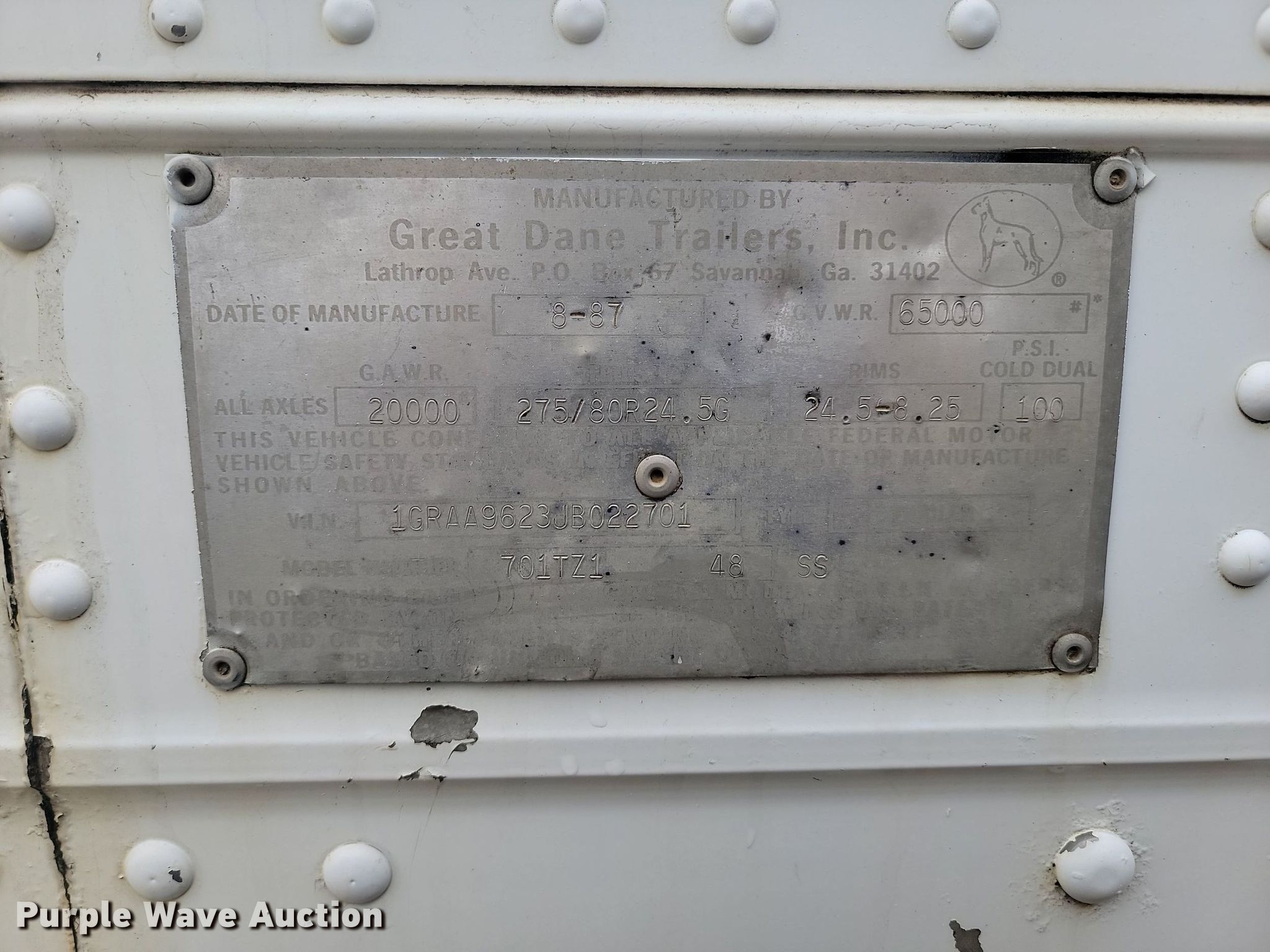 1988 Great Dane 701TZ1 mobile office. VIN: 1GRAA9623JB022701. Dimensions Overall: 48' L x 96" W. Features Deck type: Wood. Chassis Landing gear: Dual, Suspension: Spring, Brakes: Air, Axles: Tandem, GVWR: 65,000 lbs. Tires Steel wheels, Size: 285/75R24.5. Notes Wheels and tires missing, Unknown operating condition. South Dakota title. Title distribution may be delayed up to 14 days from verification of funds. Morris Inc.. 220 U.S. 14. Fort Pierre, SD 57532