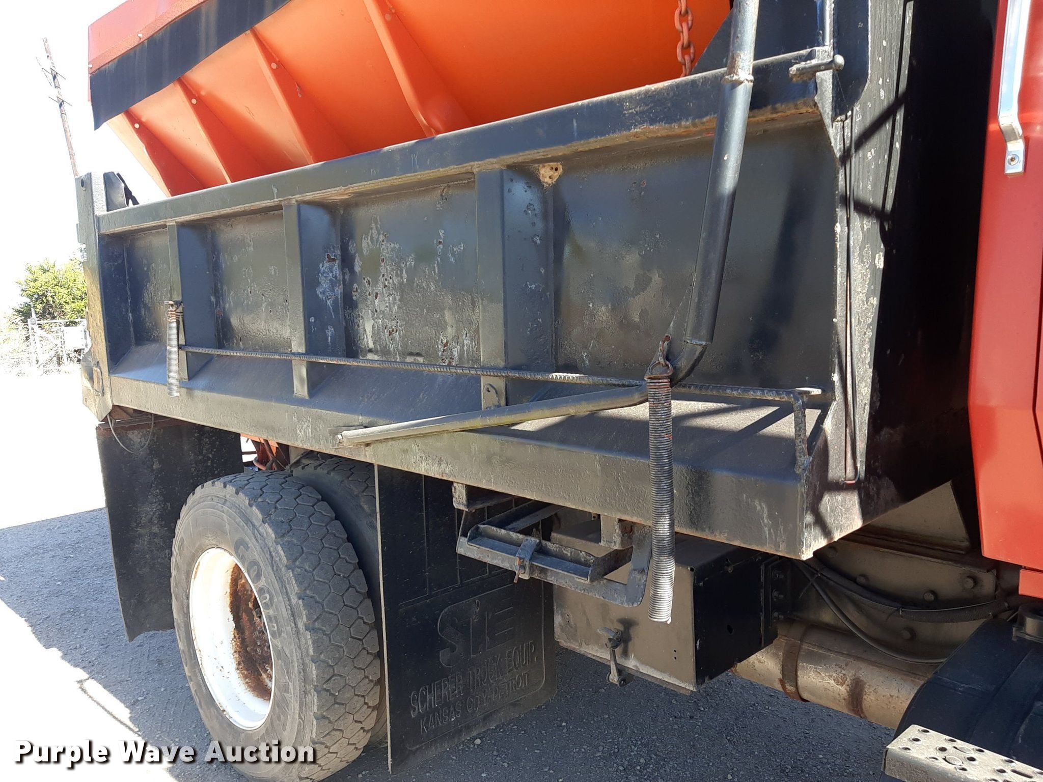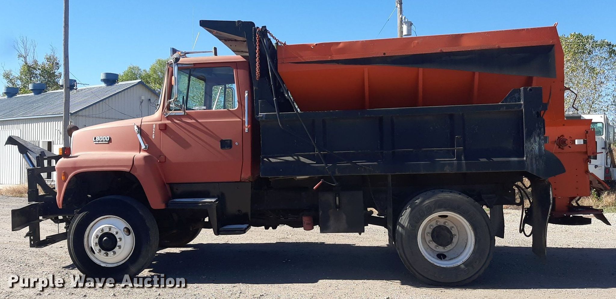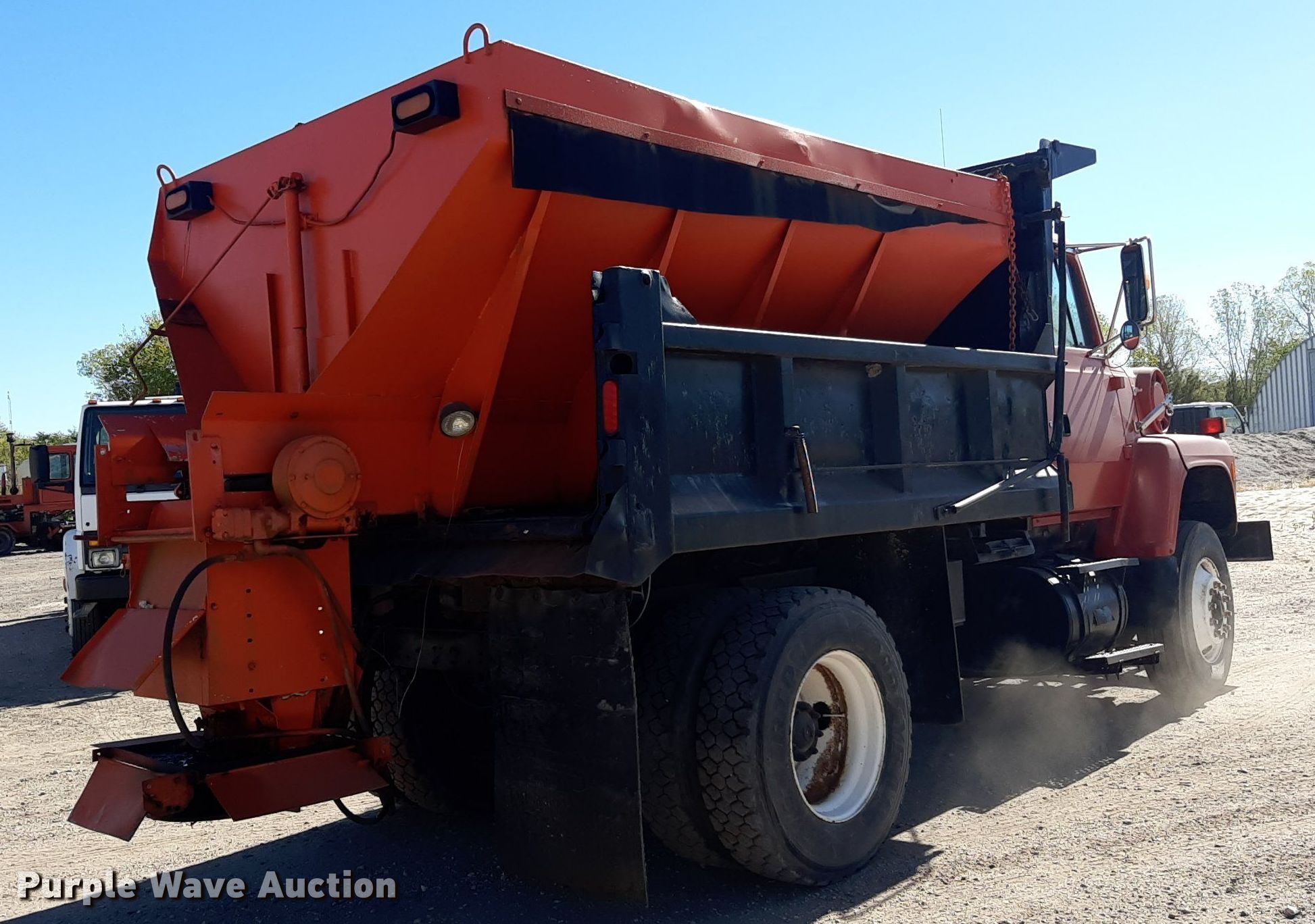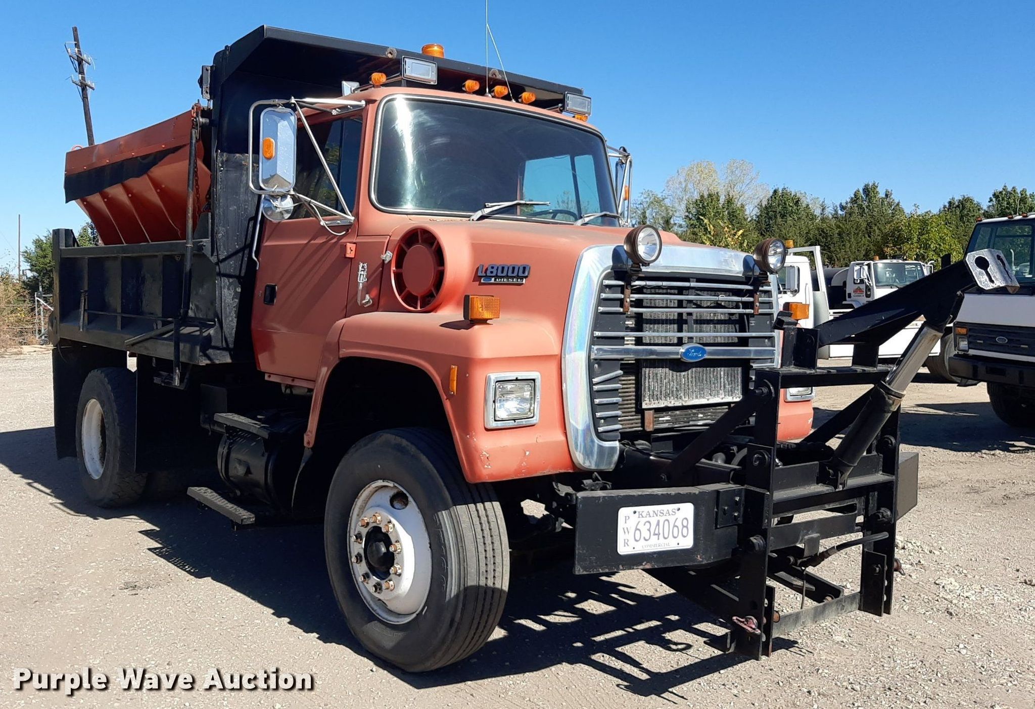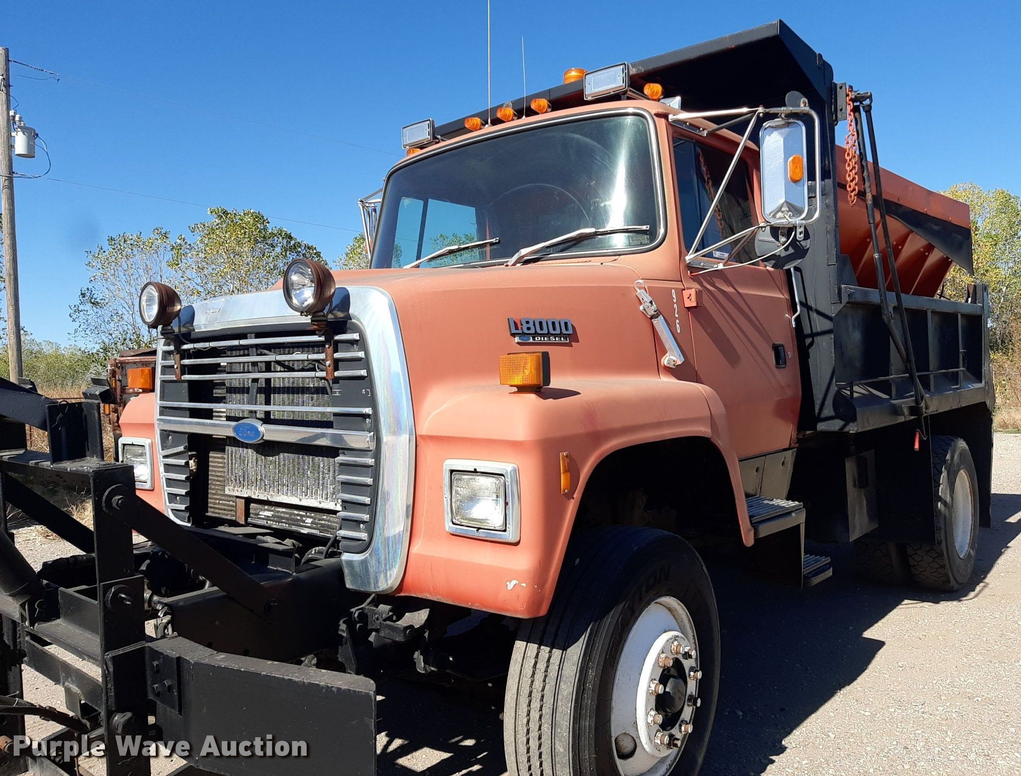 1992 Ford LN8000 dump truck. Miles: 66,599 on odometer, VIN: 1FDYR82A2NVA04926. Engine Displacement: 7.80L, Cylinders: 6, Fuel type: Diesel. Transmission Automatic. Chassis Axles: Single, Suspension: Spring, Brakes: Air, PTO, GVWR: 37,080 lbs. Interior AC, Heat. Features Dump bed 10' 8" L x 96" W, Side height: 28", Bed type: Steel, Ram: Single, Spreader Monroe MSV-120-84-56-SS, Plow Monroe, Width: 132". Tires Size: 11R22.5. Kansas title. Title distribution may be delayed up to 14 days from verification of funds. 709 W 6th. Augusta, KS 67010