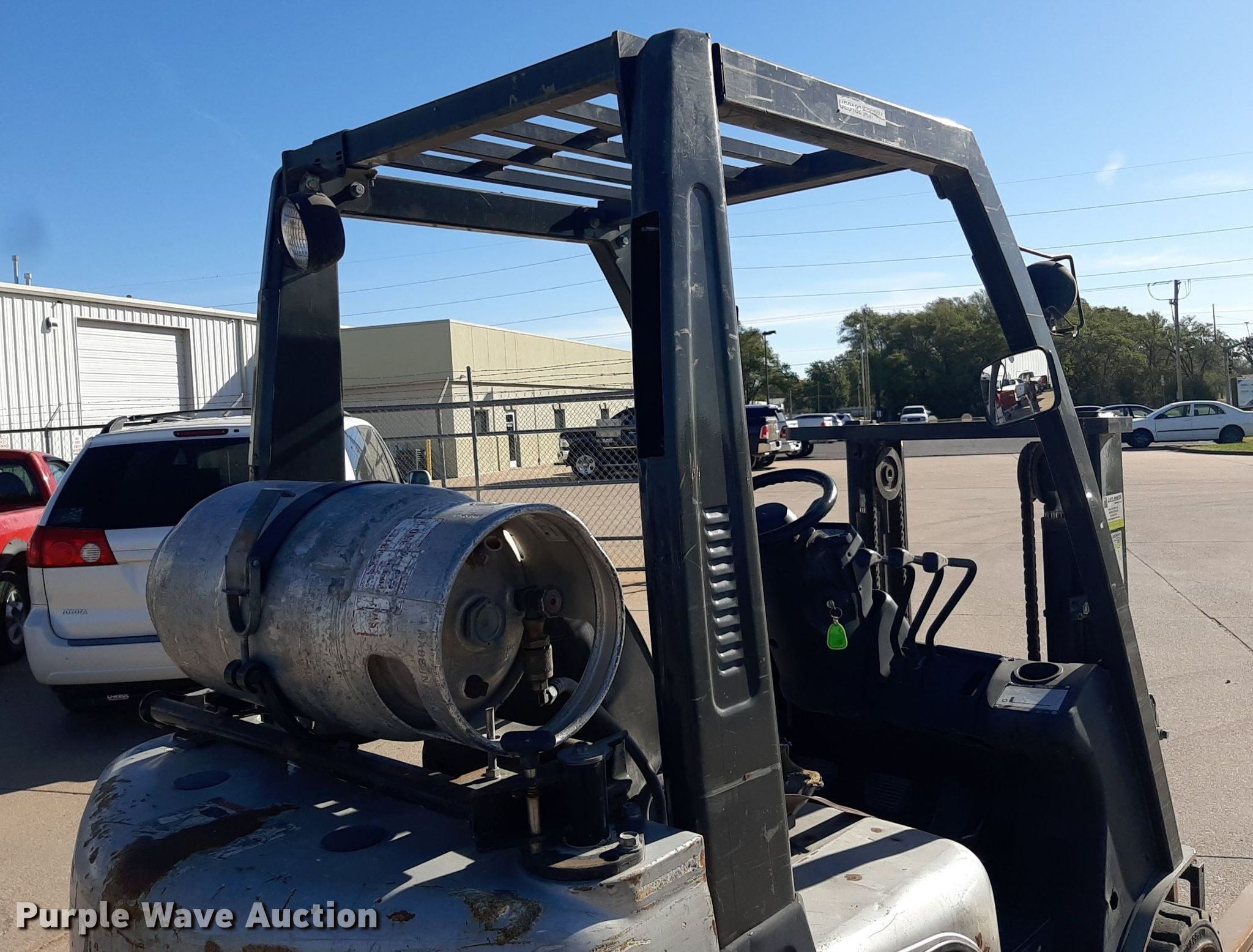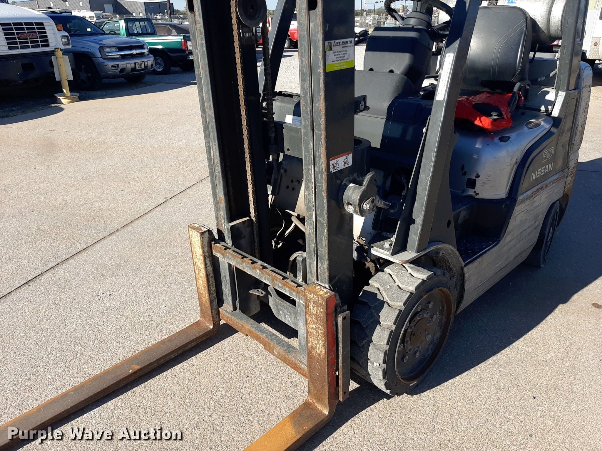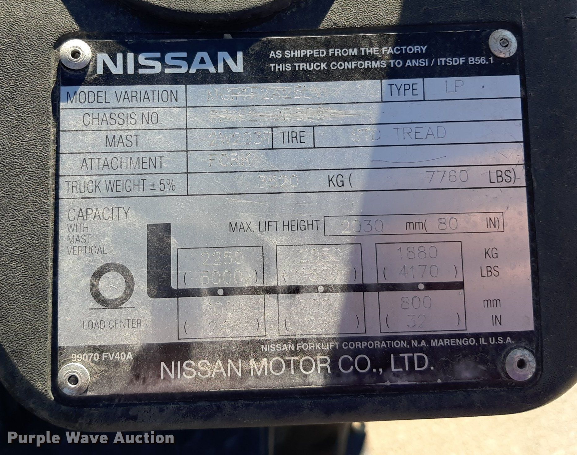 Nissan 50 forklift. Hours: 23,089 on meter. Engine Cylinders: 4, Fuel type: Dual fuel. Transmission Powershift. Operators station OROPS. Features Maximum lift capacity: 5,000 lbs, Maximum lift height: 80", Mast stages: 2, Mast tilt, Fork length: 41". Tires Front: 21x8x15, Rear: 16x5x11, Solid. Notes Transmission issues. Higgins Group. 3919 South West Street. Wichita, KS 67217