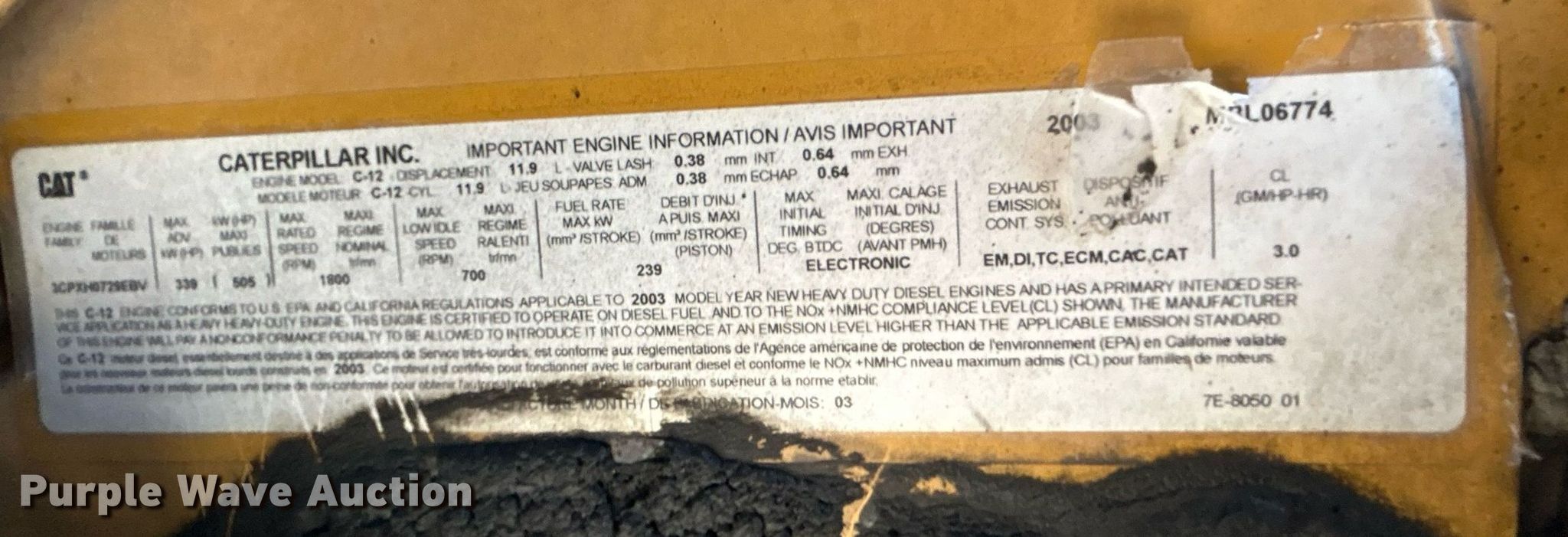 2004 International 7600 dump truck. Miles: 338,598 on odometer, Hours: 19,244 on meter, VIN: 1HTWYAXT44J079524. Engine Caterplillar C-12, Serial: MBL06774, Displacement: 11.9L, Cylinders: 6, Fuel type: Diesel, HP: 339, kW: 505. Transmission Manual. Chassis Axles: Tandem, Pusher axle, Differential lock: Full, Suspension: Spring, Brakes: Air, PTO. Interior AC, Heat, Cruise control, Brake controller. Features Dump bed 16' L x 95" W, Side height: 47", Side board height: 9", Bed type: Steel, Roll tarp, Ram: Single , End gate: Air operated. Tires Front: 425/65R22.5, Rear: 11R22.5, Lift axle: 295/75R22.5. Photocopy of title approved-BH. Oklahoma title. Title distribution may be delayed up to 14 days from verification of funds. 15107 North 137th East Avenue. Collinsville, OK 74021