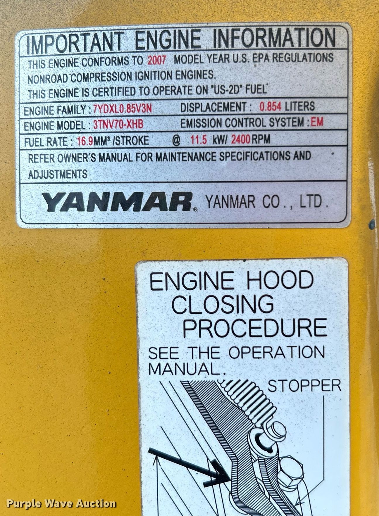 2007 John Deere 17D mini excavator. Hours: 2,313 on meter, Serial: FF017DX220145. Engine Yanmar 3TNV70-XHB, Displacement:.854L, Cylinders: 3, Fuel type: Diesel. Transmission Hydrostatic, Two speed travel. Operators station OROPS. Features Auxiliary hydraulics, Backfill blade Width: 50", Boom Swing, Stick Stick length: 3', Quick coupler: Mechanical, Bucket Width: 11", Teeth: 3. Tracks Width: 9", Rubber. 15107 North 137th East Avenue. Collinsville, OK 74021