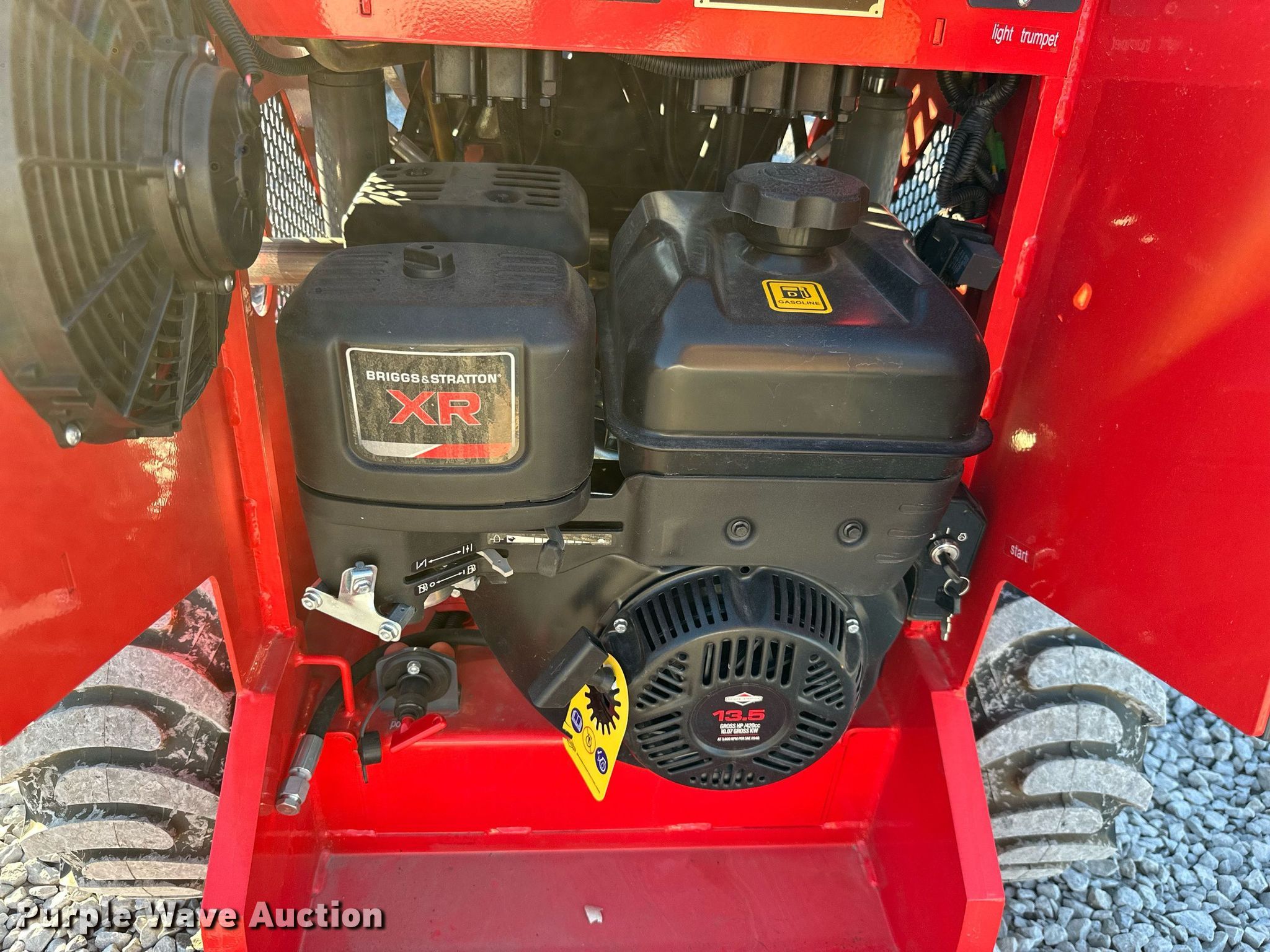 SDLOOL 323W compact utility loader. Serial: SL323042. Engine Briggs and Stratton, Displacement: 420cc, Cylinders: 2, Fuel type: Gas, HP: 13.5. Transmission Hydrostatic. Operators station Bucket control: Hand. Features Auxiliary hydraulics, Quick coupler: Manual, Bucket Width: 42". Tires Size: 18x8.50-8. 8173 South 429. Chouteau, OK 74337