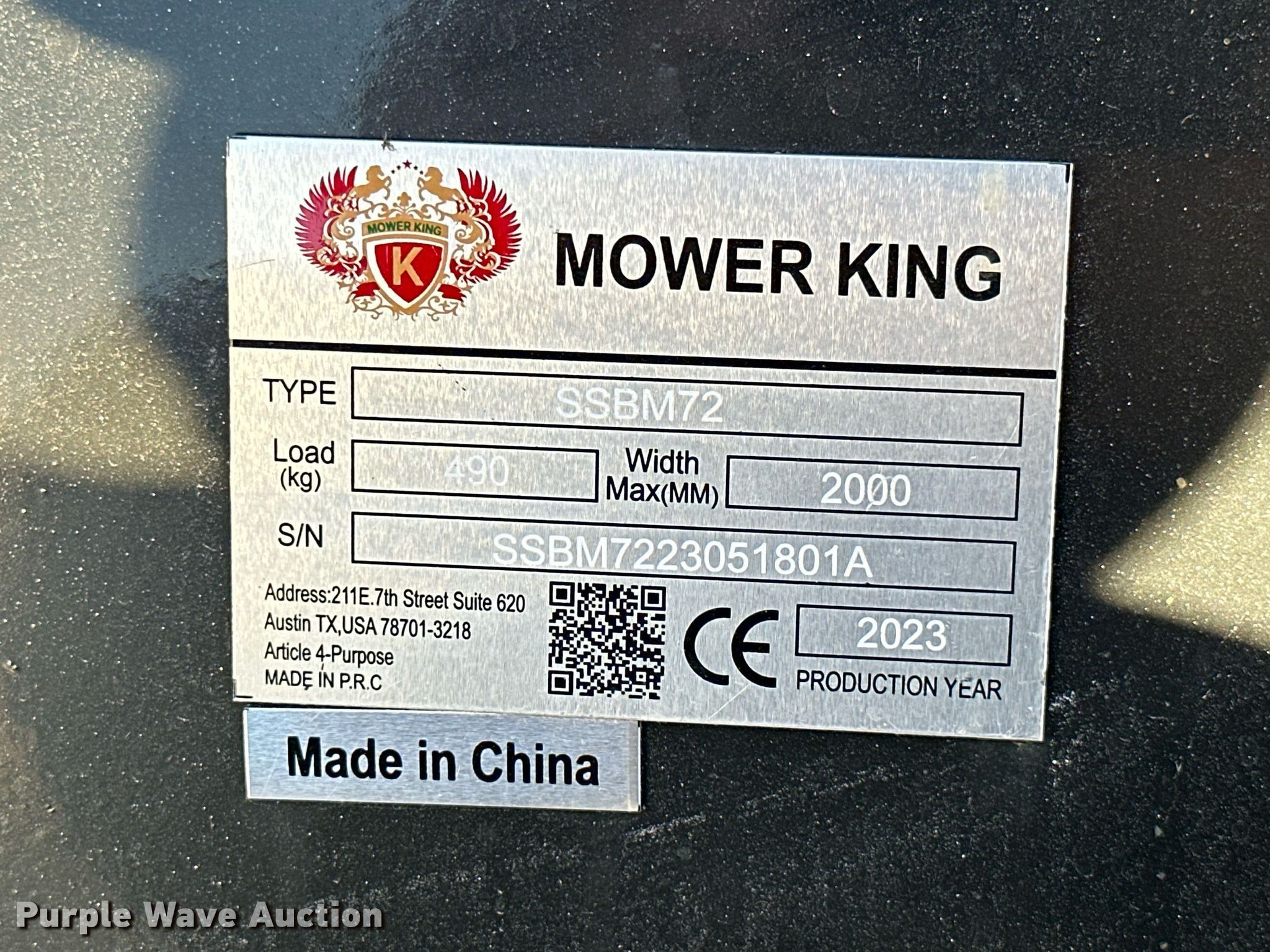 Purple Wave is selling a used Skid Steer Attach. in Oklahoma. This item is a 2023 Mower King SSBM72 skid steer sweeper with the following: Serial: SSBM7223051801A, Width: 72"