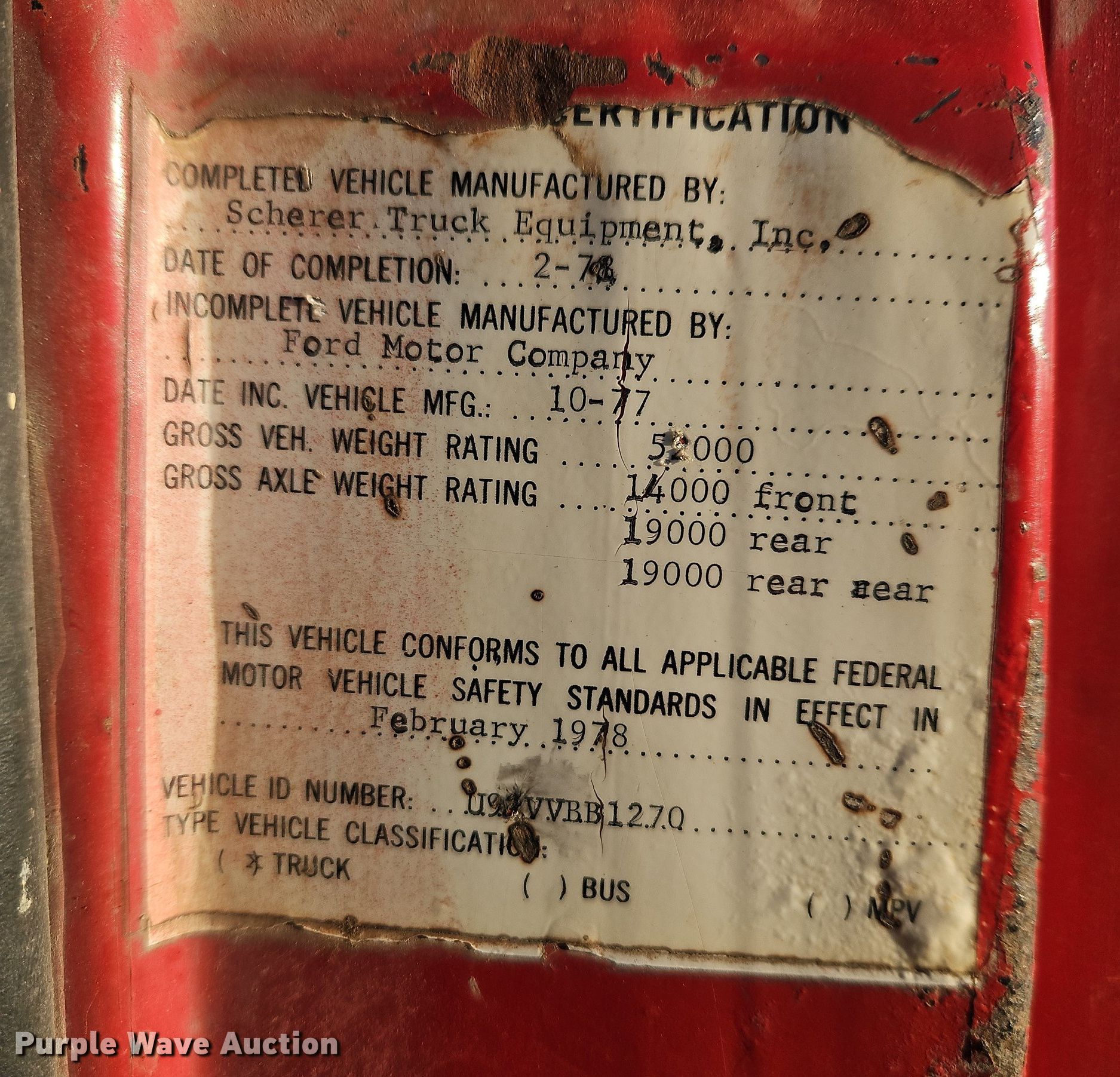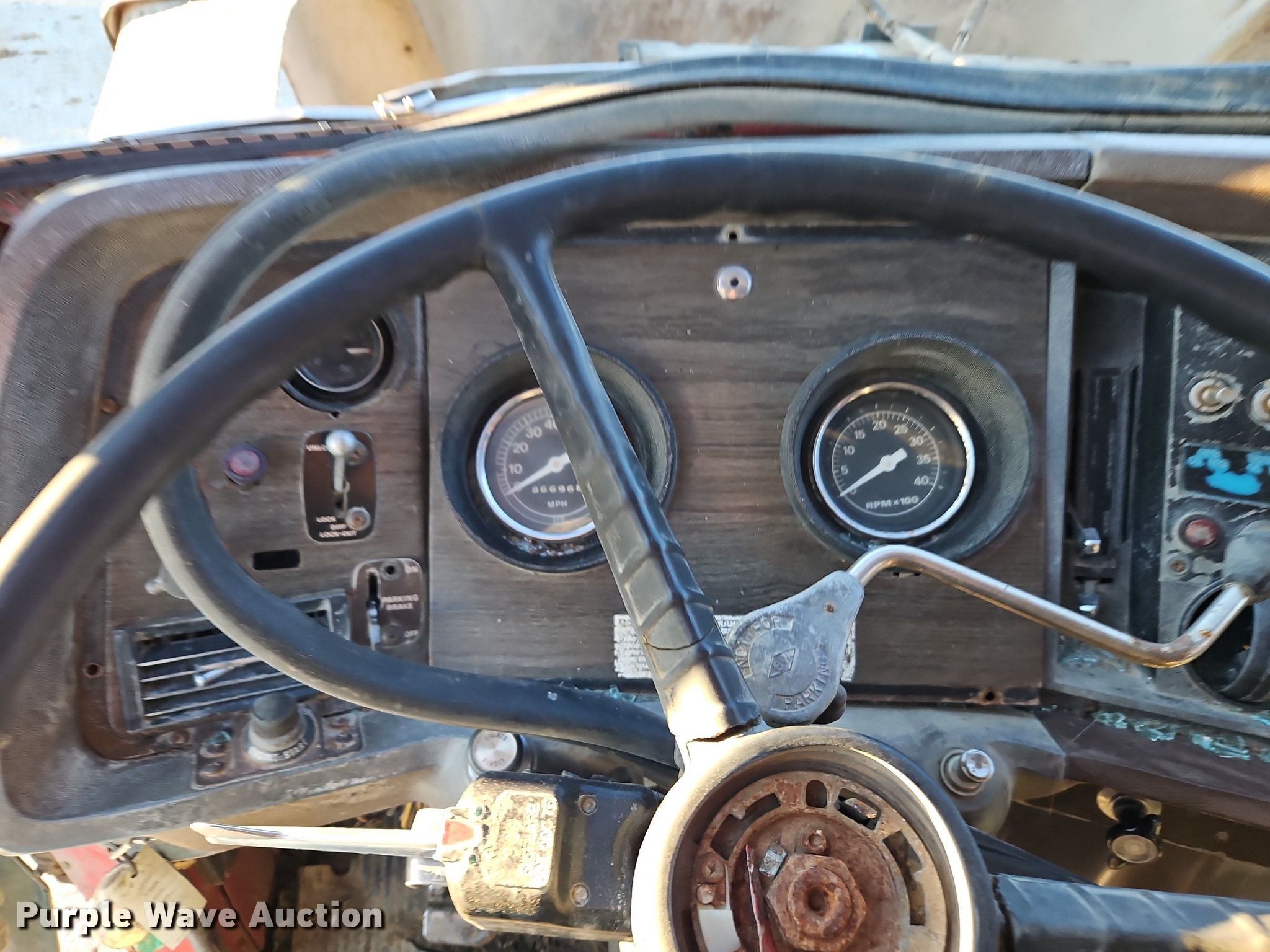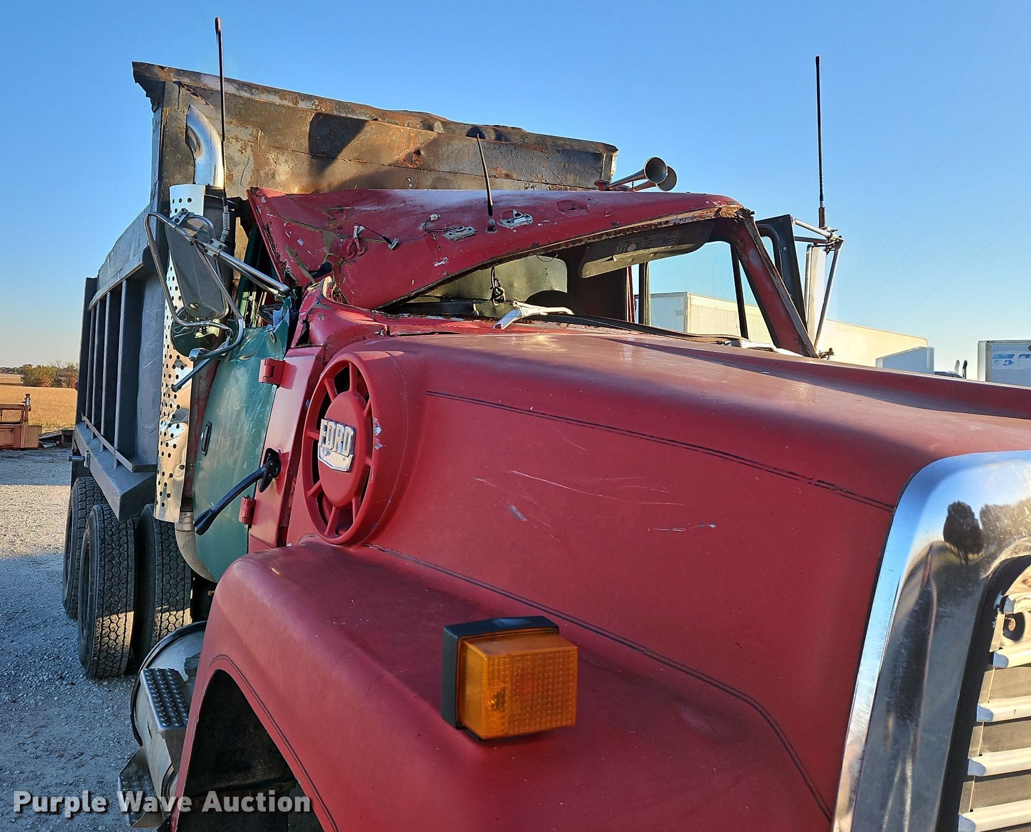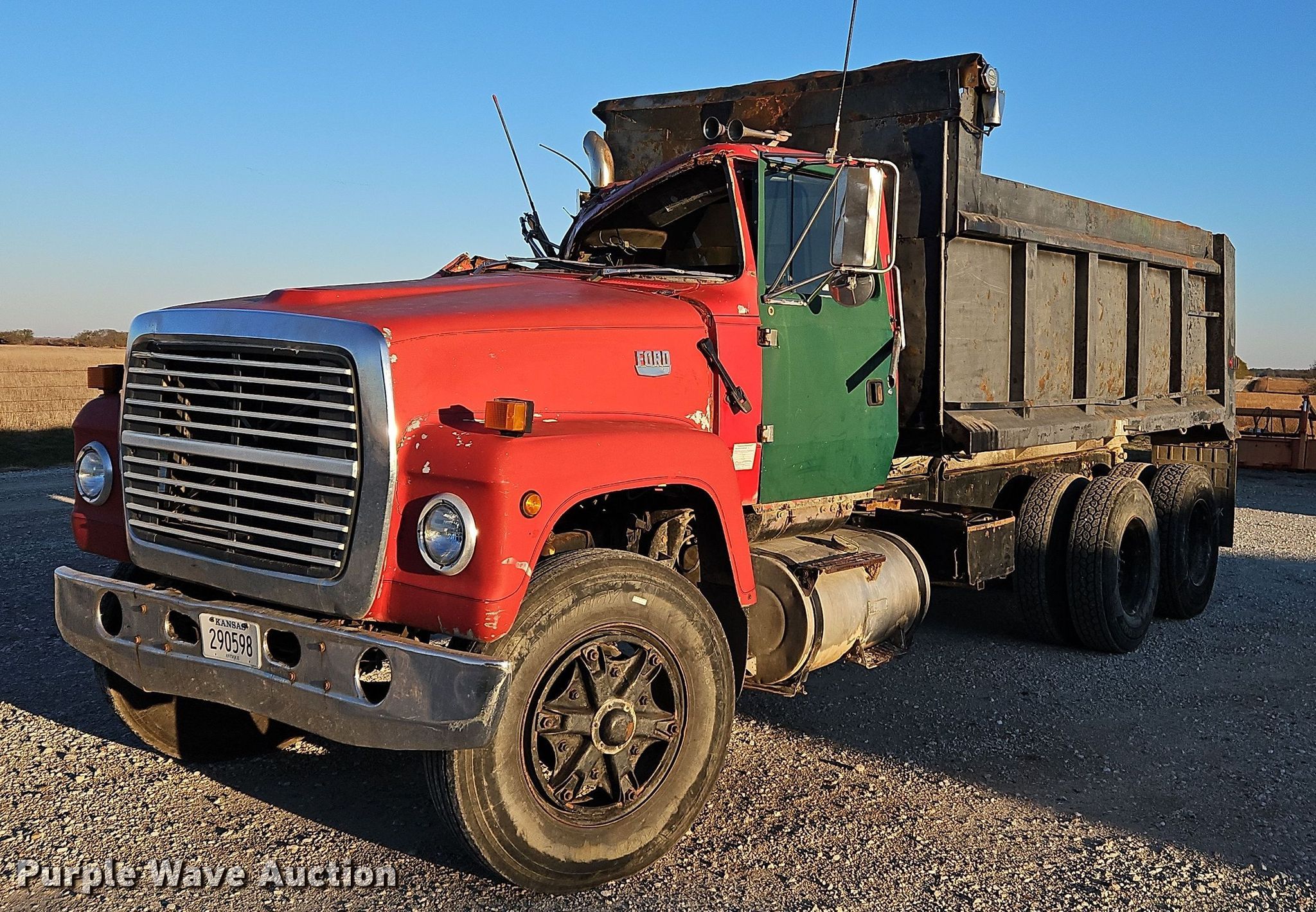 1978 Ford dump truck. Miles: 866,968 on odometer, VIN: U91VVBB1270. Engine Cummins , Cylinders: 6, Fuel type: Diesel. Transmission Roadranger RTO-9513-12513, Manual, Speed: 13. Chassis Double frame, Axles: Tandem, Suspension: Spring over walking beam, Brakes: Air, PTO, GVWR: 52,000 lbs FAWR: 14,000 lbs, IAWR: 19,000 lbs, RAWR: 19,000 lbs. Interior Heat. Features Dump bed 14' L x 8' W, Side height: 48", Bed type: Steel, Roll tarp, Ram: Single , End gate: Air operated. Tires Size: 11/R24.5. Notes Windshield chipped or cracked, Cad needs replaced, storm damage. Kansas antique title. Title distribution may be delayed up to 14 days from verification of funds. 1343 Rock Road. Yates Center, KS 66783