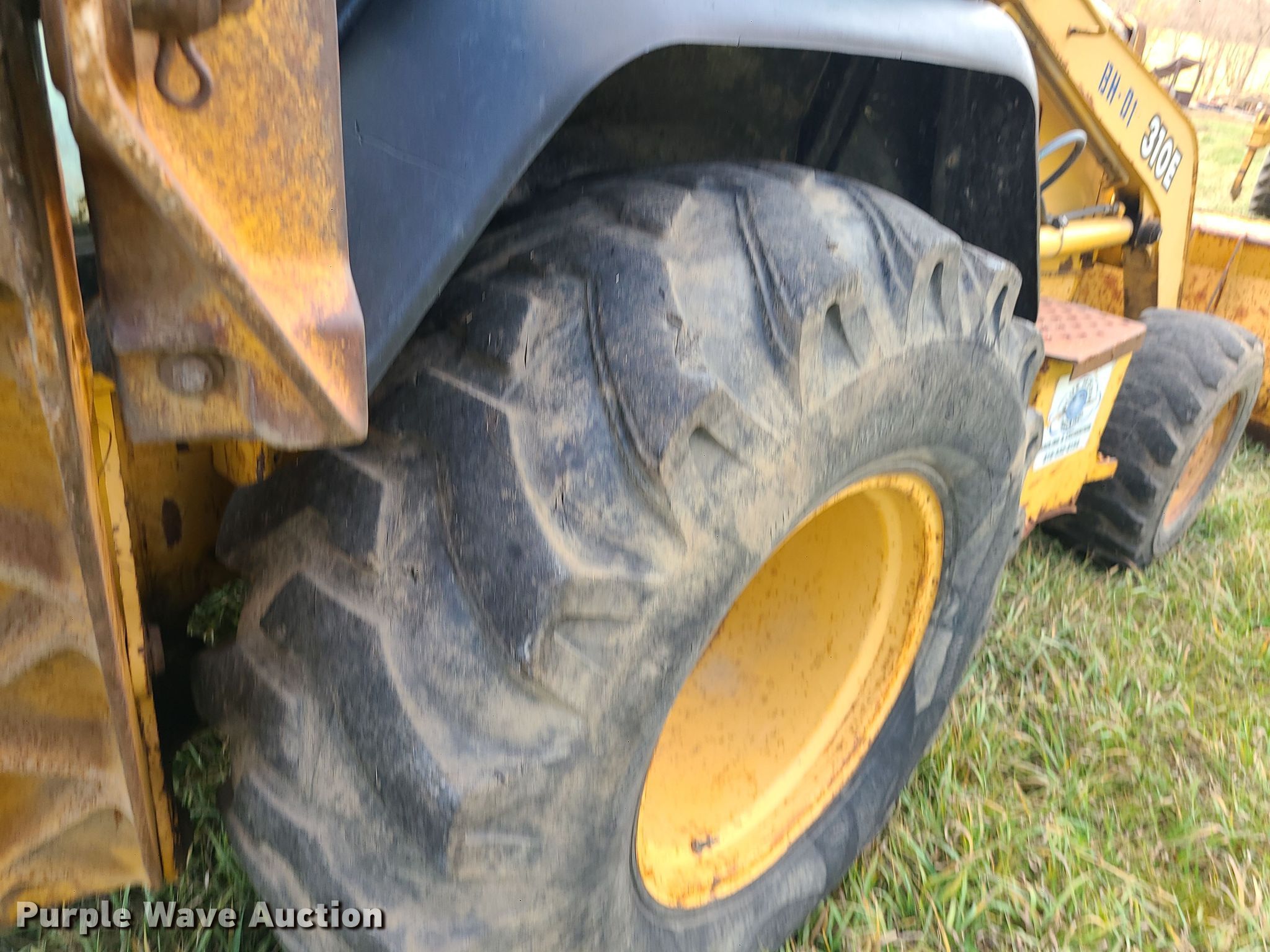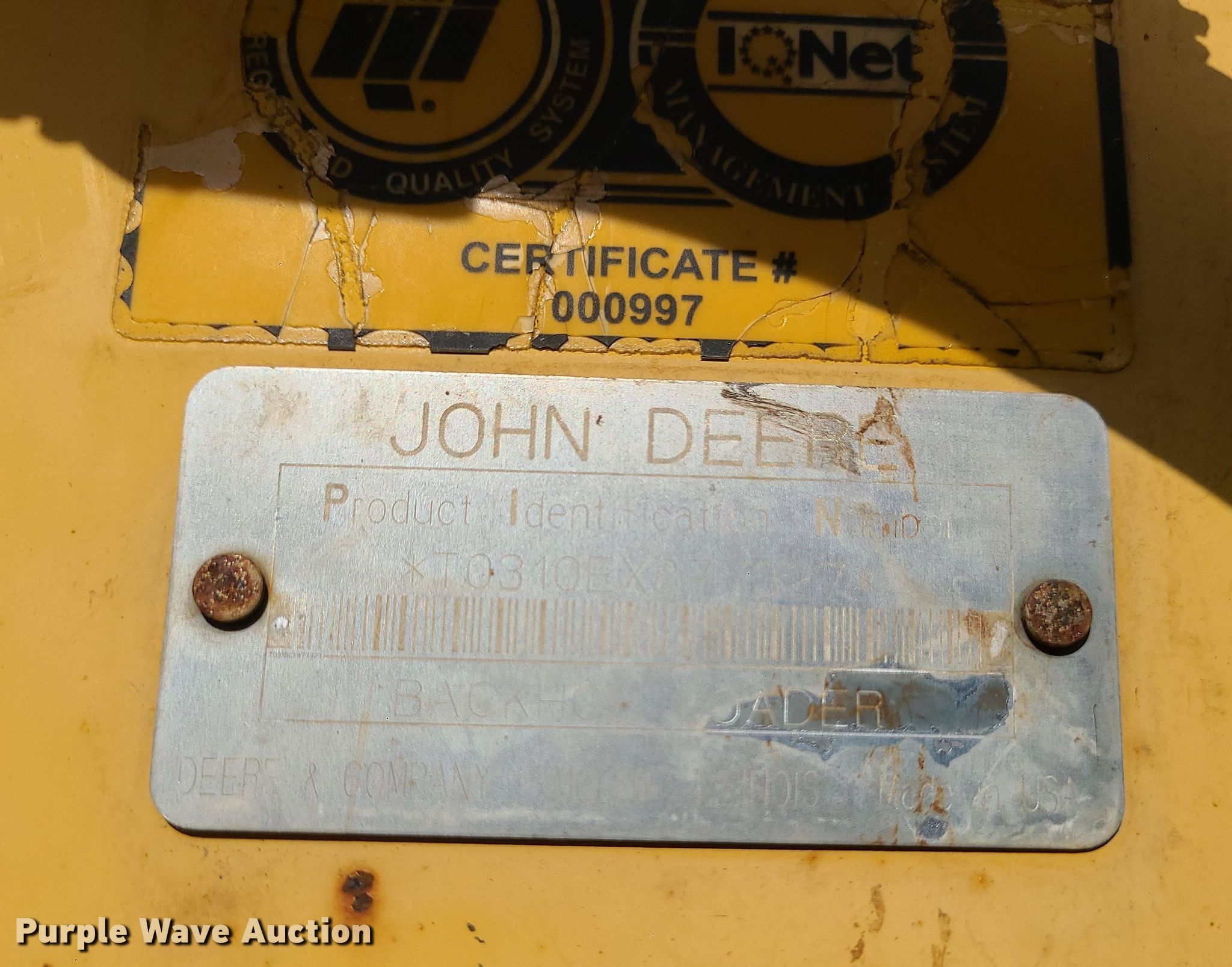 1999 John Deere 310E backhoe. Hours: 7,831 on meter, Serial: T0310EX877327. Engine Cylinders: 4, Fuel type: Diesel. Transmission Shuttle shift, 4F - 4R. Chassis Four wheel drive. Operators station Enclosed cab, Heat, Backhoe controls: Wobble stick / two stick. Features Loader Width: 86", Cutting edge: Bolt-on, Backhoe Extendable stick, Quick coupler: Manual, Auxiliary hydraulics, Width: 24". Tires Front: 12-16.5, Rear: 19.5-24. 13402 North Virginia Avenue. Smithville, MO 64089