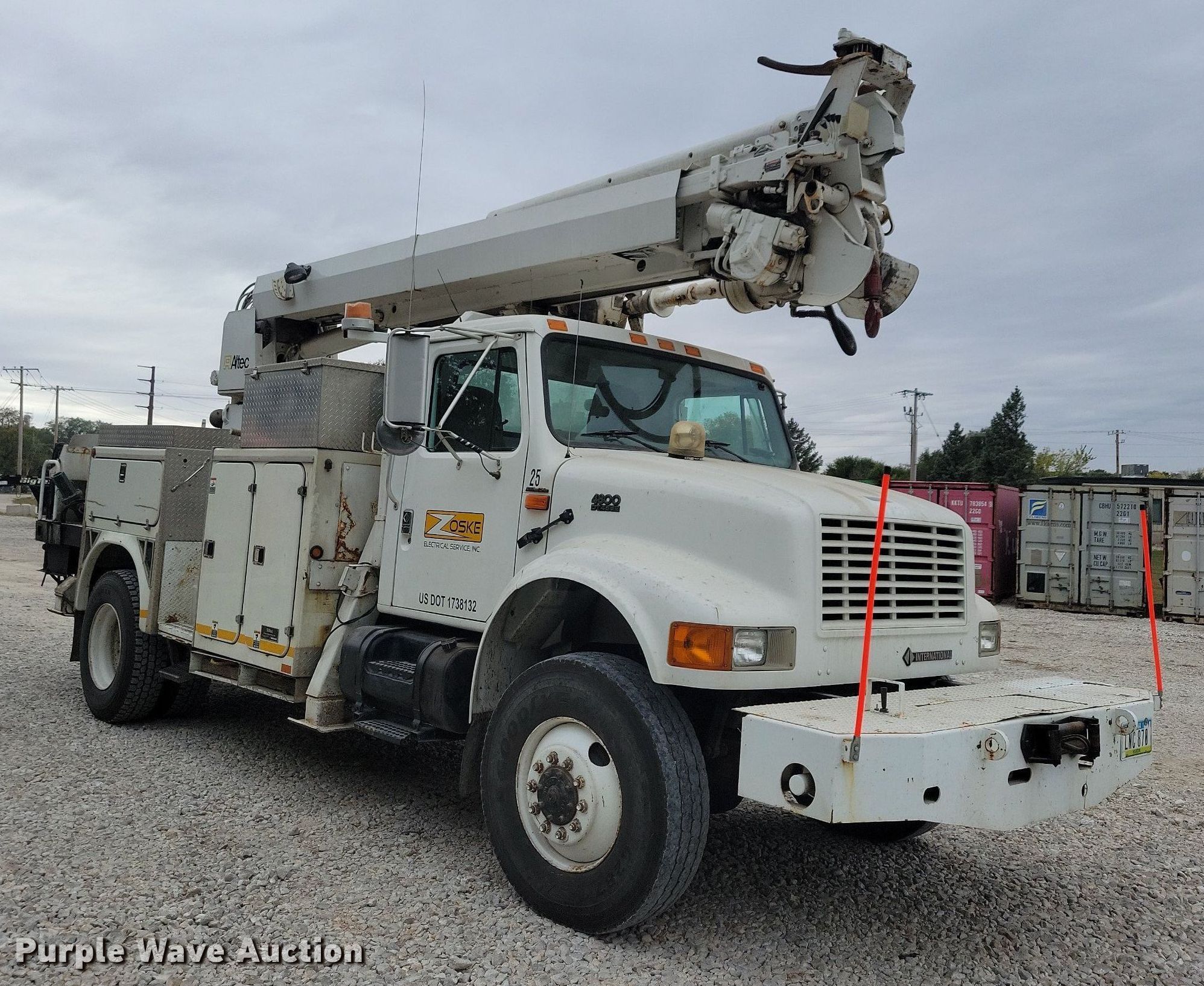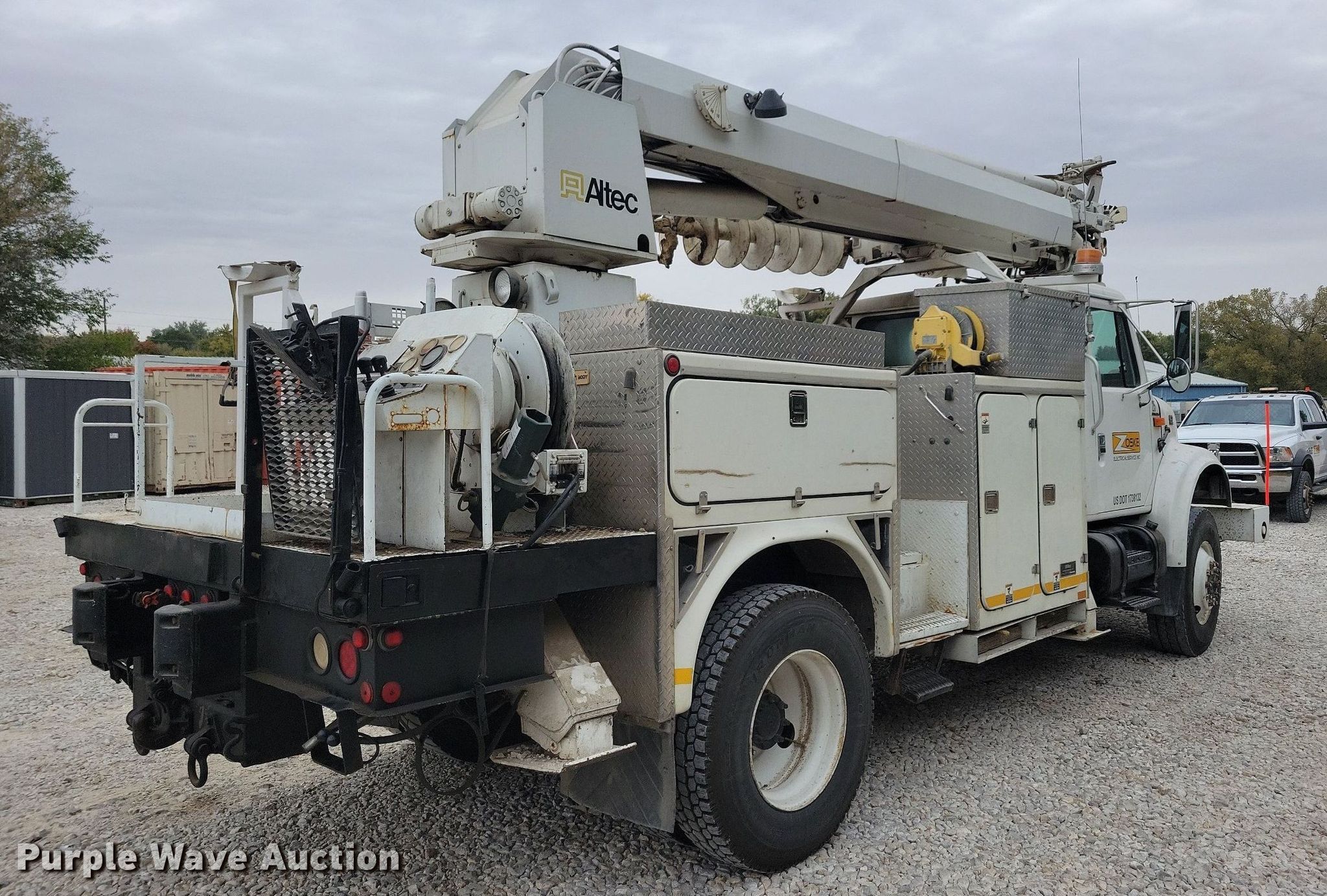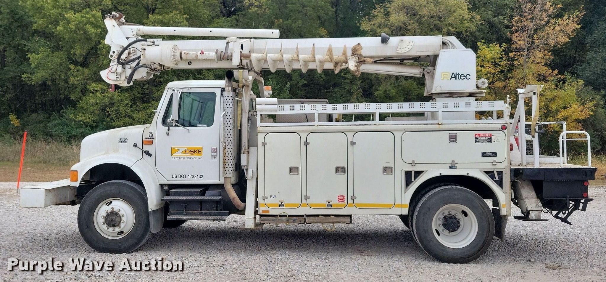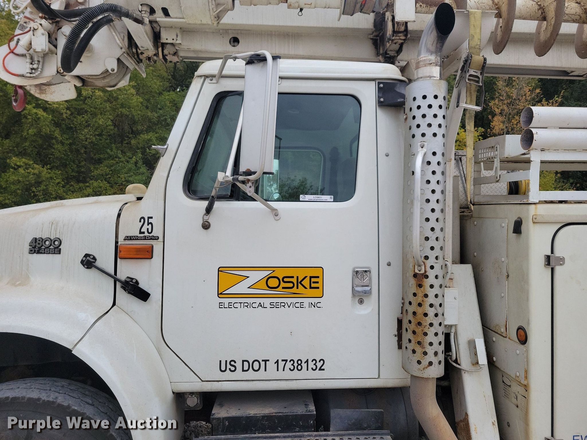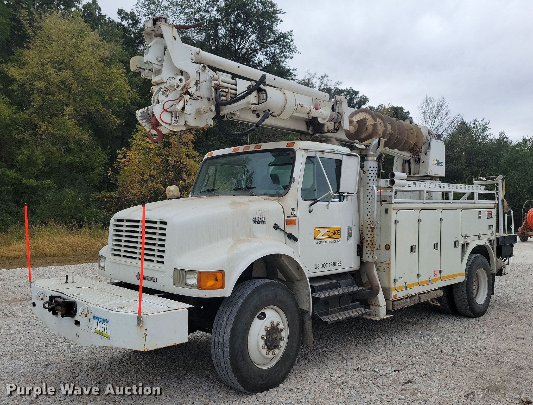 2001 International 4800 digger derrick truck. Miles: 149,235 on odometer, Hours: 11,009 on meter, Miles or hours may vary, unit still in use, VIN: 1HTSEAAR31H398498. Engine International DT466E, Displacement: 7.6L, Cylinders: 6, Fuel type: Diesel, HP: 230. Transmission Automatic. Chassis Four wheel drive, Axles: Single, Suspension: Spring, Brakes: Air, PTO, Wheelbase: 188". Interior AC, Heat, Heated mirrors, Cruise control, Auxiliary controls, Brake controller. Features Bed Fiber Body, Serial: 28260, 14.5' L x 96" W, Boom Altec 842, Boom length: 42', Mast height: 9', Maximum lift capacity: 2,850 lbs, Maximum lift height: 59', Boom type: Articulating, Telescopic, Man basket, Boom controls Platform/ basket, Remote control, Pressure digger, Material handler, Pole guide, Auger Diameter: 20", Hydraulic tamper. Tires Front: 12R22.5, Rear: 11R22.5. Notes Additional 27" auger, Contents not included. Iowa title. Title has a lien that will be released following the close of the auction. Title distribution may be delayed up to 30 days from verification of funds. Pursuant to Iowa law, Purple Wave will not be collecting sales taxes on any of the purchases made in this business liquidation auction. Zoske Electrical Services Retirement-Open inspection November 15. 124 Country Club Road. Iowa Falls, IA 50126