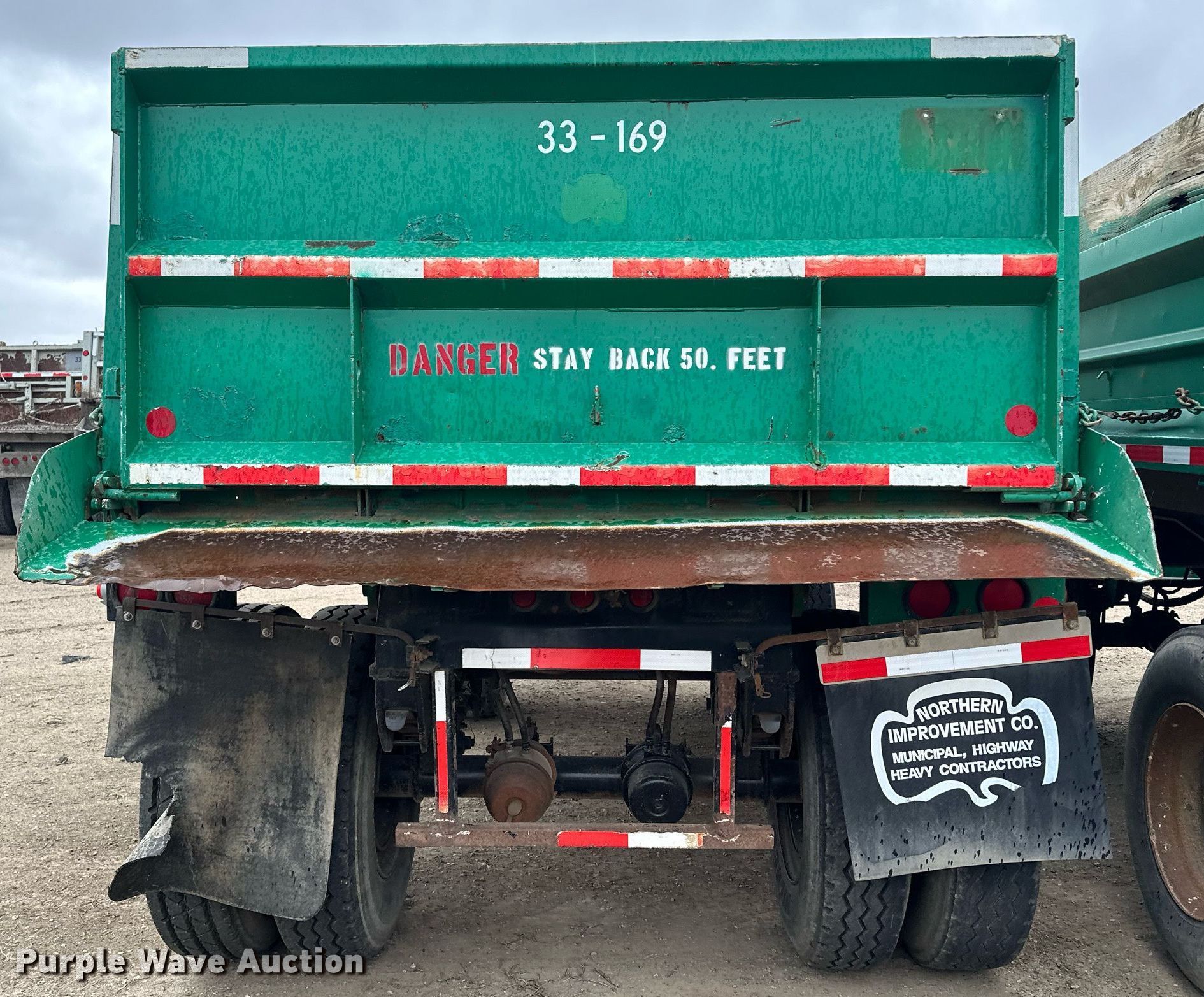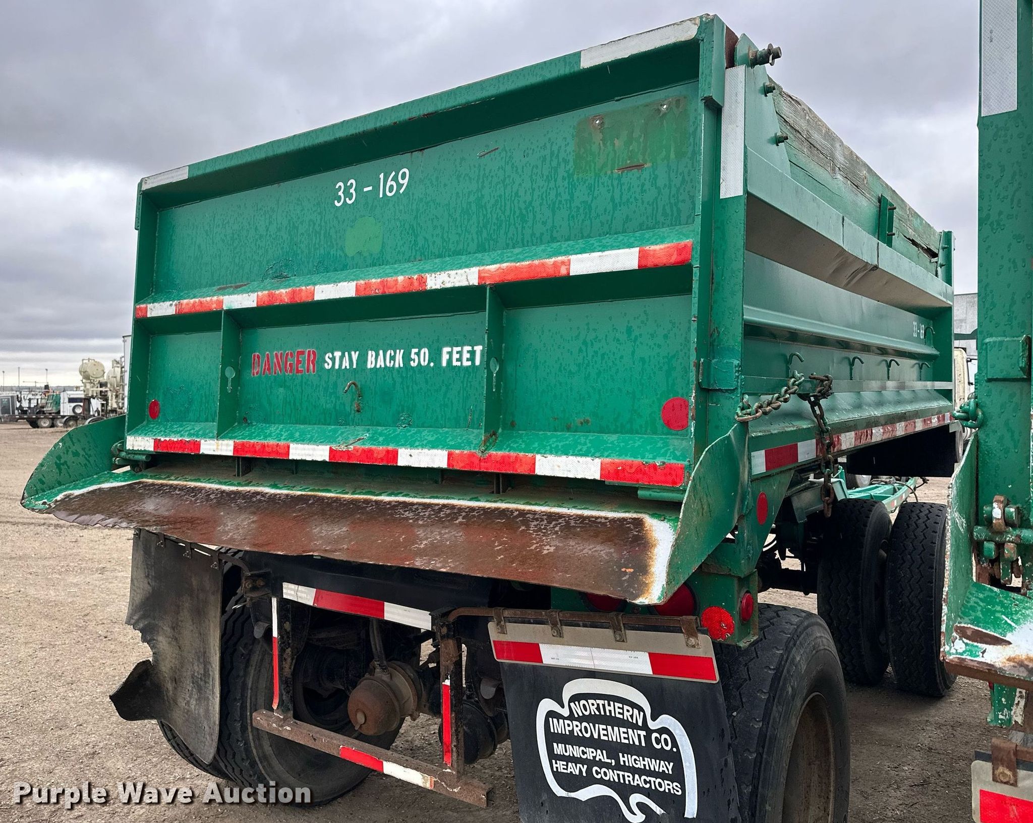 1986 Lode Master GT 13 end dump pup trailer. VIN: 2L90P13286W006270, Unit #: 33-169. Dimensions Overall: 32' 3" L x 96" W, Body: 13' L x 96" W, Side height: 2' 6", Sideboard height: 11". Features Body type: Steel, Ram: Single, End gate: Air operated. Chassis Hitch: Pintle, Landing gear: Single, Suspension: Spring, Brakes: Air, Axles: Tandem. Tires Steel wheels, Size: 11R22.5. North Dakota title. Title distribution may be delayed up to 14 days from verification of funds. Northern Improvement Co. 1721 Burlington Dr. Bismarck, ND 58504