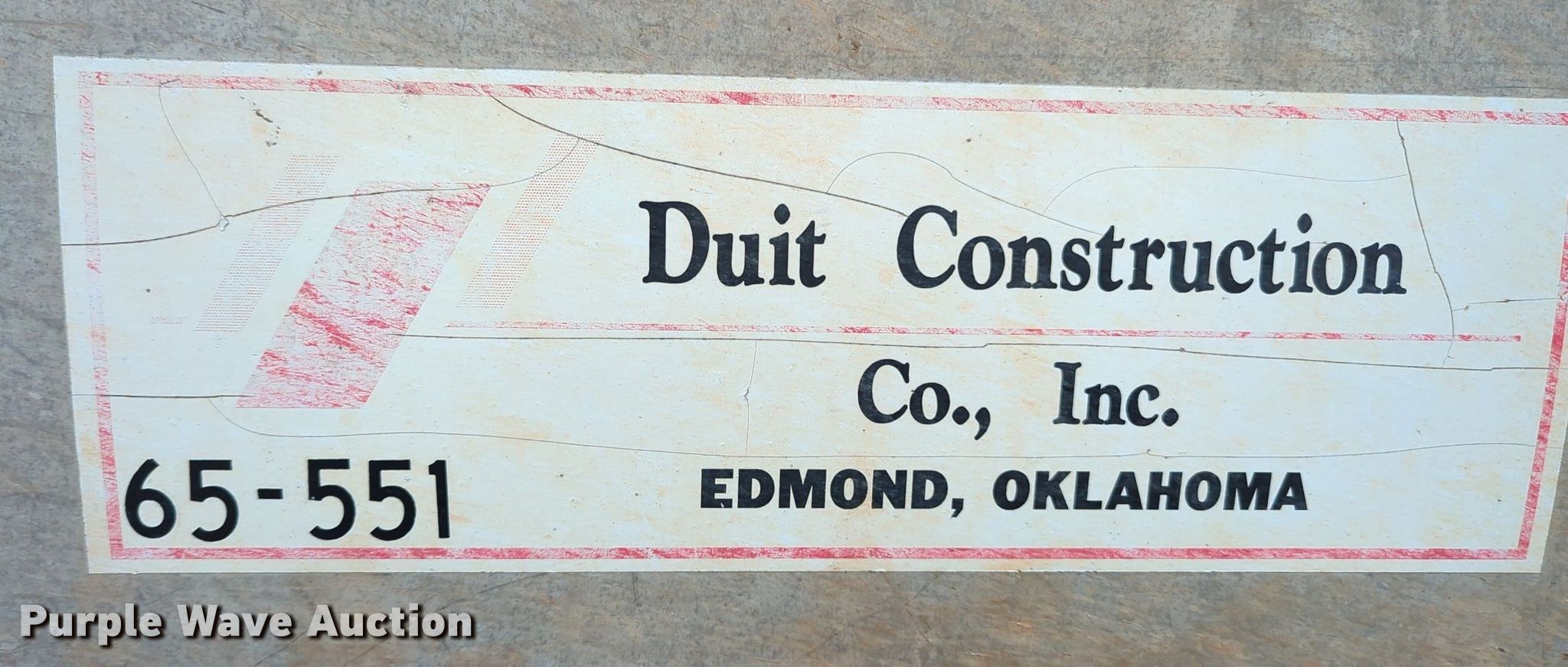 Fruehauf TAG-F2-ET tank trailer. VIN: UNM370302, Unit #: 65-551. Dimensions Overall: 27' L x 96" W. Features Tank type: Aluminum, No. of manways/manholes: 3 Width: 22", Pump Tsurumi TE3-80HA, Outlet size: 4". Chassis Landing gear: Dual, Suspension: Spring, Brakes: Air, Axles: Tandem. Tires Steel wheels, Size: 11R22.5. Oklahoma title. Title distribution may be delayed up to 30 days from verification of funds. Duit Holdings, Inc.. 7183 E Waterloo Industrial Road. Edmond, OK 73034