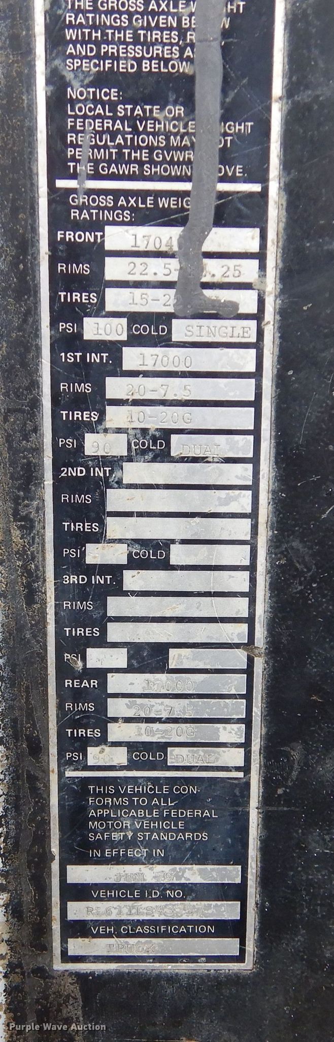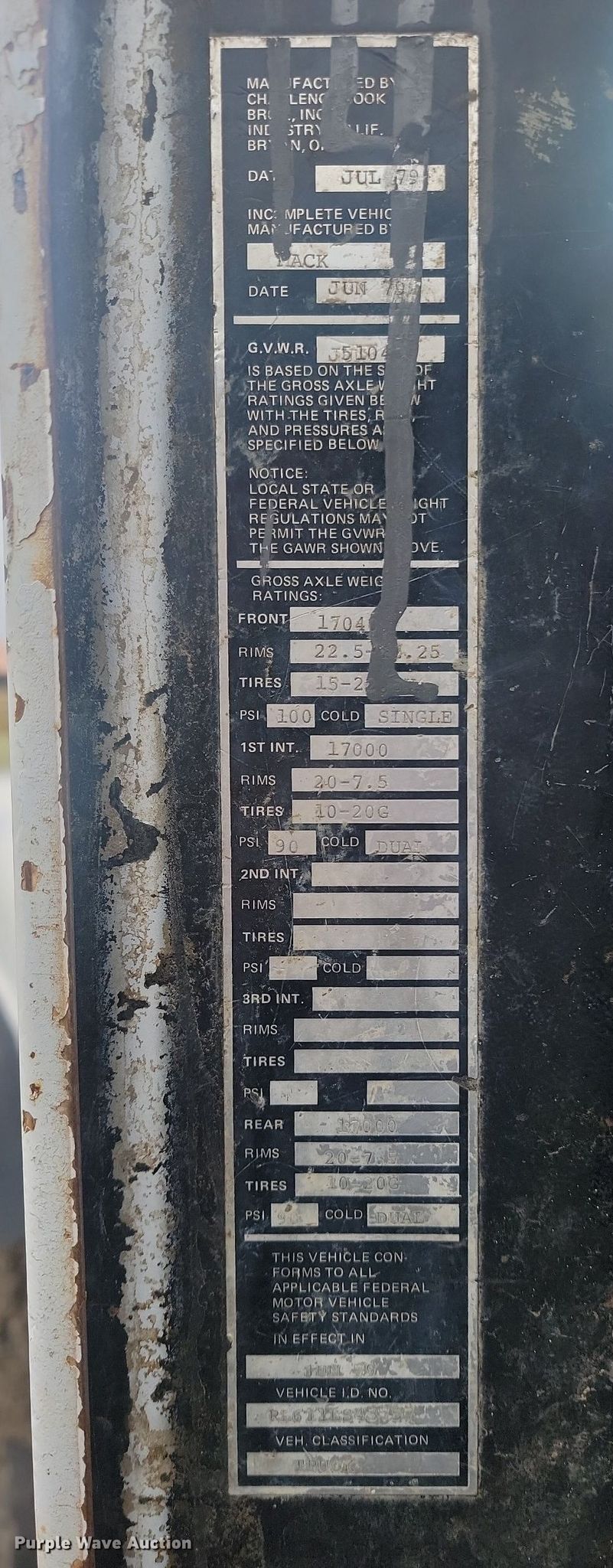 1979 Mack RL600L water truck. Miles: 176,983 on odometer, Hours: 8,198 on meter, VIN: RL611LS43757, Unit #: 224. Engine Mack, Displacement: 672 C.I.D., Cylinders: 6, Fuel type: Diesel, HP: 250. Transmission Automatic. Chassis Axles: Tandem, Suspension: Walking beam, Brakes: Air, PTO. Interior Heat. Features Bed / tank 15' L x 7' W, Water tank Spray bar: Front, Rear, Top fill, Sight tube. Tires Front: 385/65R22.5, Rear: 11R22.5. Notes Dead battery, Non-operational transmission, Non-operational unit. South Dakota title. Morris Inc.. Fort Pierre, SD 57532