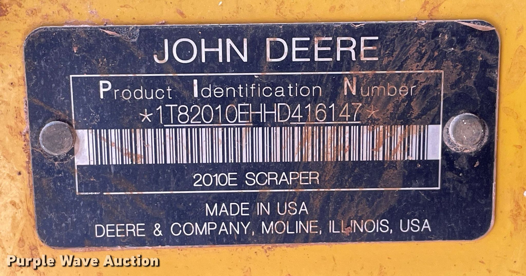 2017 John Deere 2010DE scraper. Serial: 1T82010EHHD416147. Features Bowl capacity: 20 cu.yd., Hydraulic lift, Hitch: Scraper, Rear. Tires Size: 20.5R25. Dutton Rent-All, Inc.. 711 N Industrial Blvd. Lindsay, OK 73052
