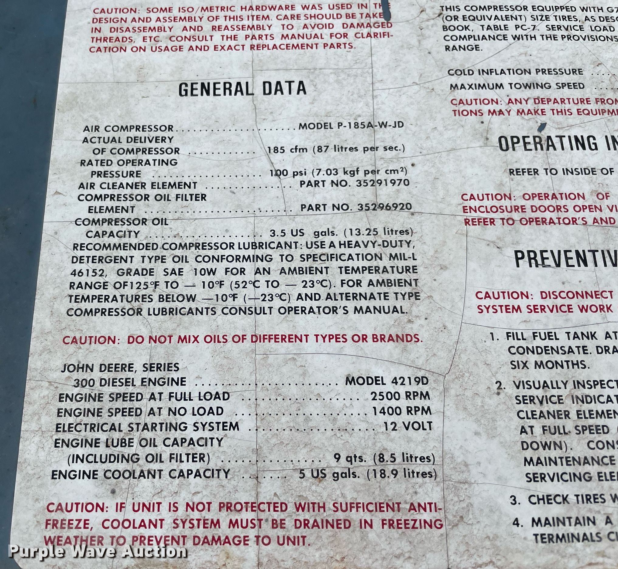Ingersoll Rand air compressor. Hours: 3,003 on meter, Serial: 123385U81957. Engine John Deere 4219DF 01, Serial: 575488T, Cylinders: 4, Fuel type: Diesel. Features Air compressor CFM: 185, PSI: 100. Trailer 12' L x 78" W, Ball hitch size: 2", Suspension: Spring, Axles: Single, Tire size: ST225/75R15. Notes Non-operational unit. Transfer of ownership documentation will be a bill of sale. Dutton Rent-All, Inc.. 711 N Industrial Blvd. Lindsay, OK 73052