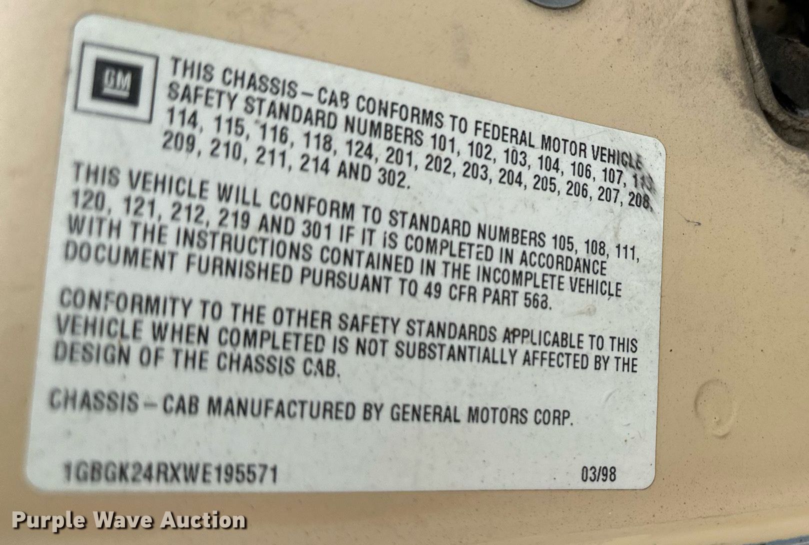 Purple Wave is selling a used 3/4 or 1 Ton Pickup or Van in Kansas. This item is a 1998 Chevrolet 2500 pickup truck cab and chassis with the following: Miles: 200,733 on odometer, VIN: 1GBGK24RXWE195571