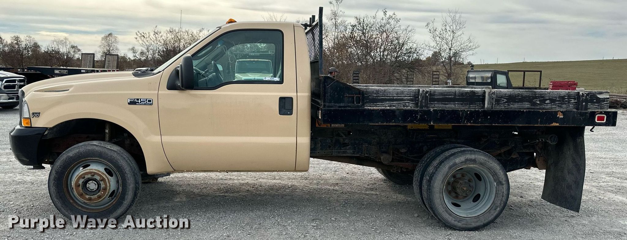 This 2003 Ford F450 Super Duty XL dump flatbed truck will sell to the highest bidder regardless of price.