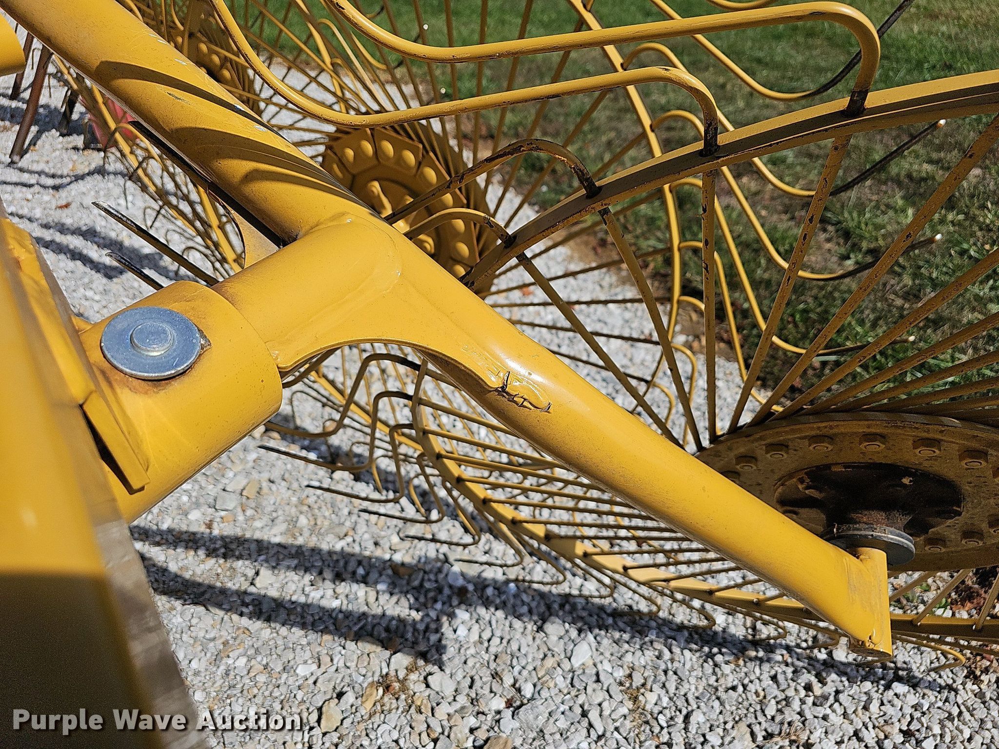 Vermeer VR1022 hay rake. Serial: 1VRA201B9D1006737. Features Width: 22' 6", Wheels: 8 Diameter: 55", Hydraulic fold. Tires Size: ST205/75D15. Notes (2) wheels missing, wheel arm missing, Arm bent. Brian Turner retirement. 8387 Missouri 123. Walnut Grove, MO 65770