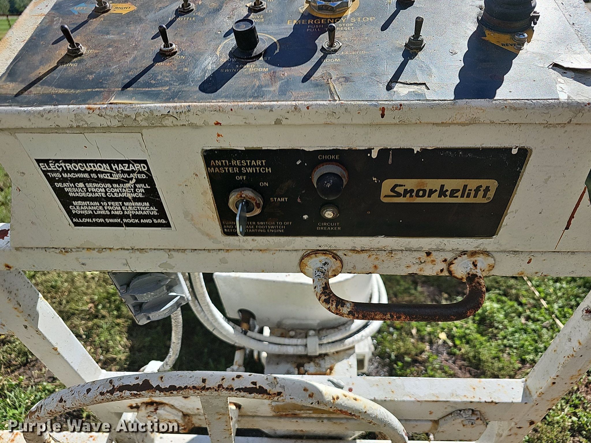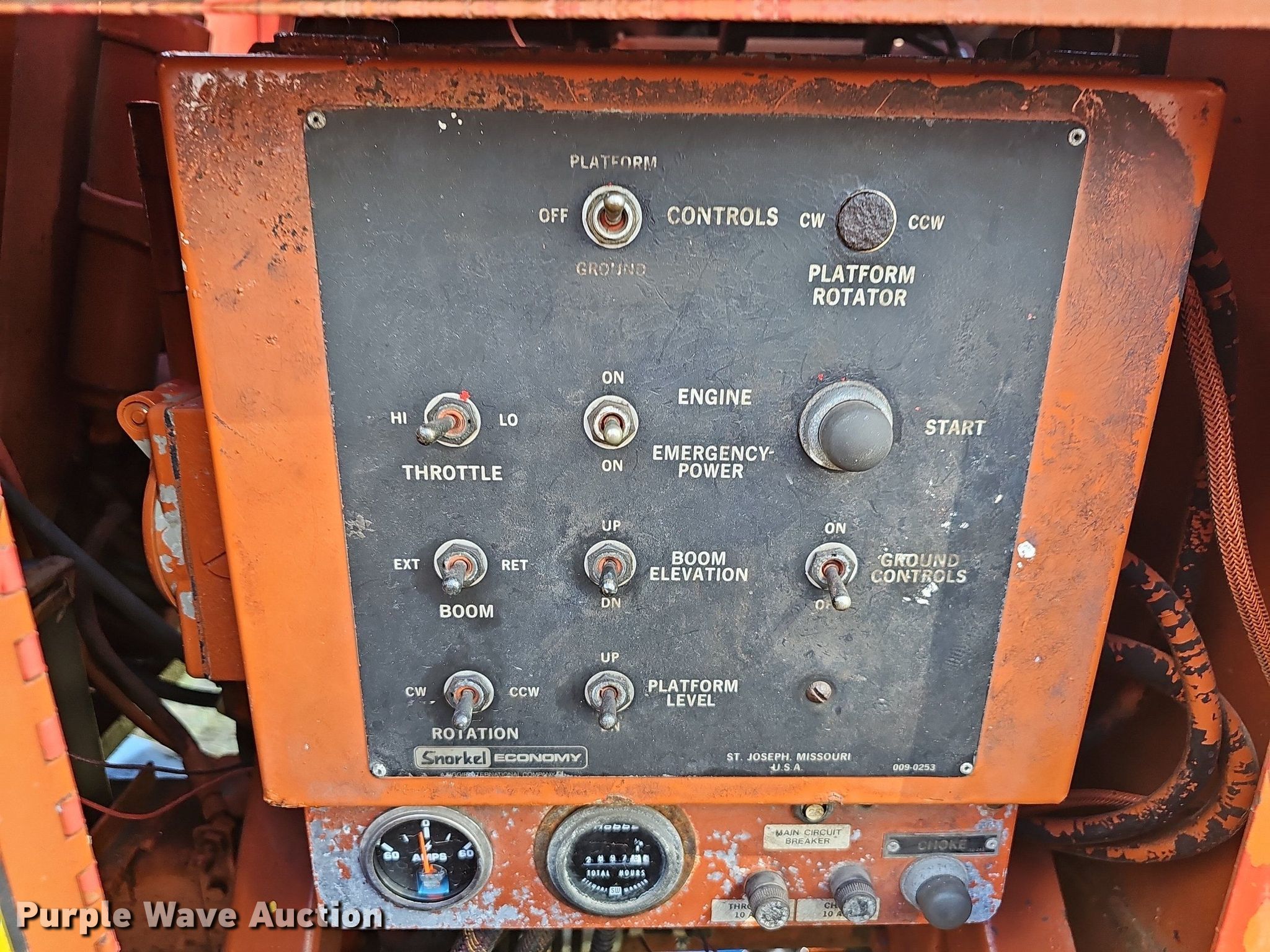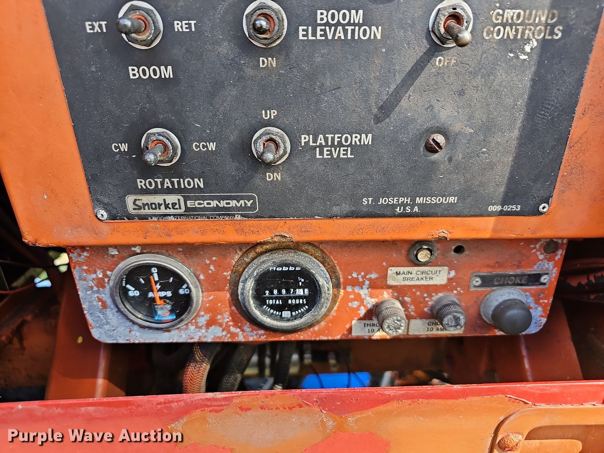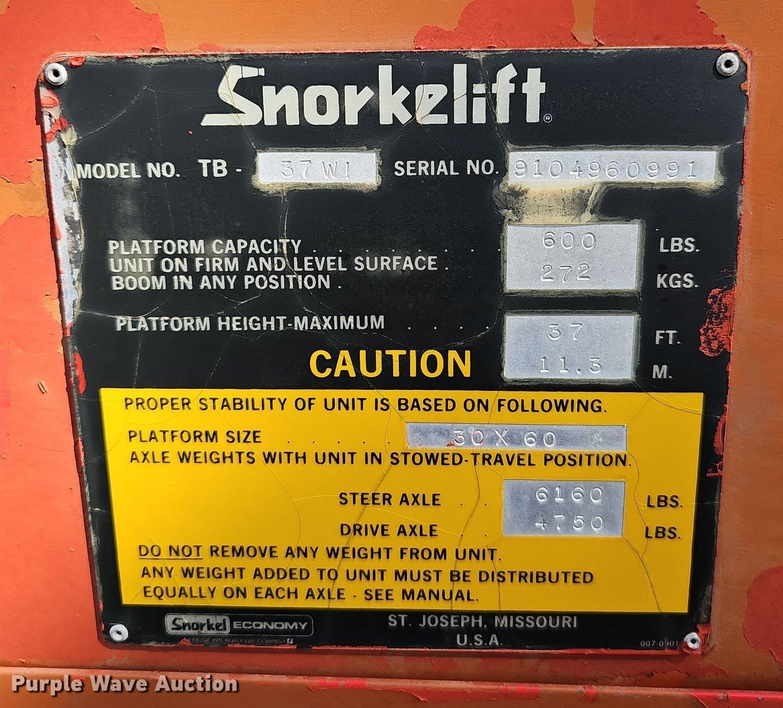 Snorkel 37WI boom lift. Hours: 2,897 on meter, Serial: 9104960991. Engine Cylinders: 4, Fuel type: Gas. Features Rough terrain, Maximum lift capacity: 600 lbs, Maximum lift height: 37', Platform: 30" L x 60" W, AC power outlet, Controls: Platform, Ground, Platform rotation: Hydraulic. Tires Tire size: 12-16.5. Brian Turner retirement. 8387 Missouri 123. Walnut Grove, MO 65770
