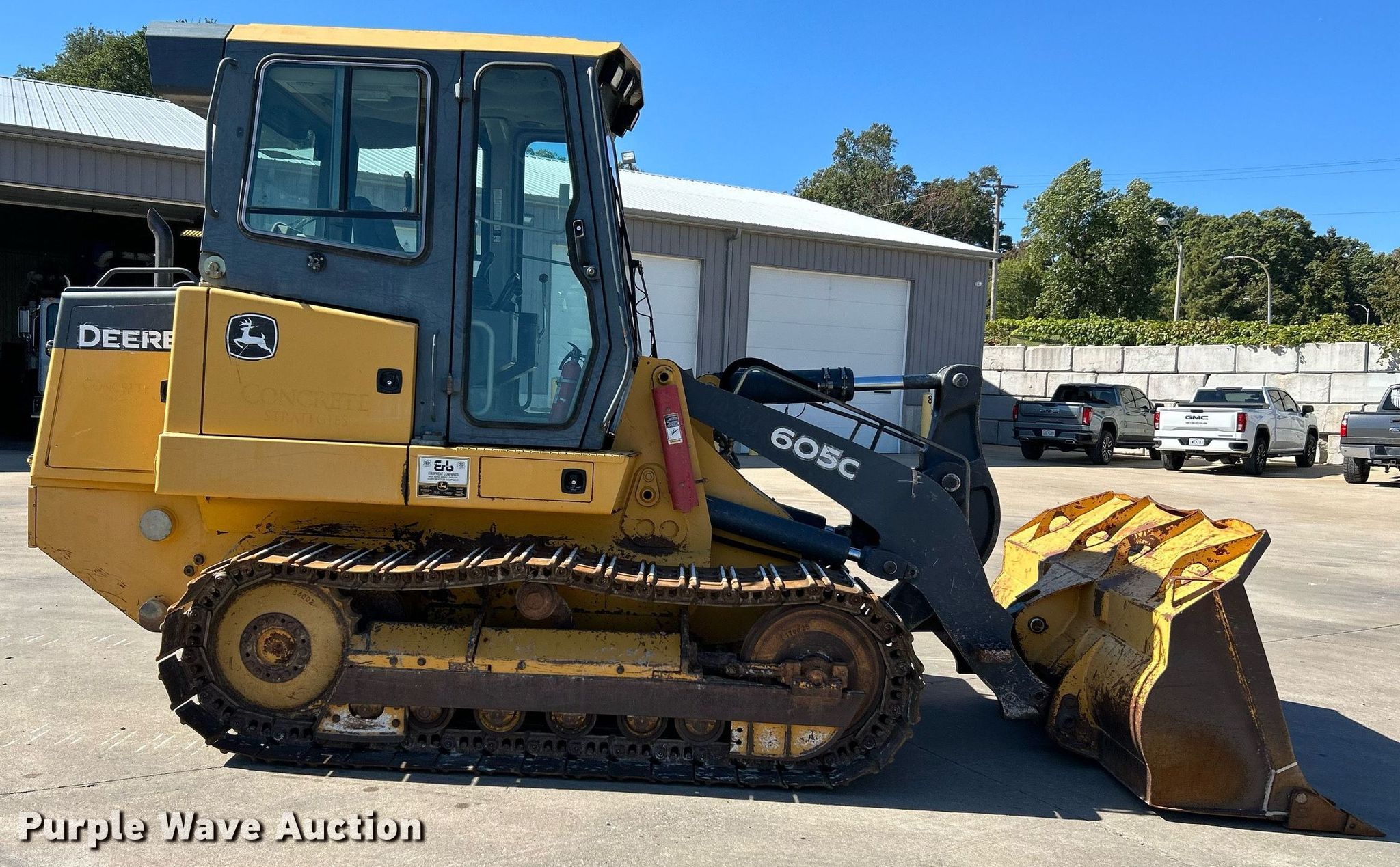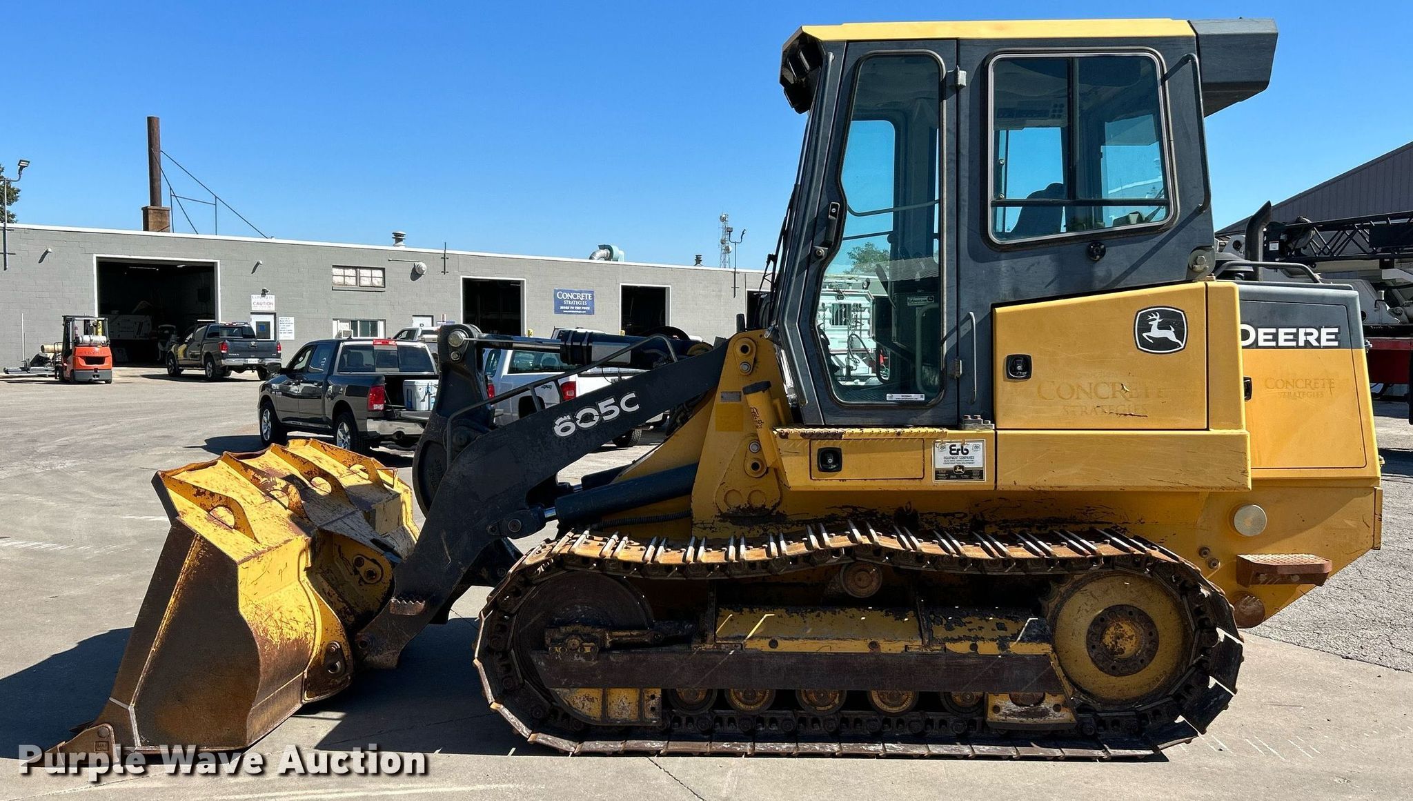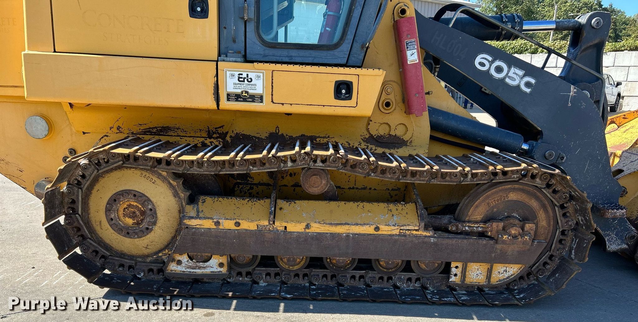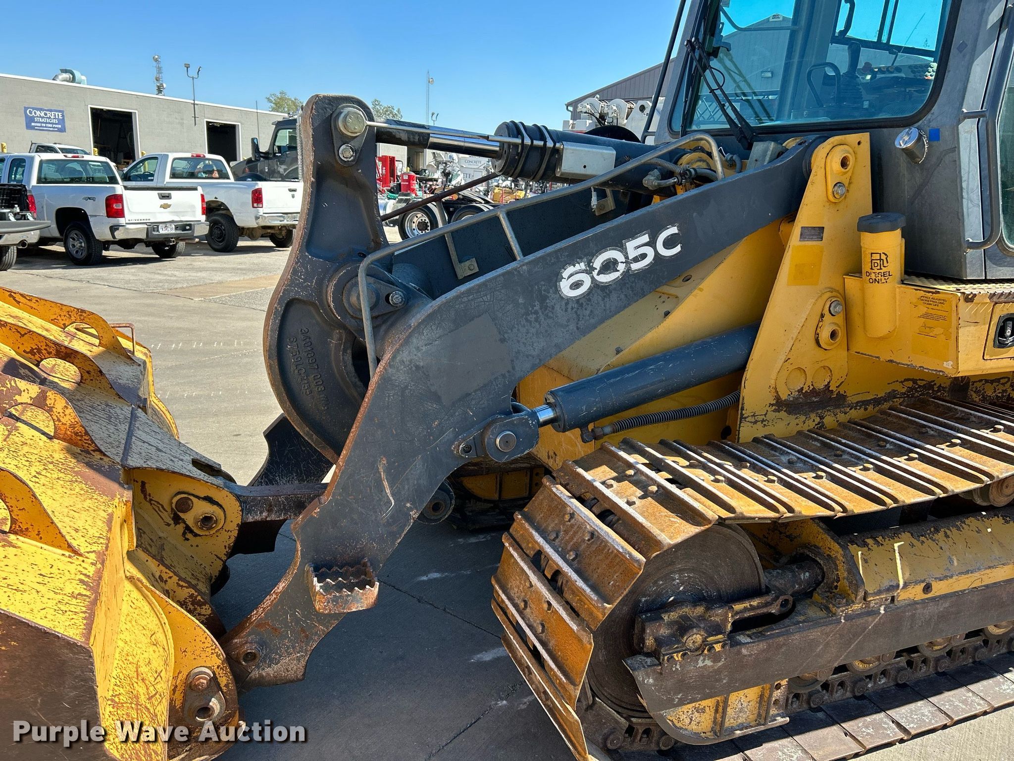 2012 John Deere 605C track loader. Hours: 3,568 on meter, Serial: LU605CX009134. Engine John Deere 4045TF278, Displacement: 4.5L, Cylinders: 4, Fuel type: Diesel. Transmission Hydrostatic. Operators station Enclosed cab, AC, Heat, Bucket controls: Joystick. Features Bucket Width: 88", Cutting edge: Bolt-on, Teeth: 8. Tracks Width: 20", Grouser pads: Double. Concrete Strategies, LLC. St. Louis, MO 63040