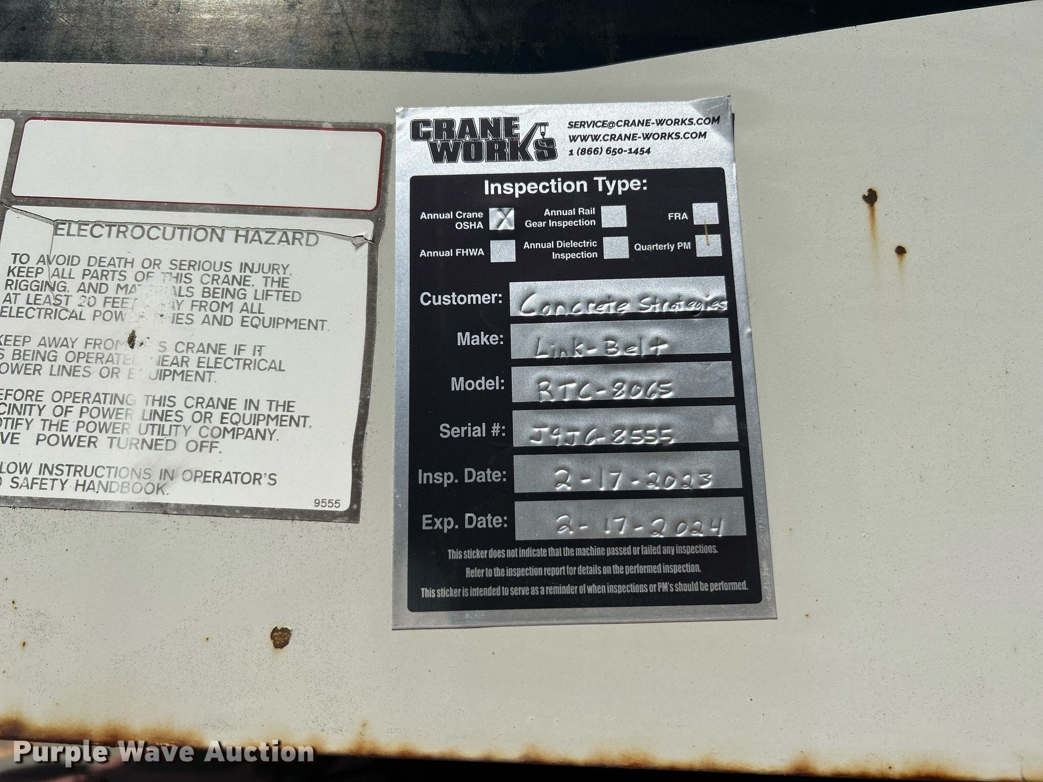 2006 Link-Belt RTC8065 Series II crane. Hours: 11,568 on meter, Serial: J9J6-8555. Engine Caterpillar 3126, Displacement: 7.2L, Cylinders: 6, Fuel type: Diesel. Transmission Powershift. Chassis Brakes: Hydraulic. Operators station Enclosed cab, AC, Heat, Crane controls: Joysticks, Upper interior Load monitor Link-Belt.. Features Boom Telescopic, Maximum boom length: 115' Sections: 4, Jib: 58', Stabilizers: 4, Boom controls In-cab, Winches: 2, Removable counter weight, Crane block Sheaves: 4, Capacity: 120,000 lbs, Crane ball & hook, Certification valid through: 02/2024, Manuals, Lift chart. Tires Size: 26.5-25. Concrete Strategies, LLC. St. Louis, MO 63040
