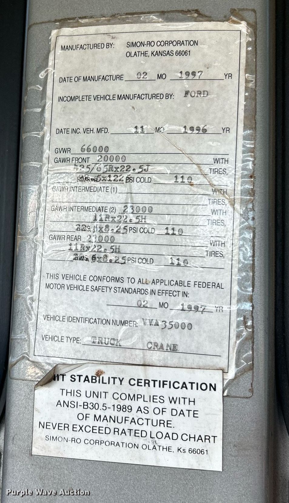 Purple Wave is selling a used Crane Truck in Missouri. This item is a 1997 Ford LT9513 crane truck with the following: Miles: 343,984 on odometer, Hours: 7,011 on meter, VIN: 1FDZS96P8VVA35000