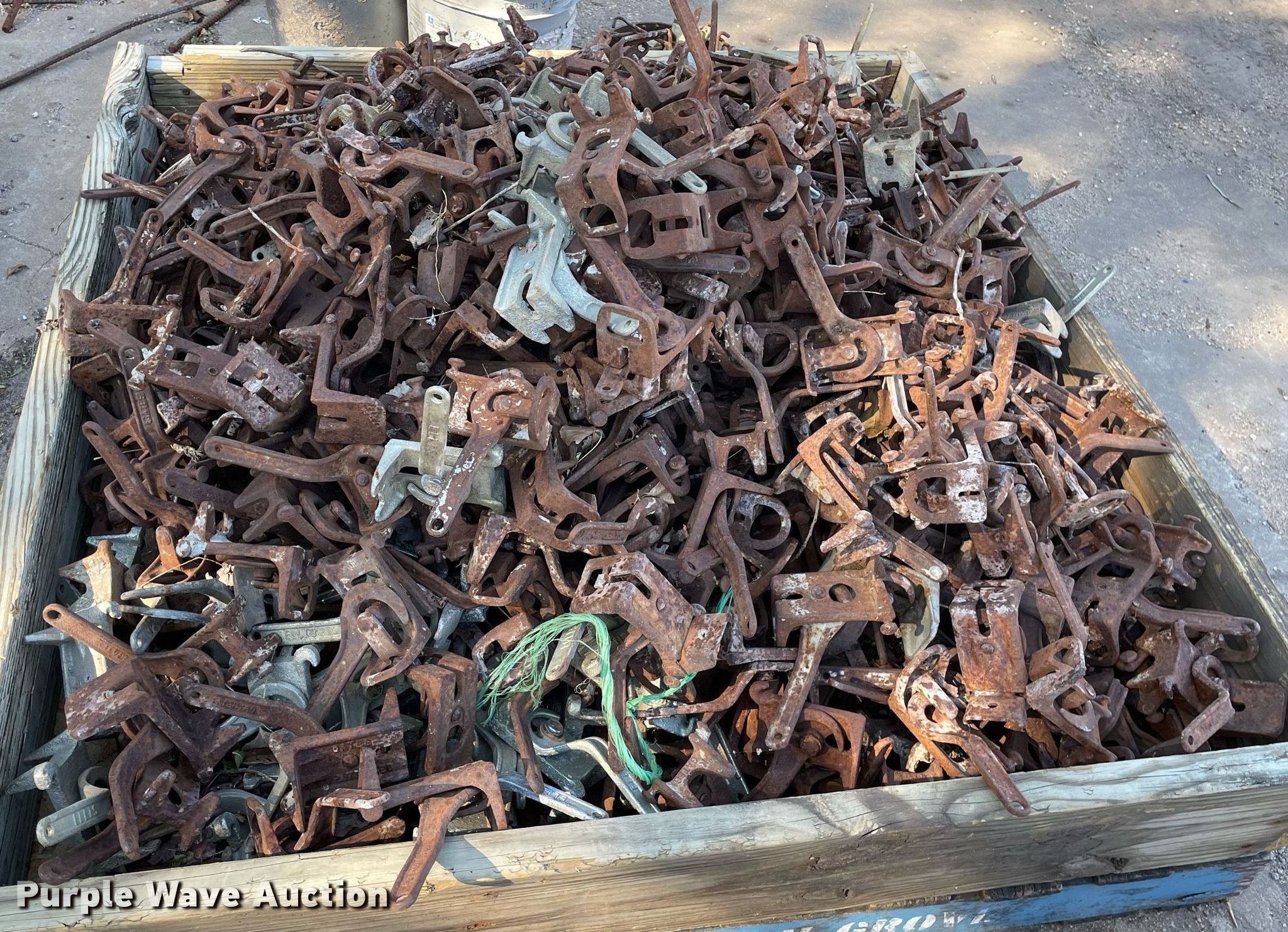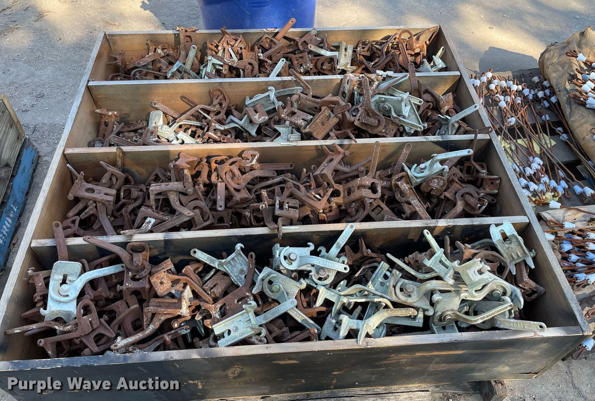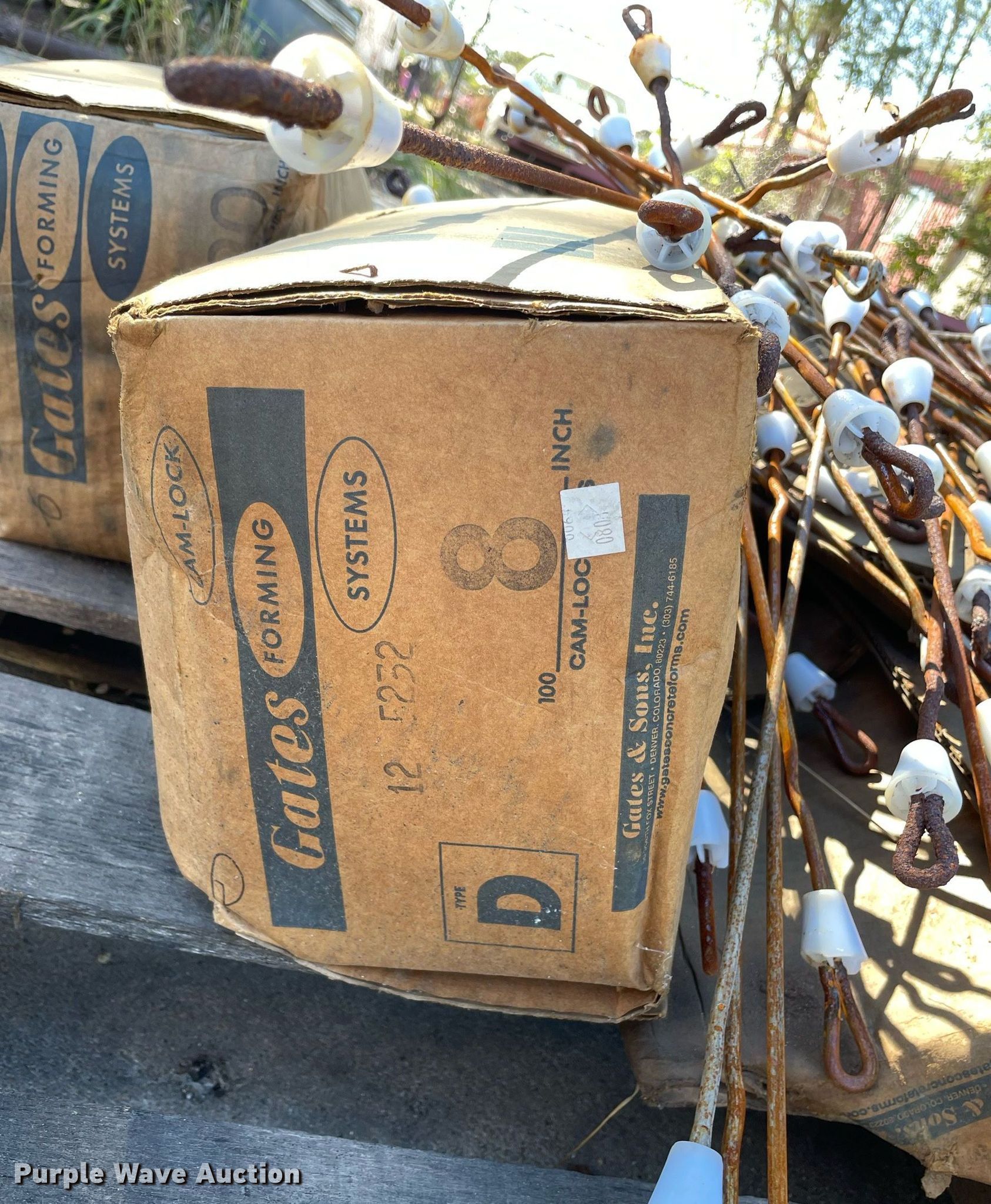 Purple Wave is selling a used Concrete Equip. or Acces. in Kansas. This item is a Concrete equipment with the following: (3) pallets of tielock brackets/cam locks, Approx. 1,545, (3) buckets strongback brackets, Pallet of wall ties, (20) wall braces, Approx. 500 rebar safety caps