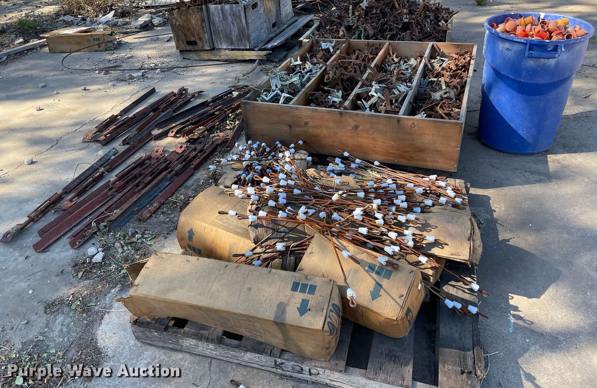 Concrete equipment. (3) pallets of tielock brackets/cam locks Approx. 1,545, (3) buckets strongback brackets, Pallet of wall ties, (20) wall braces, Approx. 500 rebar safety caps. Sutherland Builders. Wichita, KS 67217