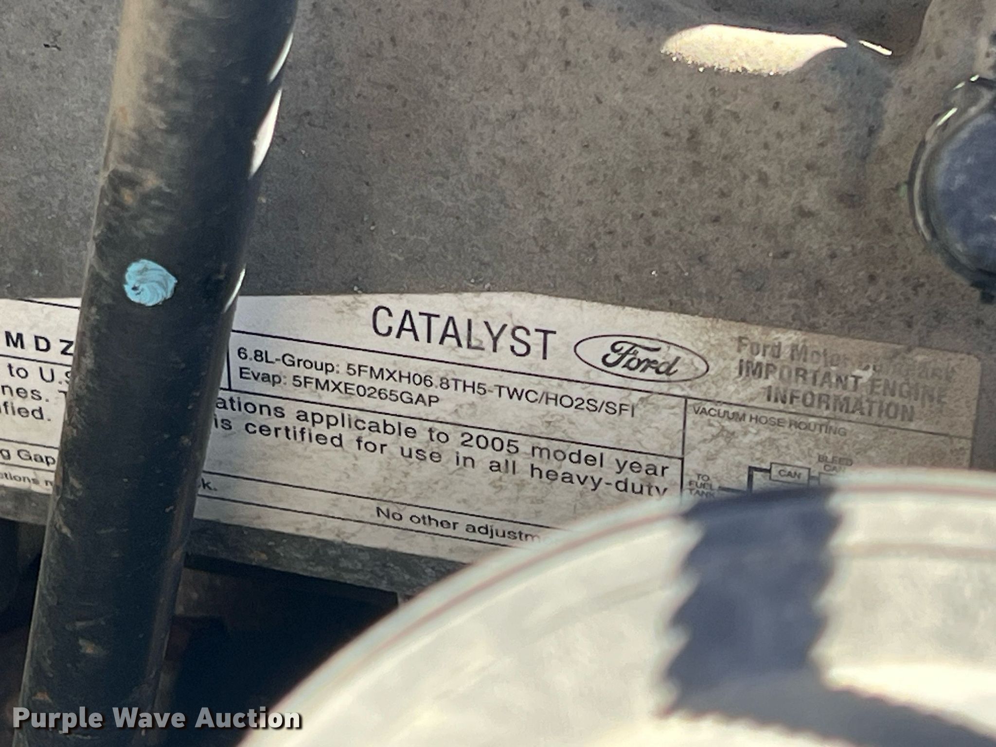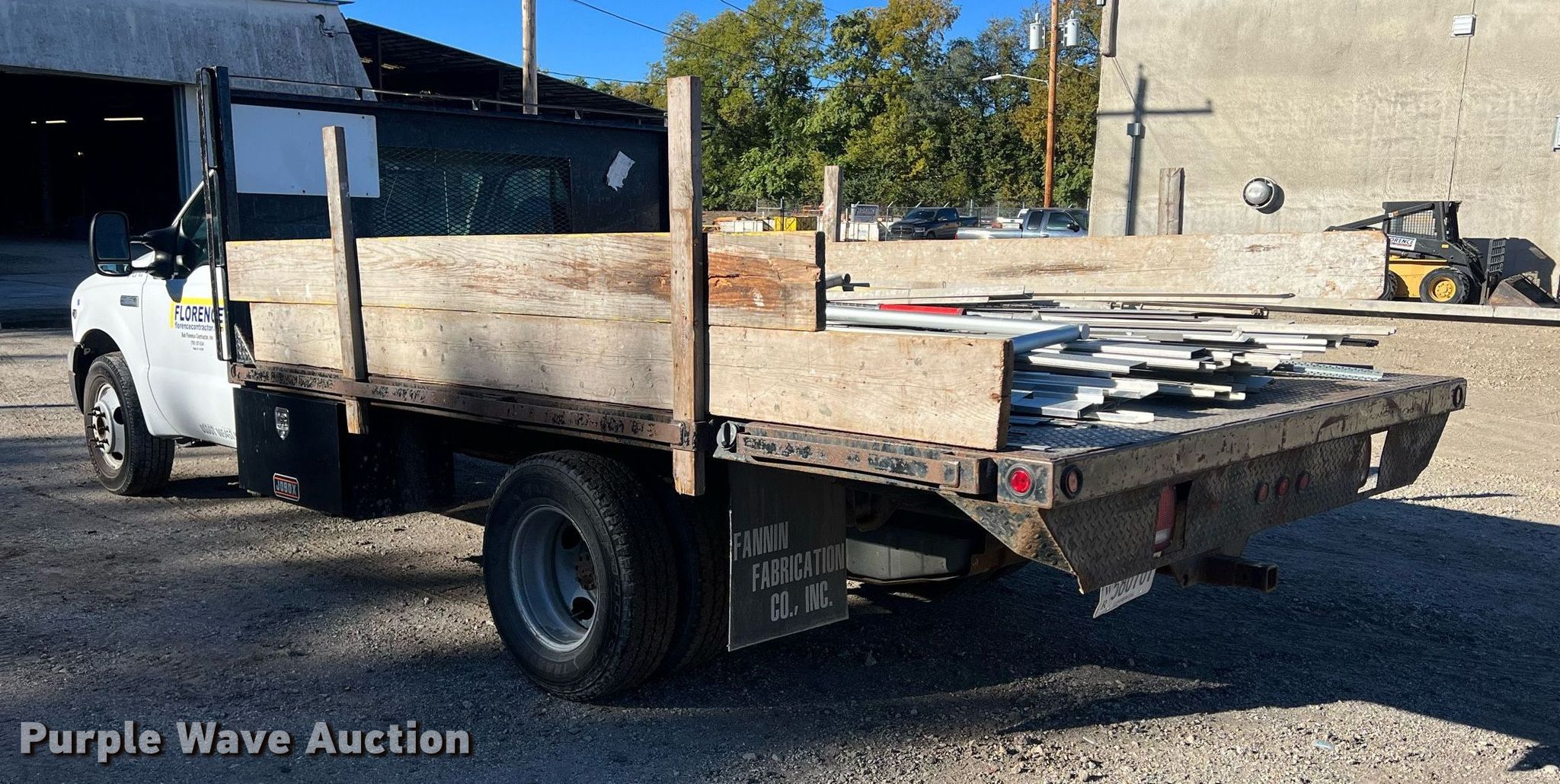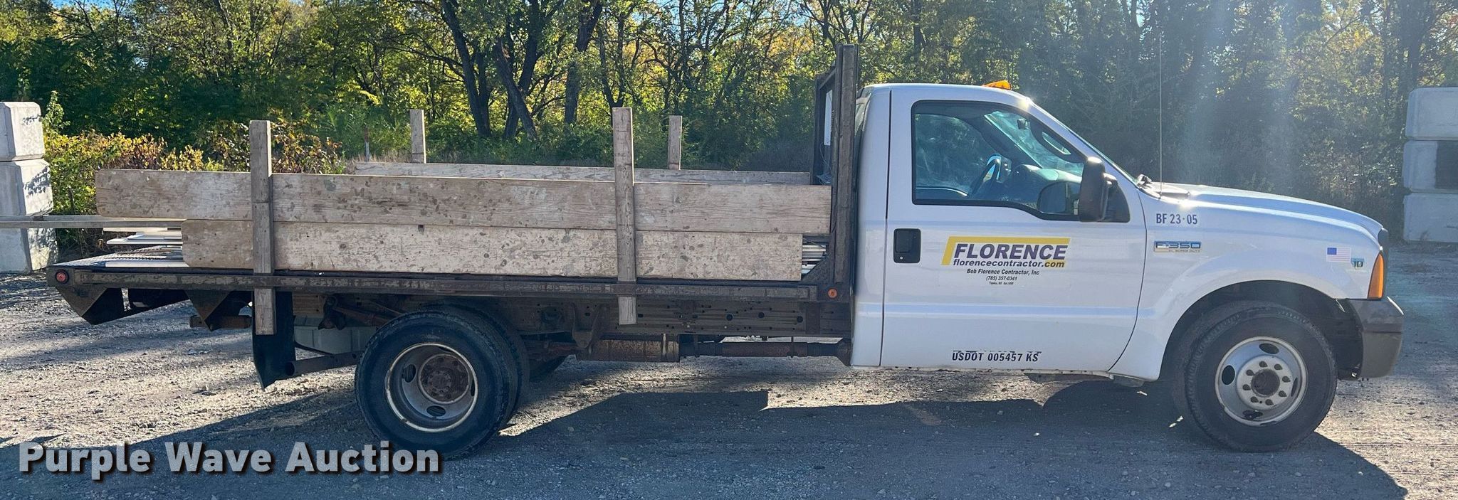 2005 Ford F350 flatbed pickup truck. Miles: 85,101 on odometer, VIN: 1FDWF36Y75EA52836. Engine Displacement: 6.8L V10 SOHC, Cylinders: 10, Fuel type: Gas. Transmission Automatic. Interior AC, Heat. Features Flatbed 13' L x 8' W. Tires Size: LT245/75R17. Notes Contents not included, Dash warning indicator: Check engine. Kansas title. Title distribution may be delayed up to 14 days from verification of funds. Bob Florence Contractor, Inc.. 1934 South Kansas Avenue. Topeka, KS 66612