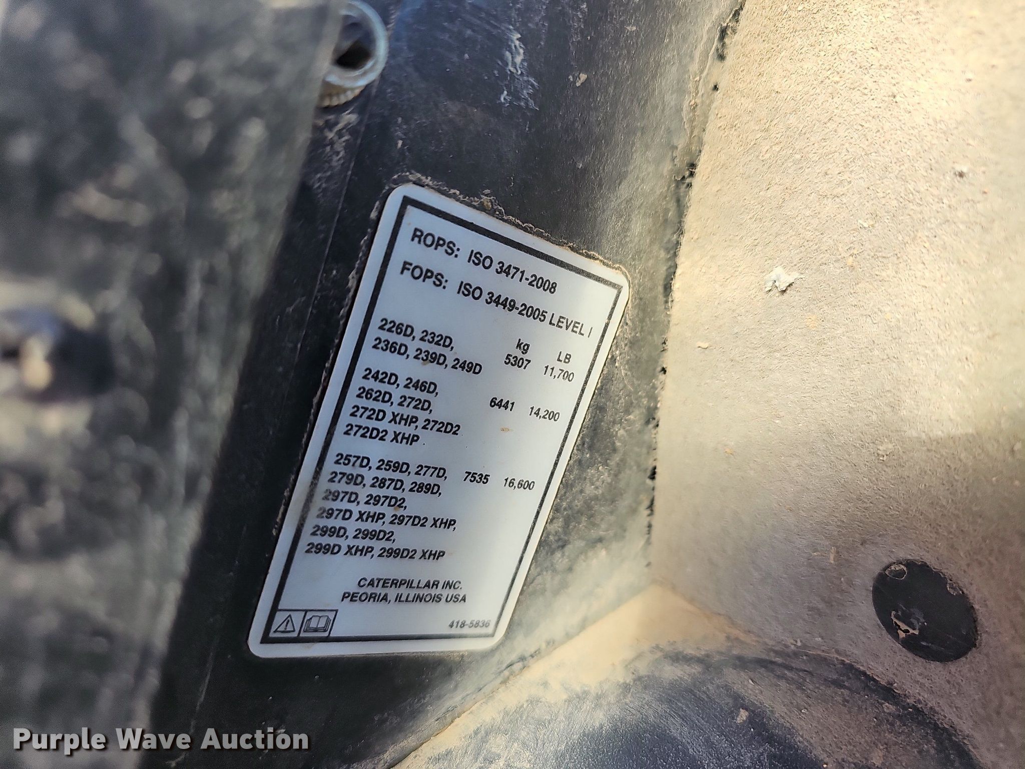 2019 Caterpillar 259D tracked skid steer loader. Hours: 4,078 on meter, Serial: CAT0259DHFTL21954, Unit #: 46-278. Engine Caterpillar C3 3B, Displacement: 3.3L, Cylinders: 4, Fuel type: Diesel, Kw: 54.6. Transmission Hydrostatic, Two speed travel. Operators station Enclosed cab, AC, Heat, Bucket control: Hand, Electronic Monitoring System panel. Features Auxiliary hydraulics, Auxiliary electrical outlet, Quick coupler: Hydraulic, Bucket Caterpillar, Width: 85", Cutting edge: Bolt-on. Tracks Width: 16". Notes Missing door , Engine issues. Emery Sapp & Sons, Inc.. 5350 E State Hwy AA. Springfield, MO 65803