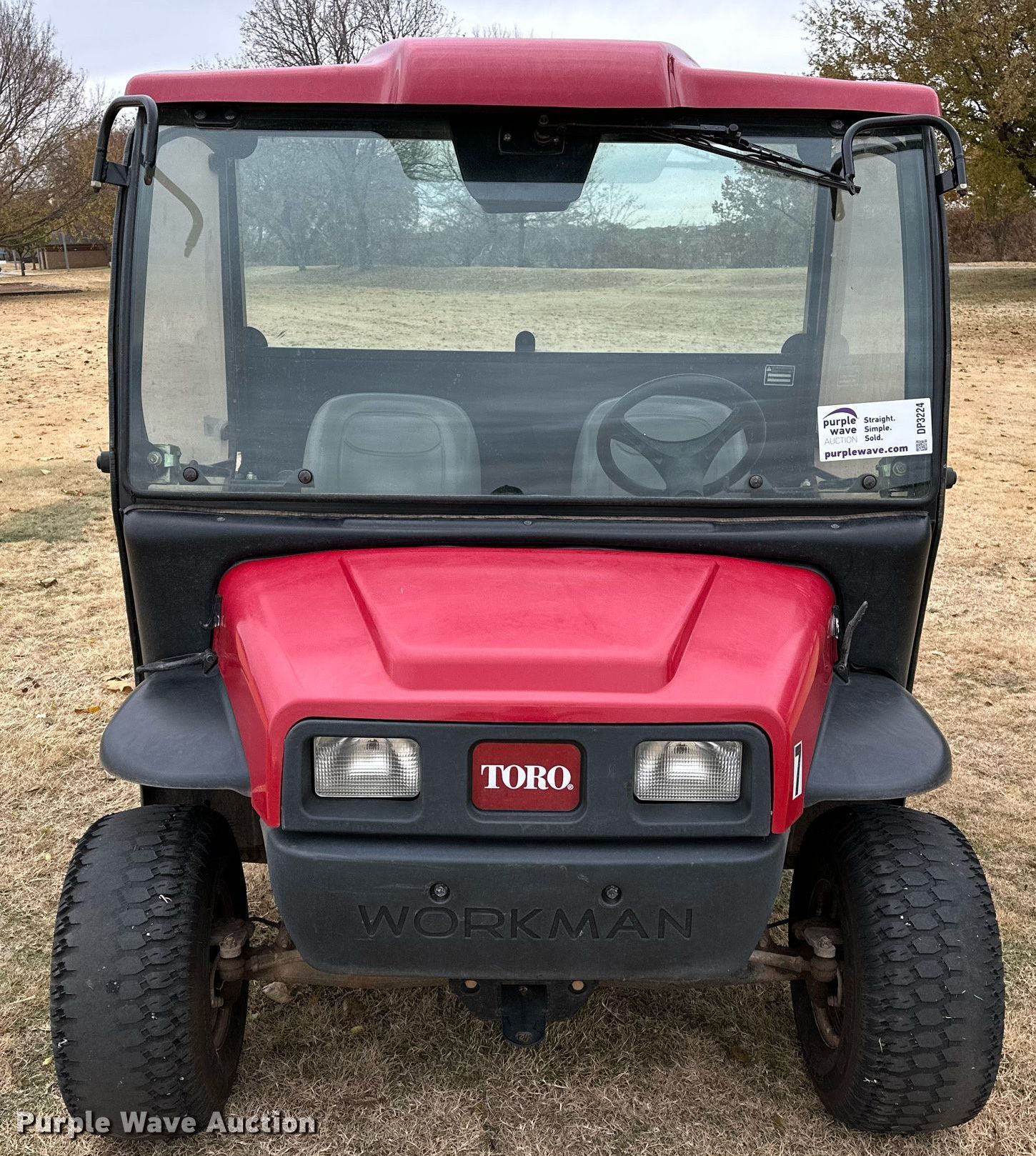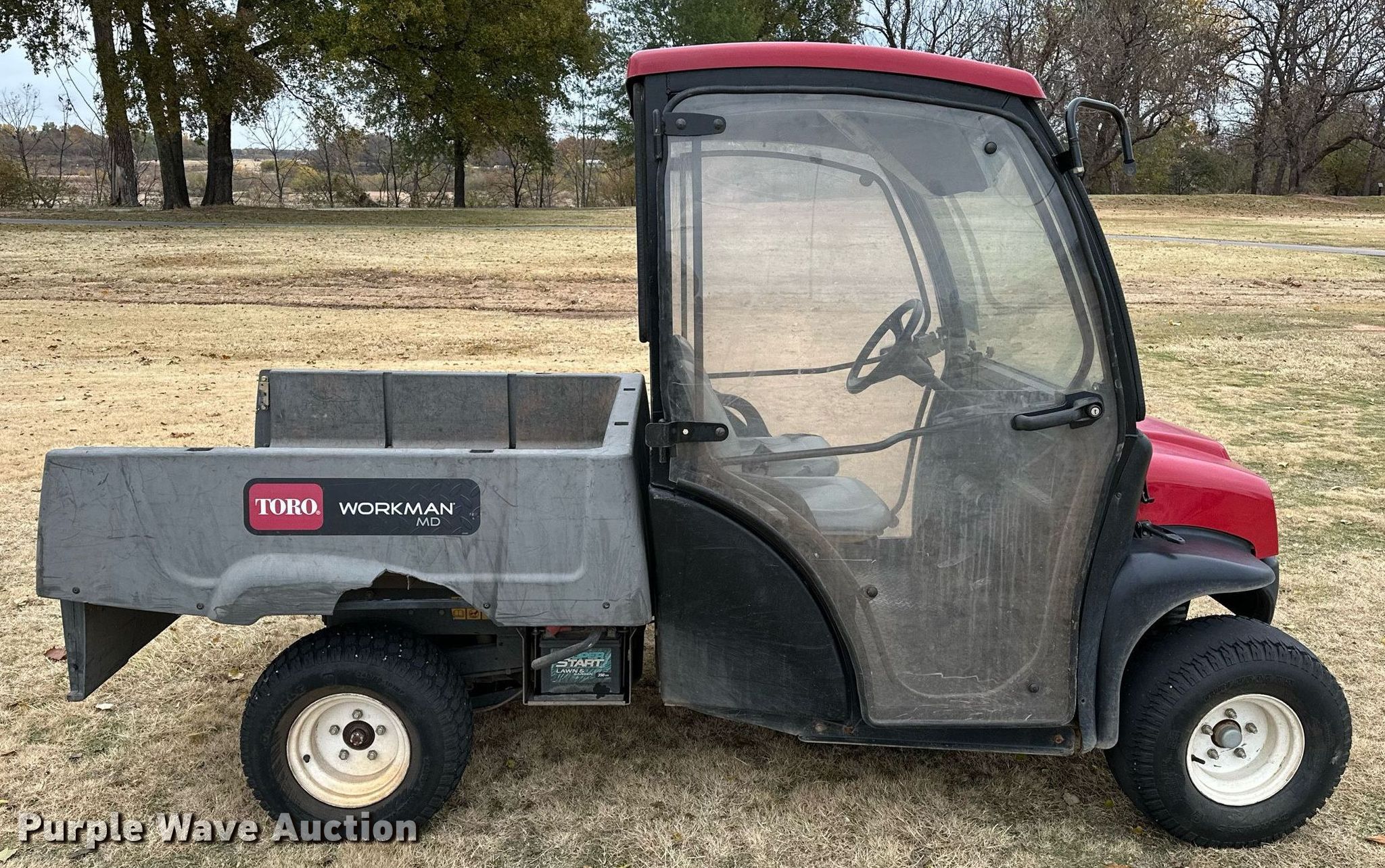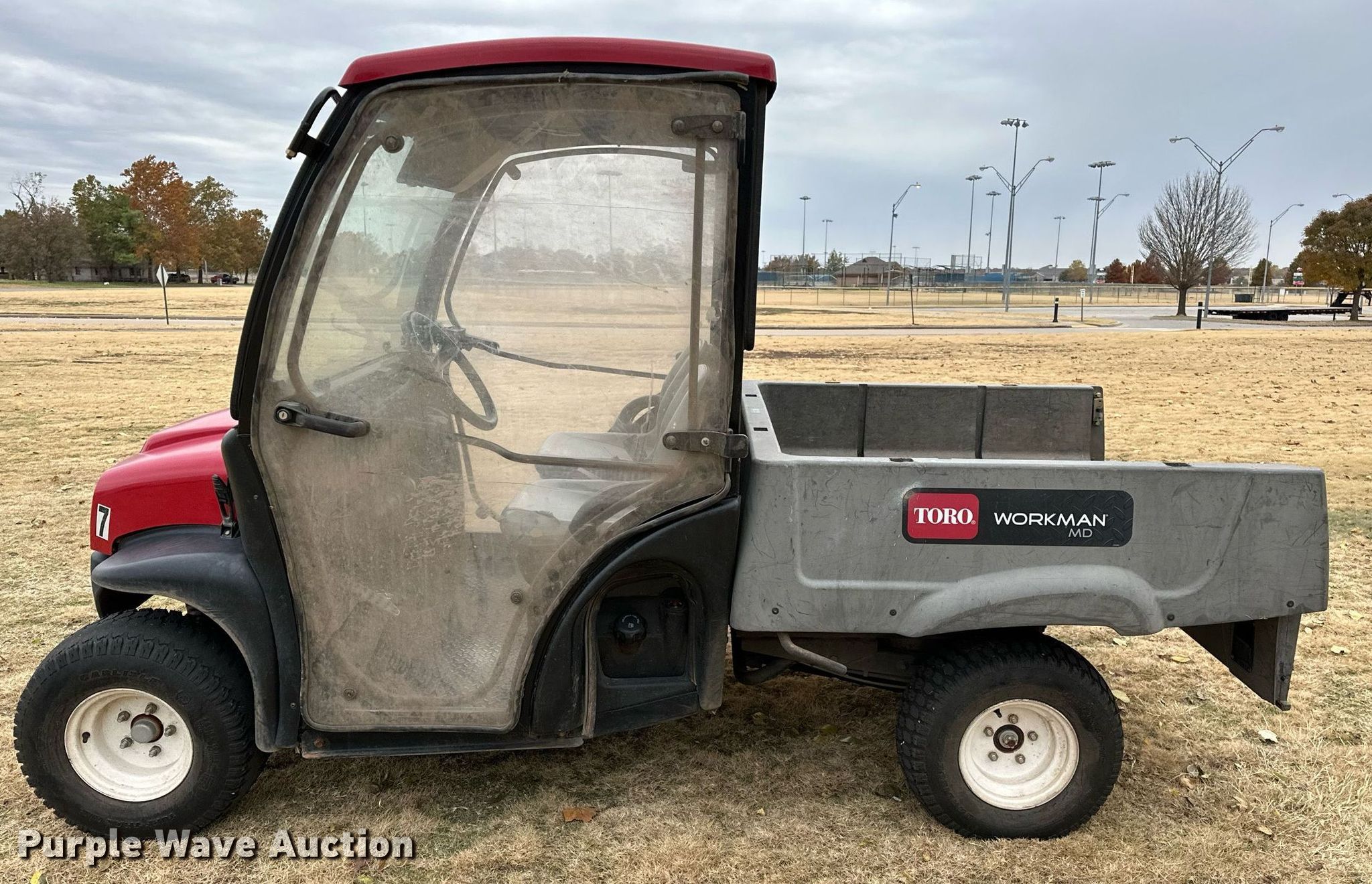 2012 Toro Workman MD utility vehicle. Hours: 1,685 on meter, Serial: 312000529. Engine Cylinders: 1, Fuel type: Gas. Transmission CVT. Operators station Enclosed cab. Features Dump bed 45" L x 50" W, Dump bed type: Manual. Tires Size: 240/60-10. Notes Tire issues, front tires need replaced. Transfer of ownership documentation will be a bill of sale. 8505 East 148th Street South. Bixby, OK 74008