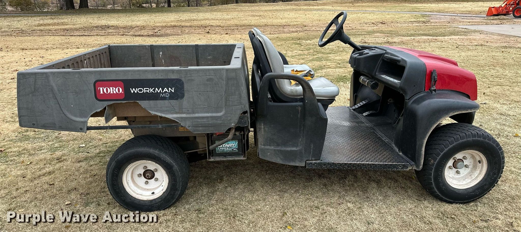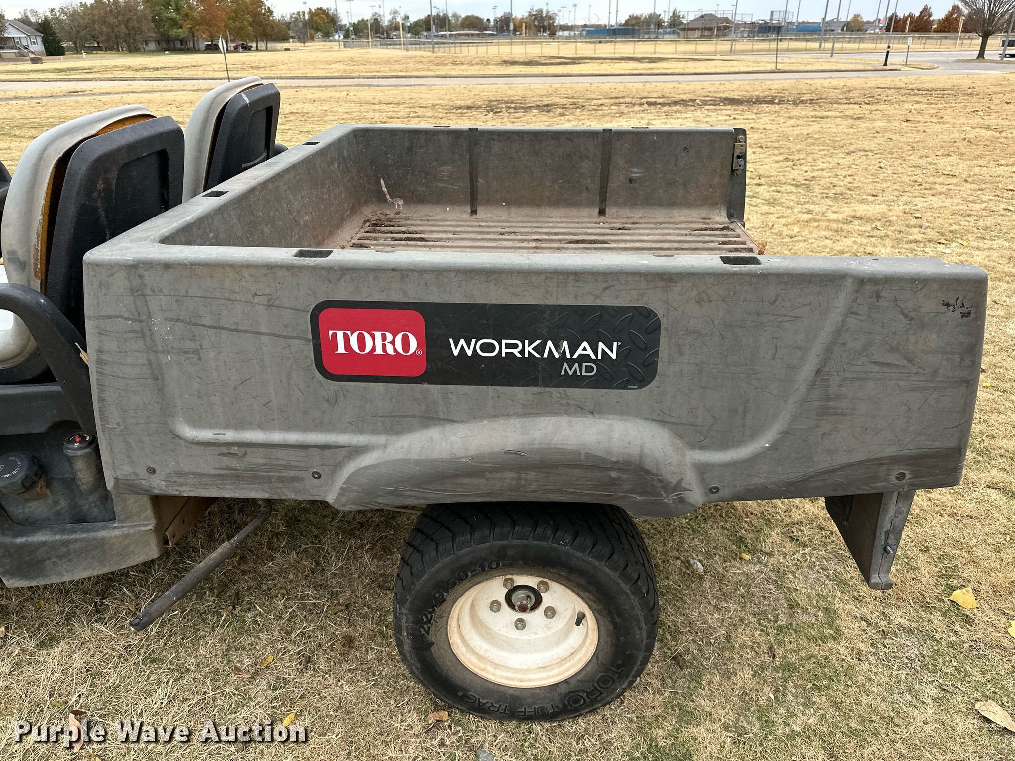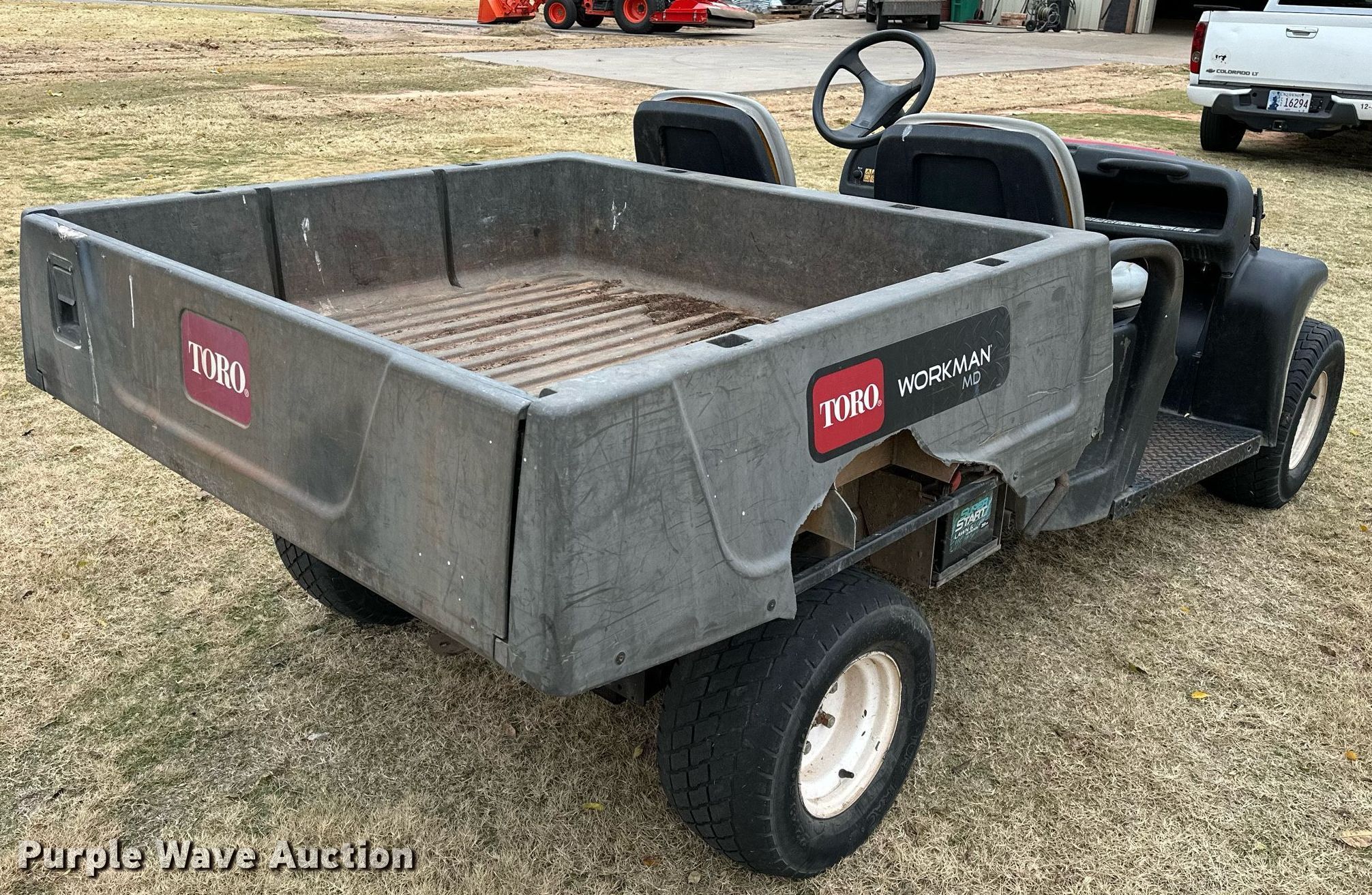 2012 Toro Workman MD utility vehicle. Hours: 1,678 on meter, Serial: 31200547. Engine Cylinders: 1, Fuel type: Gas. Transmission CVT. Features Receiver hitch, Dump bed 45" L x 50" W, Dump bed type: Electric/ Hydraulic. Tires Front: 22x9.50-10. Transfer of ownership documentation will be a bill of sale. 8505 East 148th Street South. Bixby, OK 74008