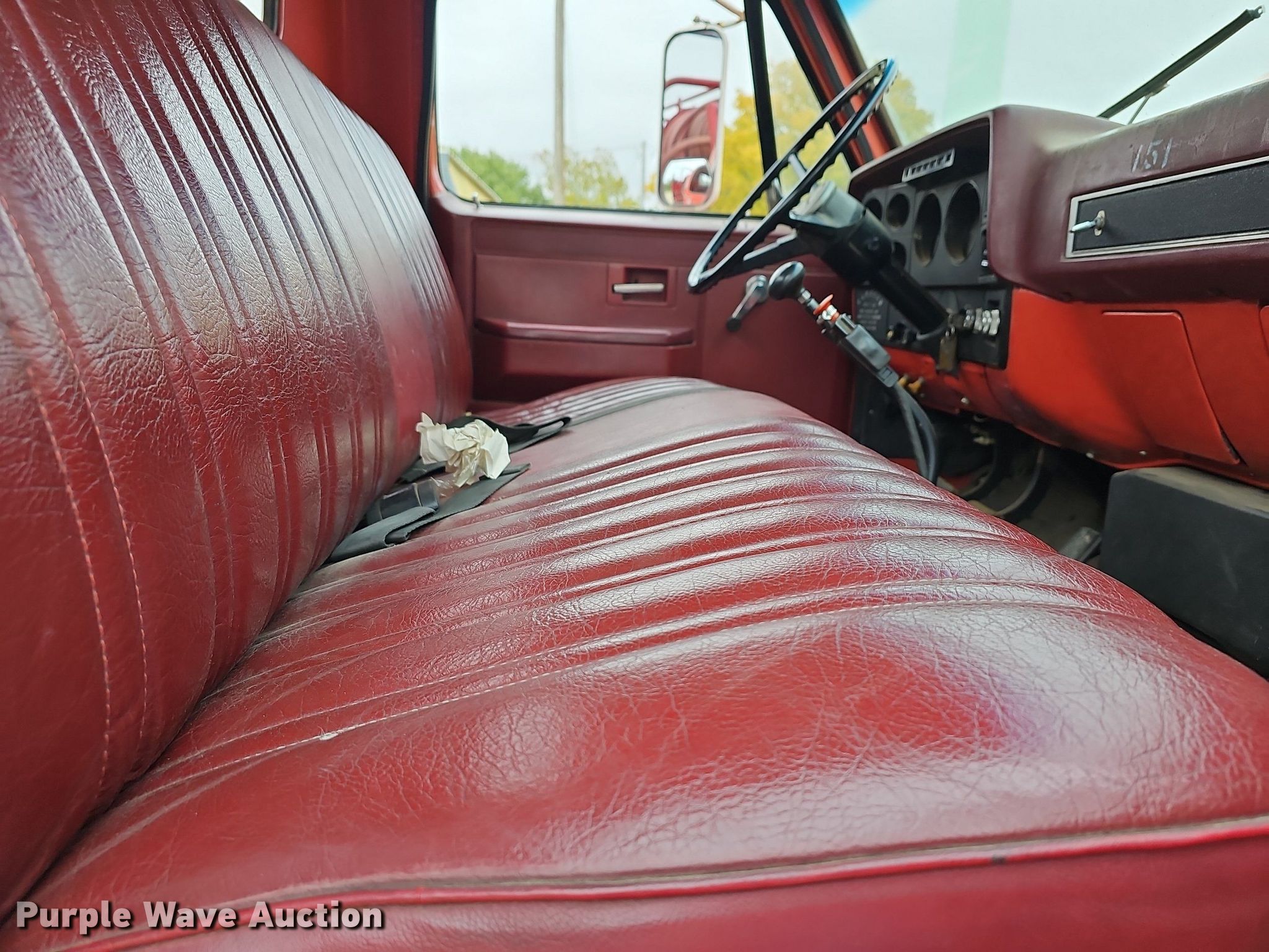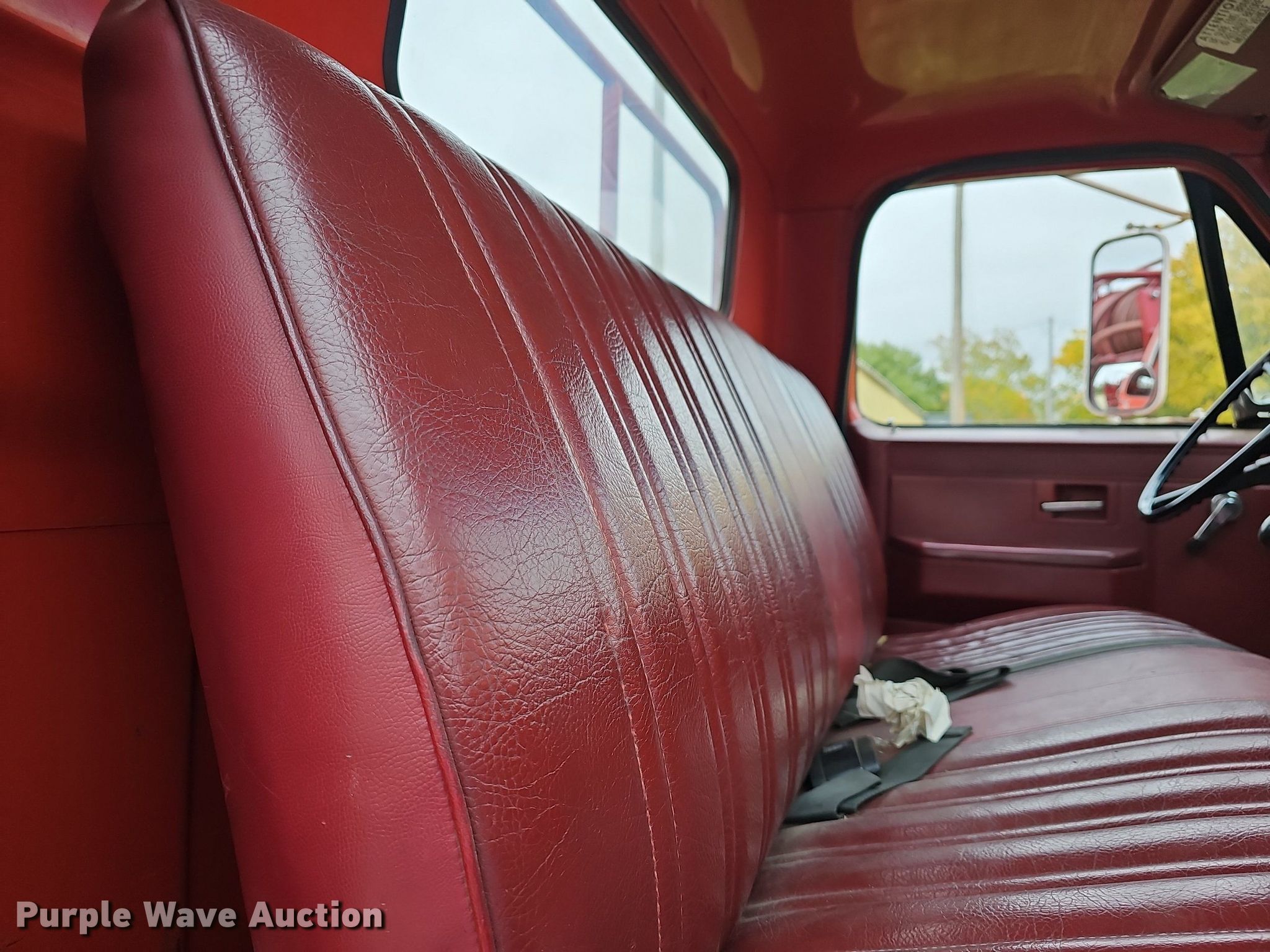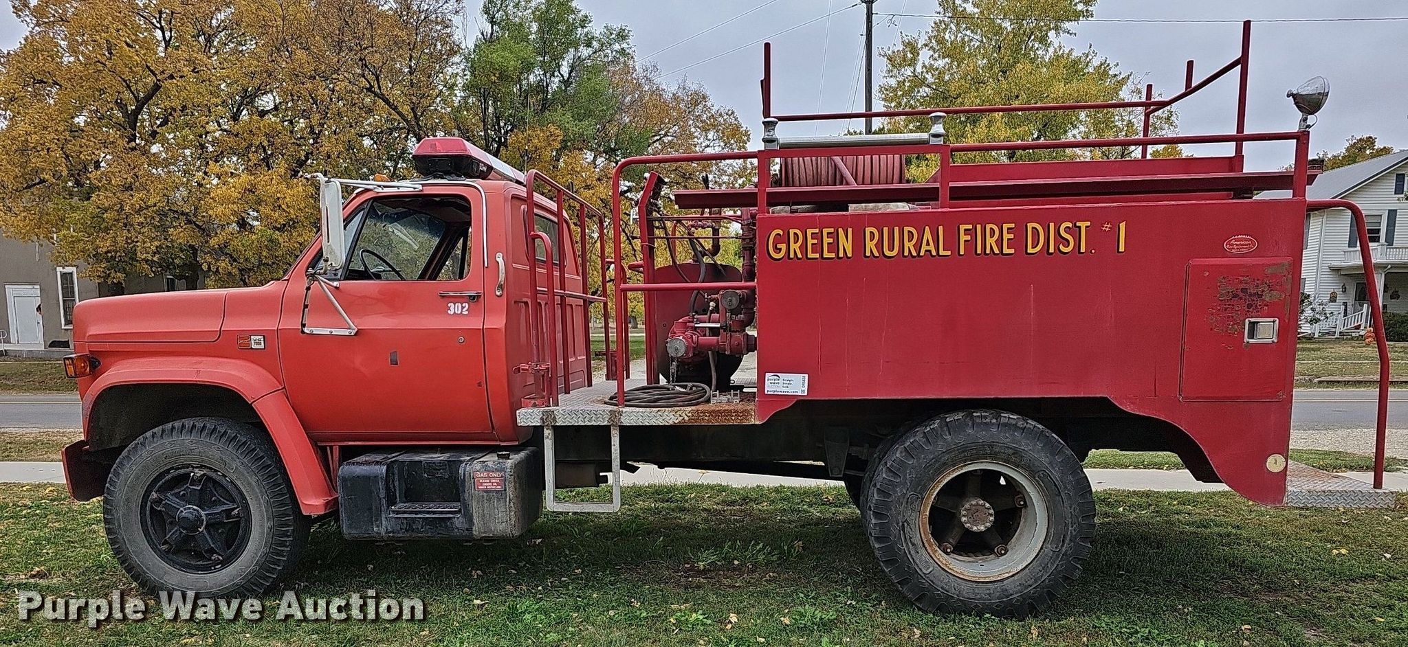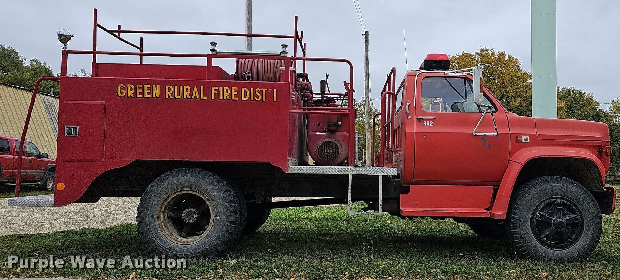 1982 GMC 7000 fire truck. Miles: 80,196 on odometer, VIN: 1GDL7D1B7CV588501, Unit #: 302. Engine GMC, Displacement: 6.0L, Fuel type: Gas. Transmission Manual, Speed: 10. Chassis Axles: Single, Suspension: Spring, Brakes: Hydraulic, GVWR: 27,500 lbs, Wheelbase: 157". Interior Heat. Features Fire truck body Pump, Hose Hose length: 150', Generator Wisconsin VM4D, Fuel type: Gas, Water tank 6'x 8'x 3', Capacity: Approx. 1000 gallons. Tires Rear: 10.00-20, Brand: Goodyear. Notes Brake issues, Possible engine issues. Kansas title. Title distribution may be delayed up to 14 days from verification of funds. Green, KS 67447